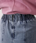 後ろゴム仕様なのでトップスをインしても腰回しがスッキリし、ハリのあるデニム素材は身体のラインが出にくく、綺麗なシルエットがキープされます。