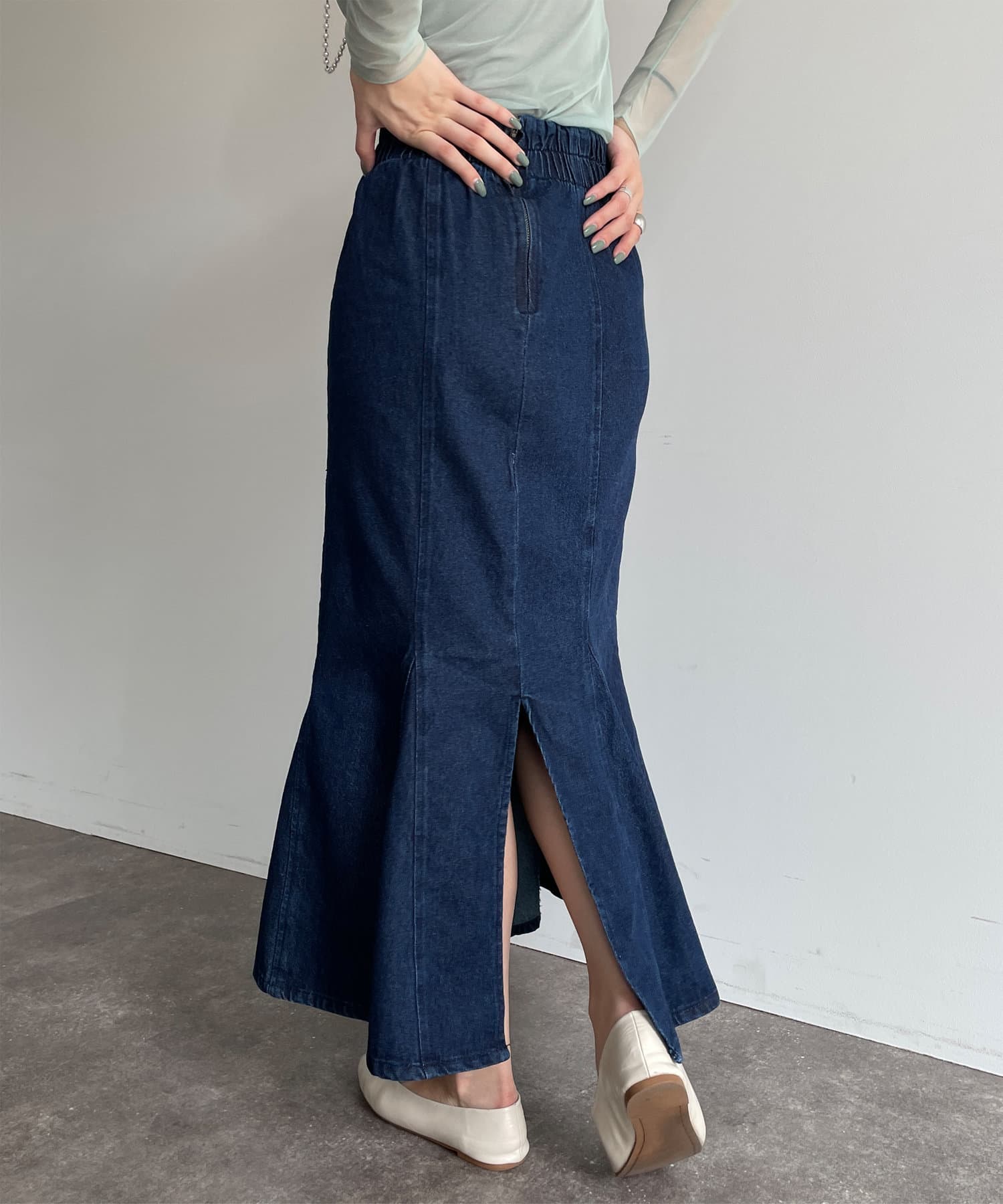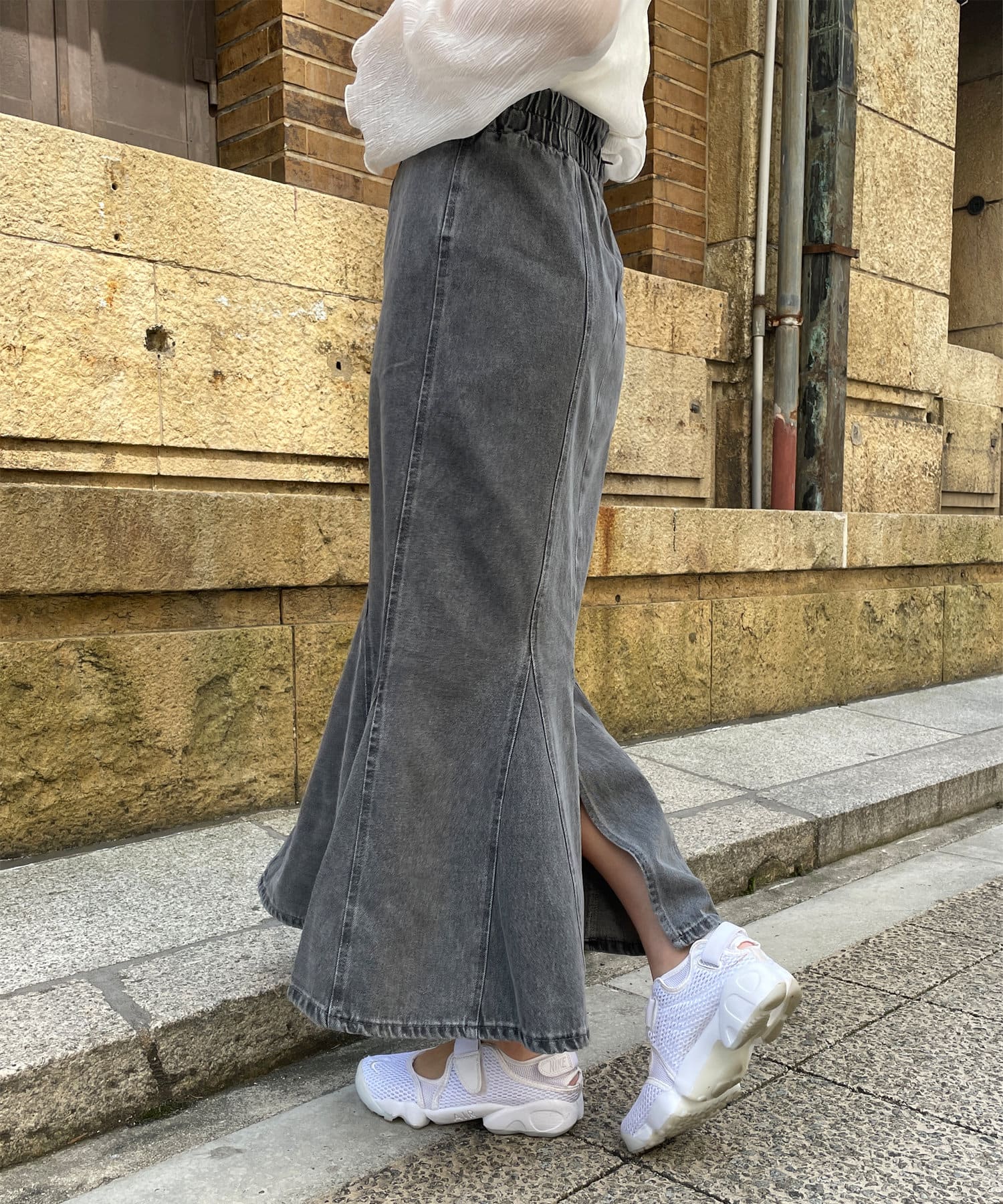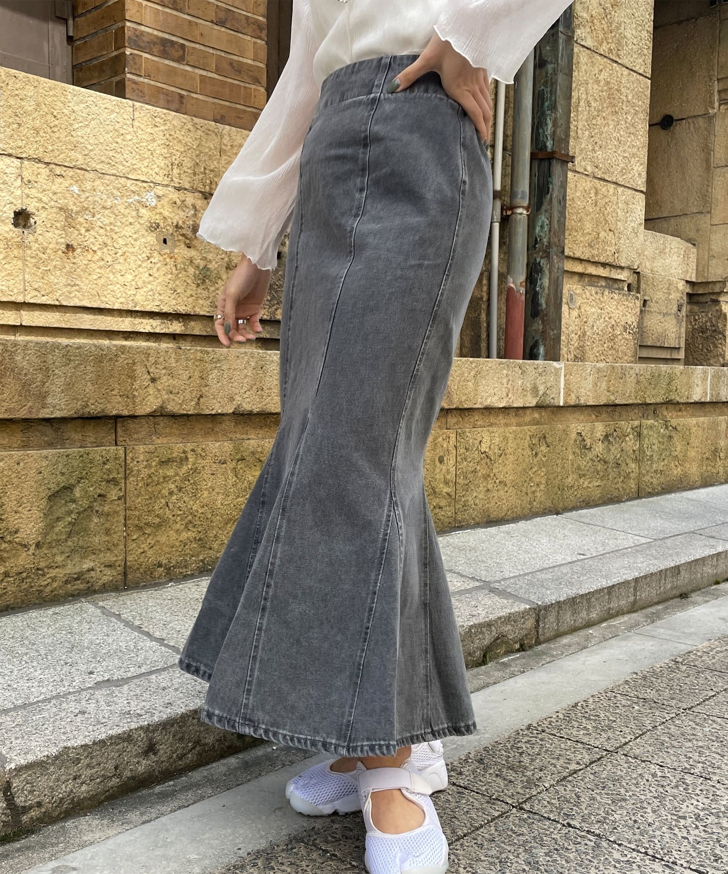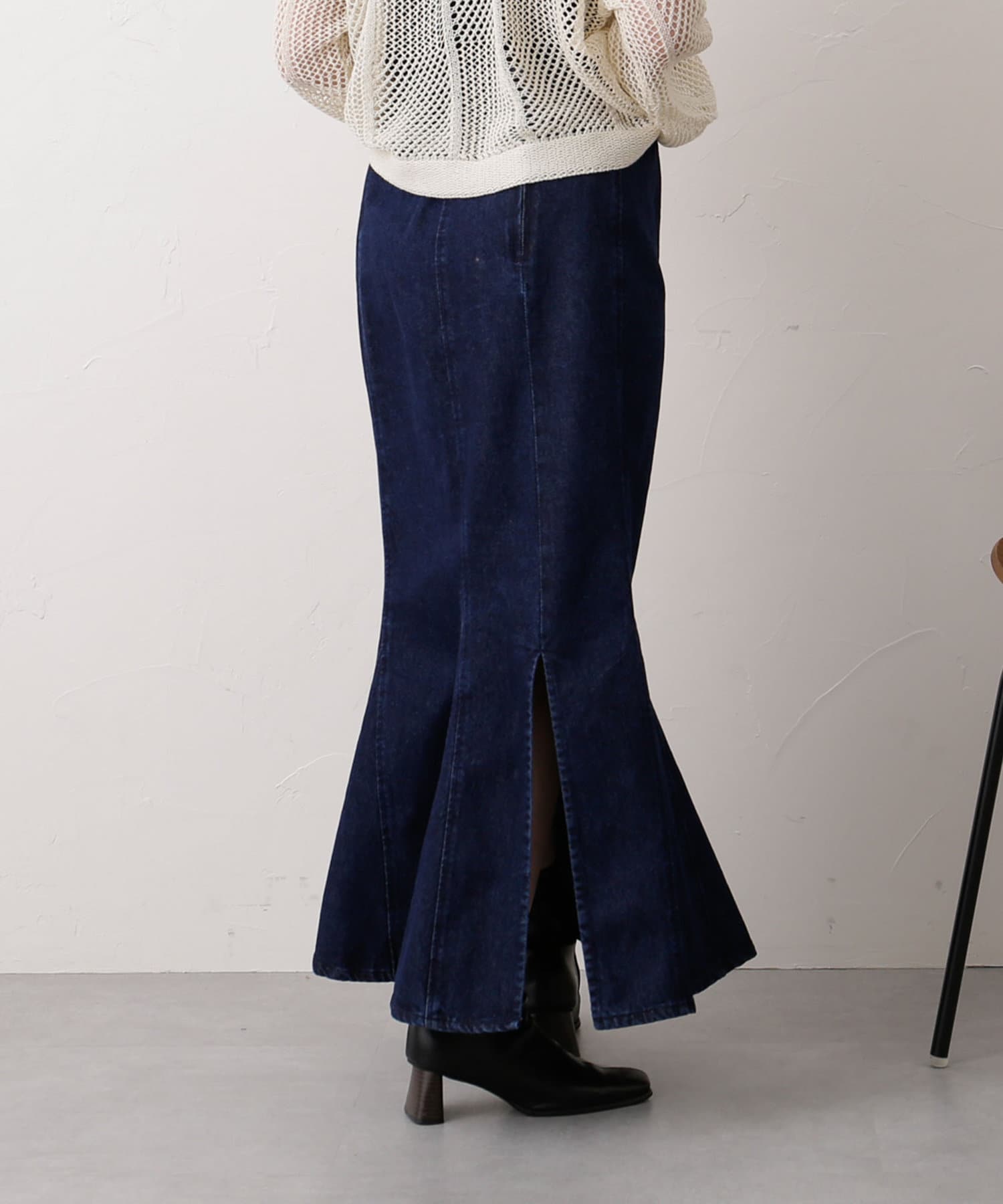 ・キレイめな印象のマーメイドスカートをデニム素材にすることで、カジュアルでも着まわせる万能アイテムに仕上げました。