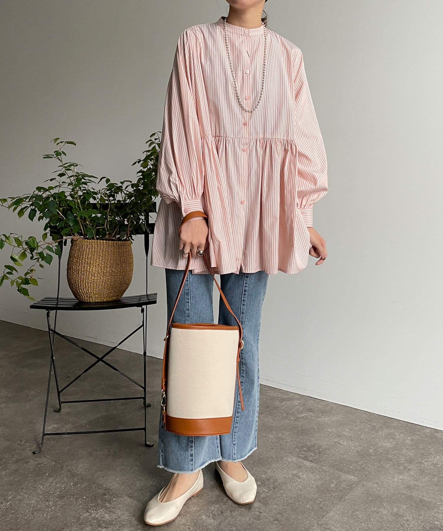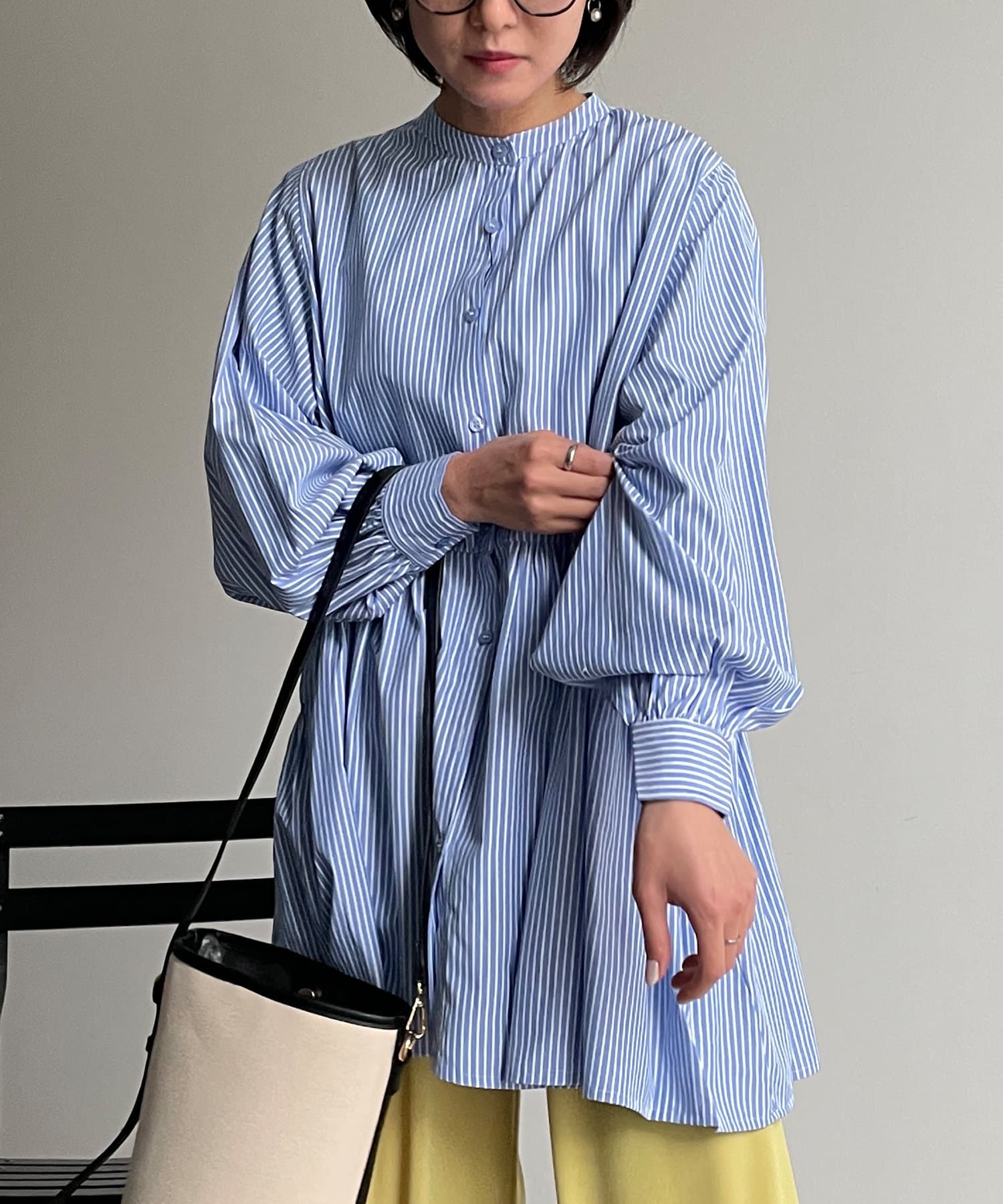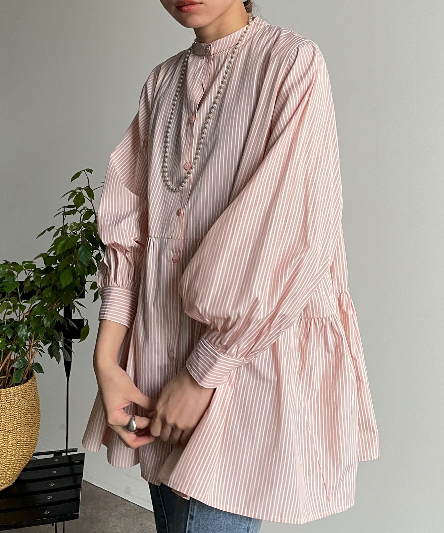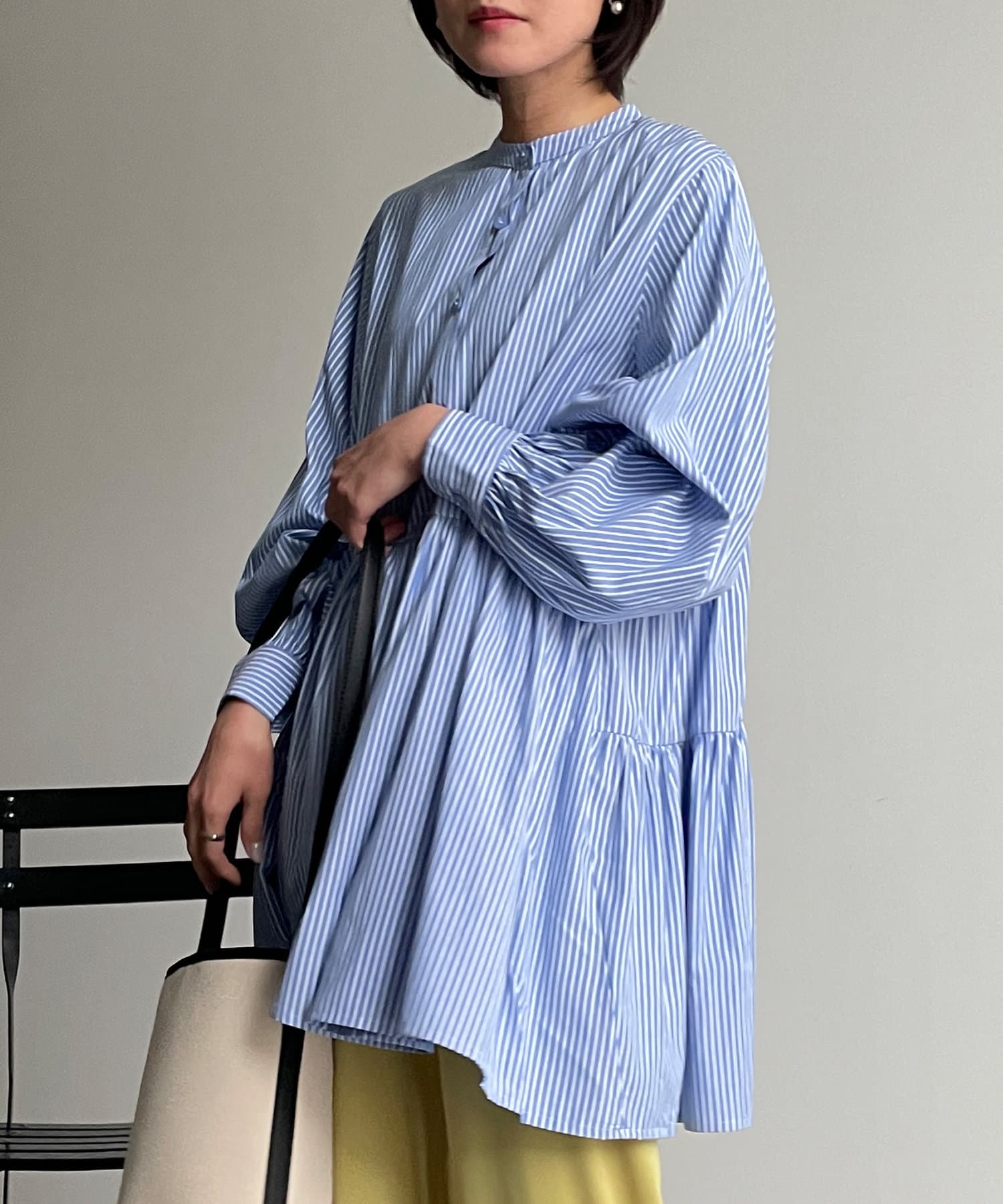・細ストライプでコーデに取り入れやすく、存在感のある主役級ブラウスです。