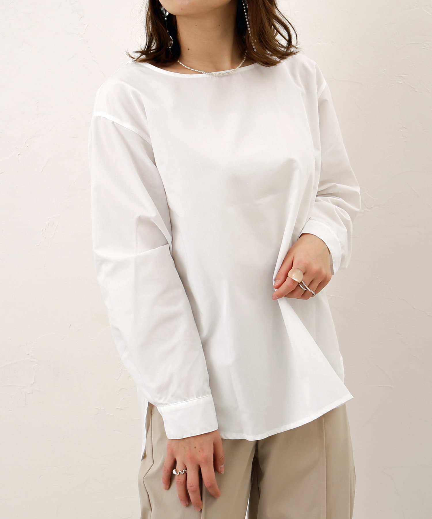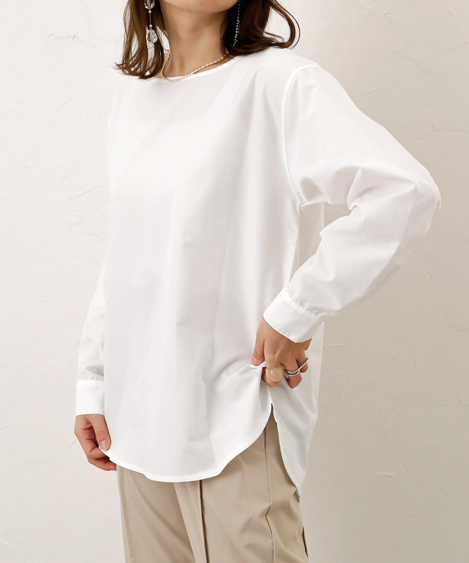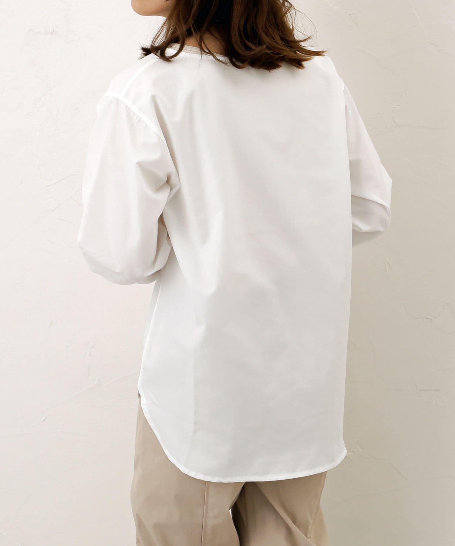 ・ヒップが隠れる長め丈のノーカラーブラウスは使い勝手抜群です。