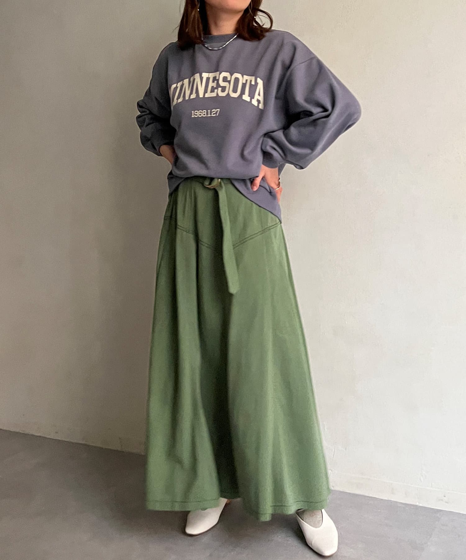 写真ではグレーっぽいですが、実際は綺麗なブルーグレーです。スカート、パンツ、どちらでも合わせやすいです。