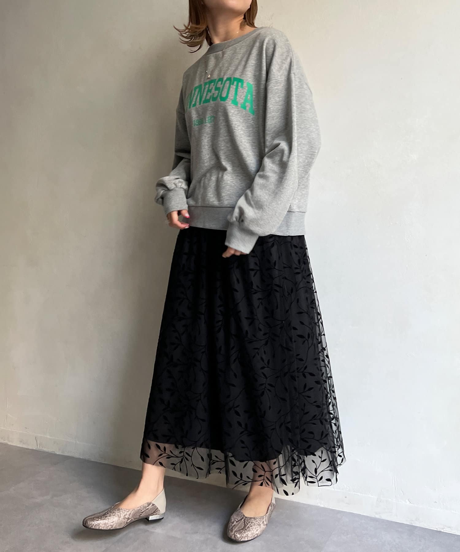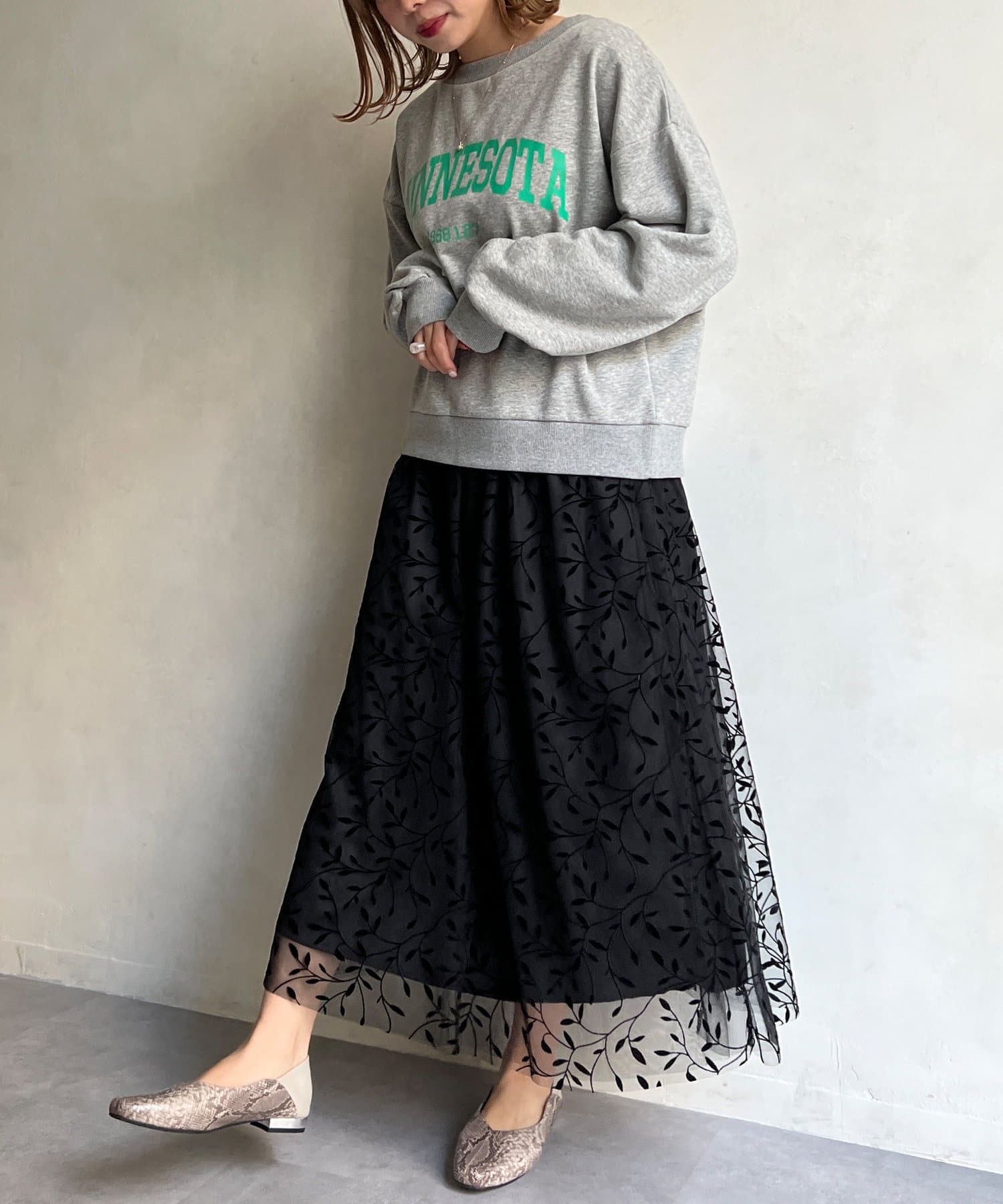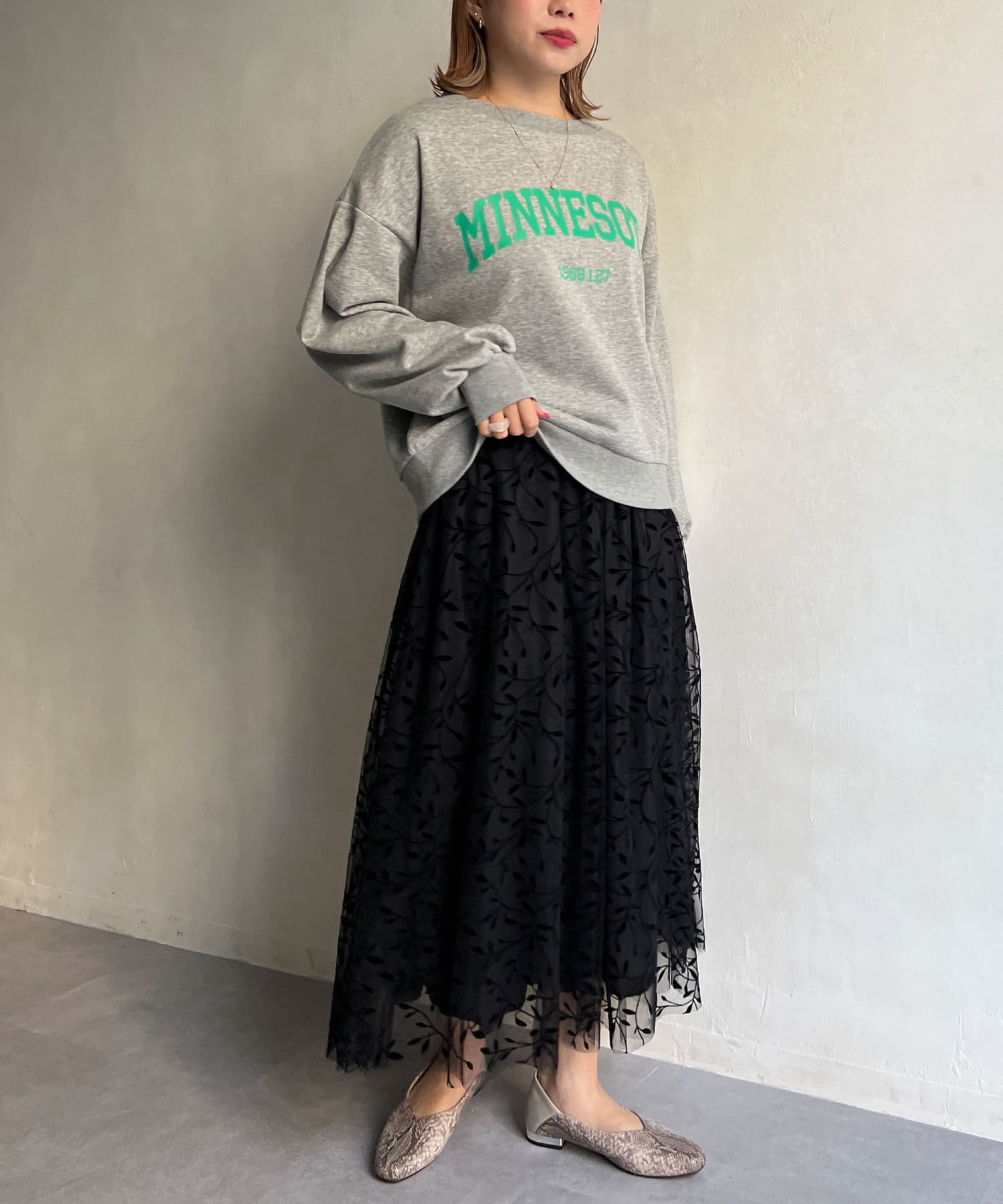 チュールスカートなど甘めのアイテムとミックスしたコーデが今っぽい仕上がりに。