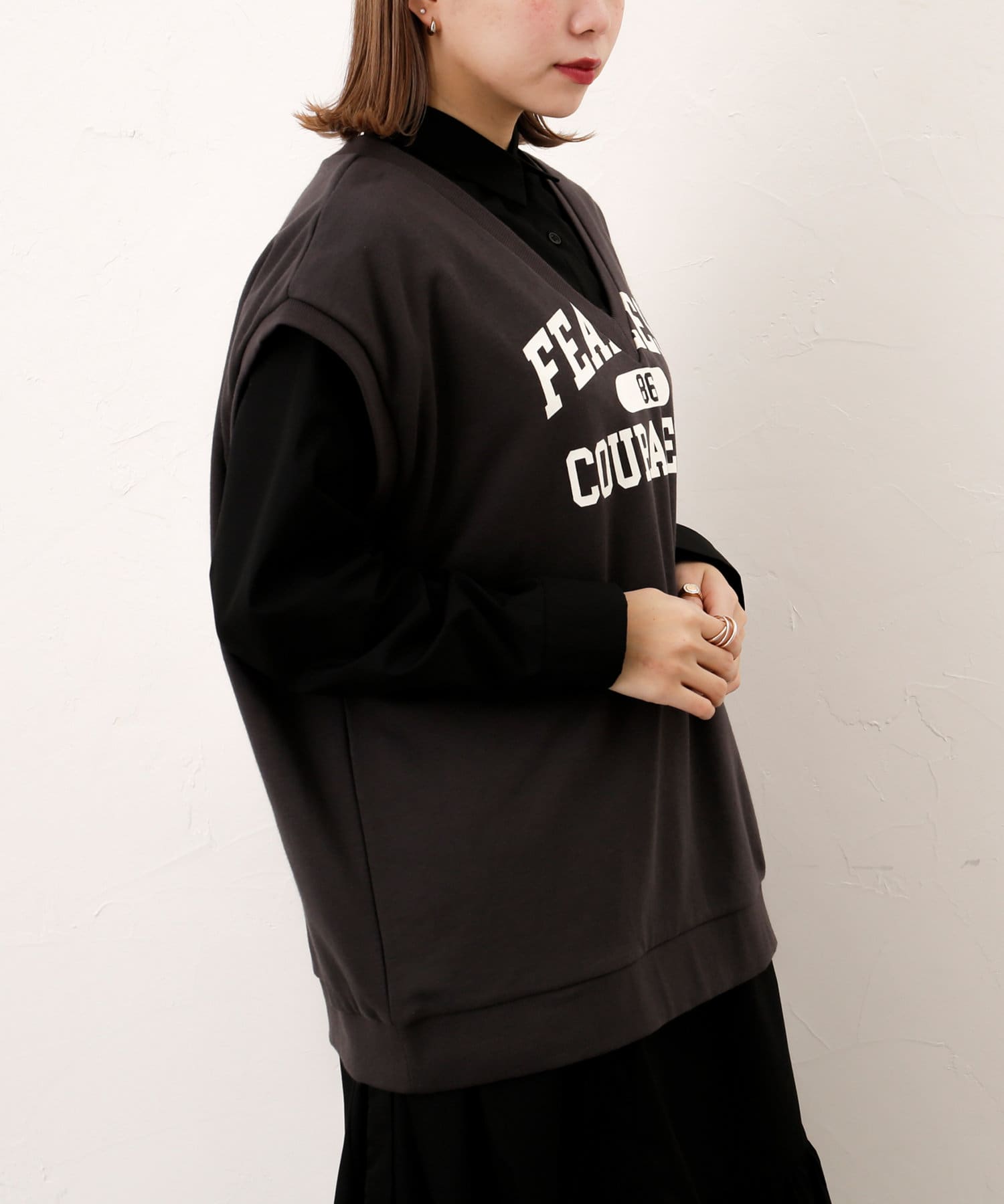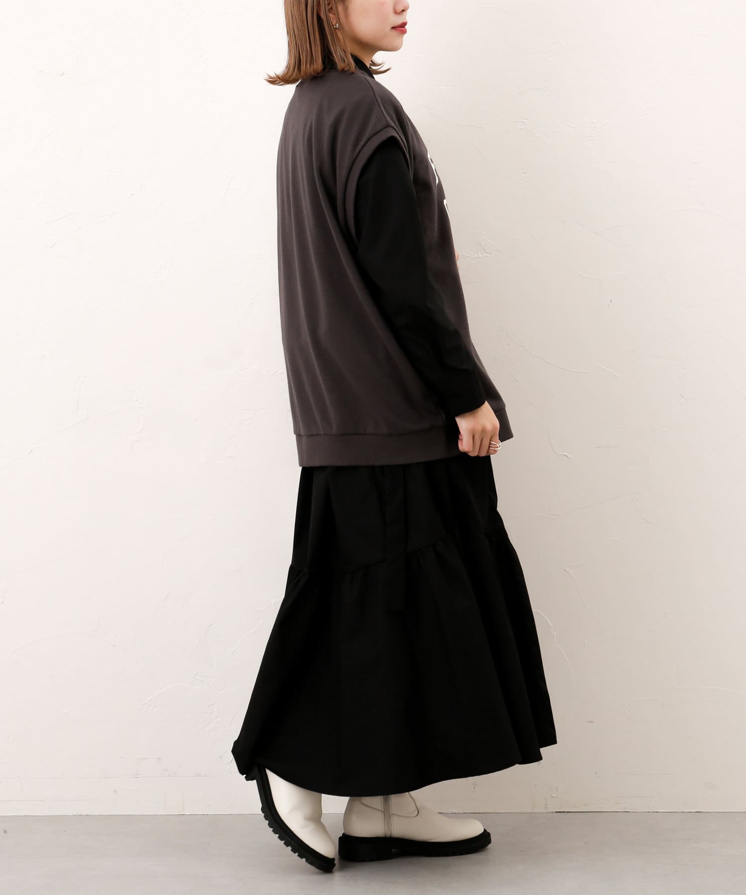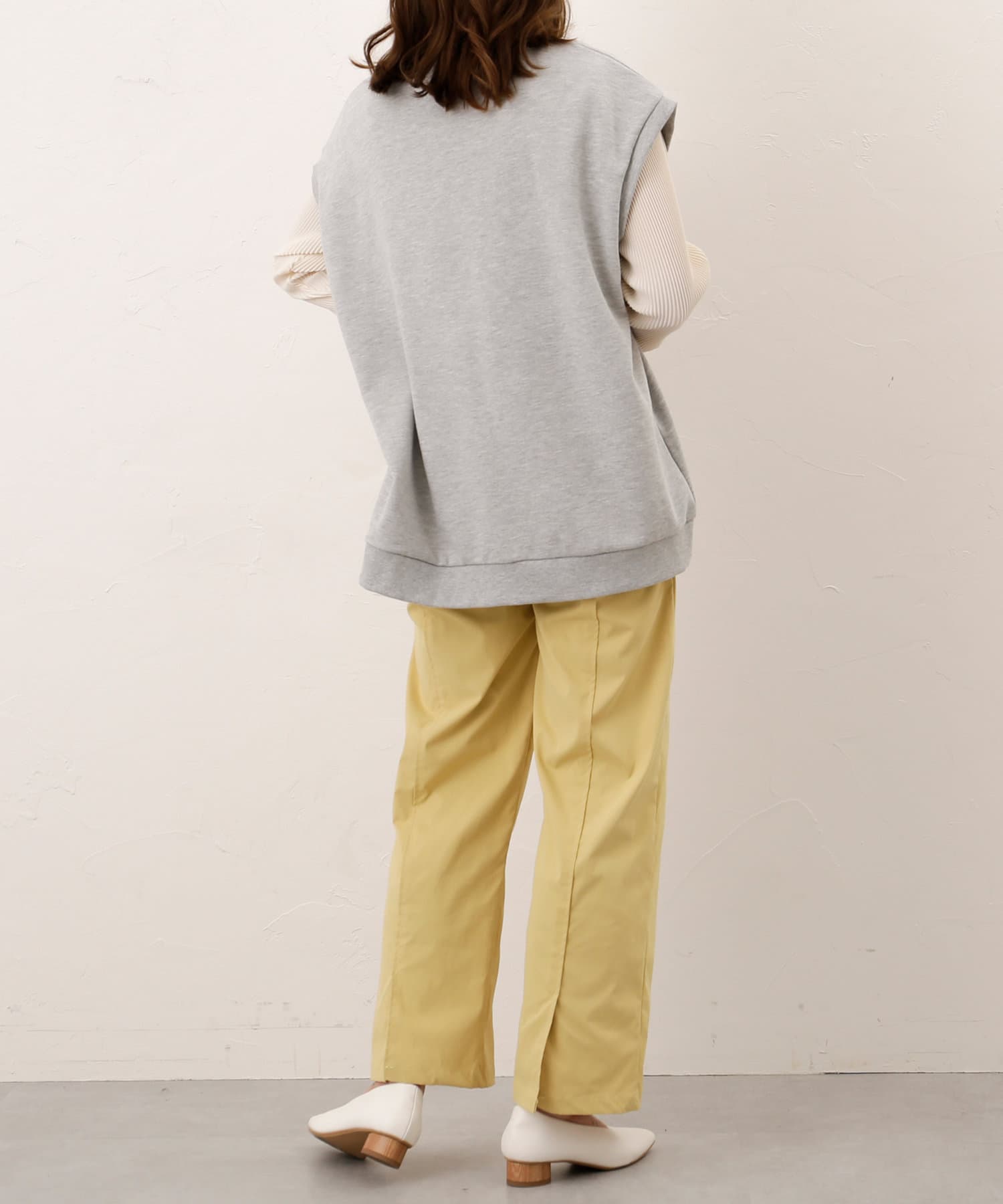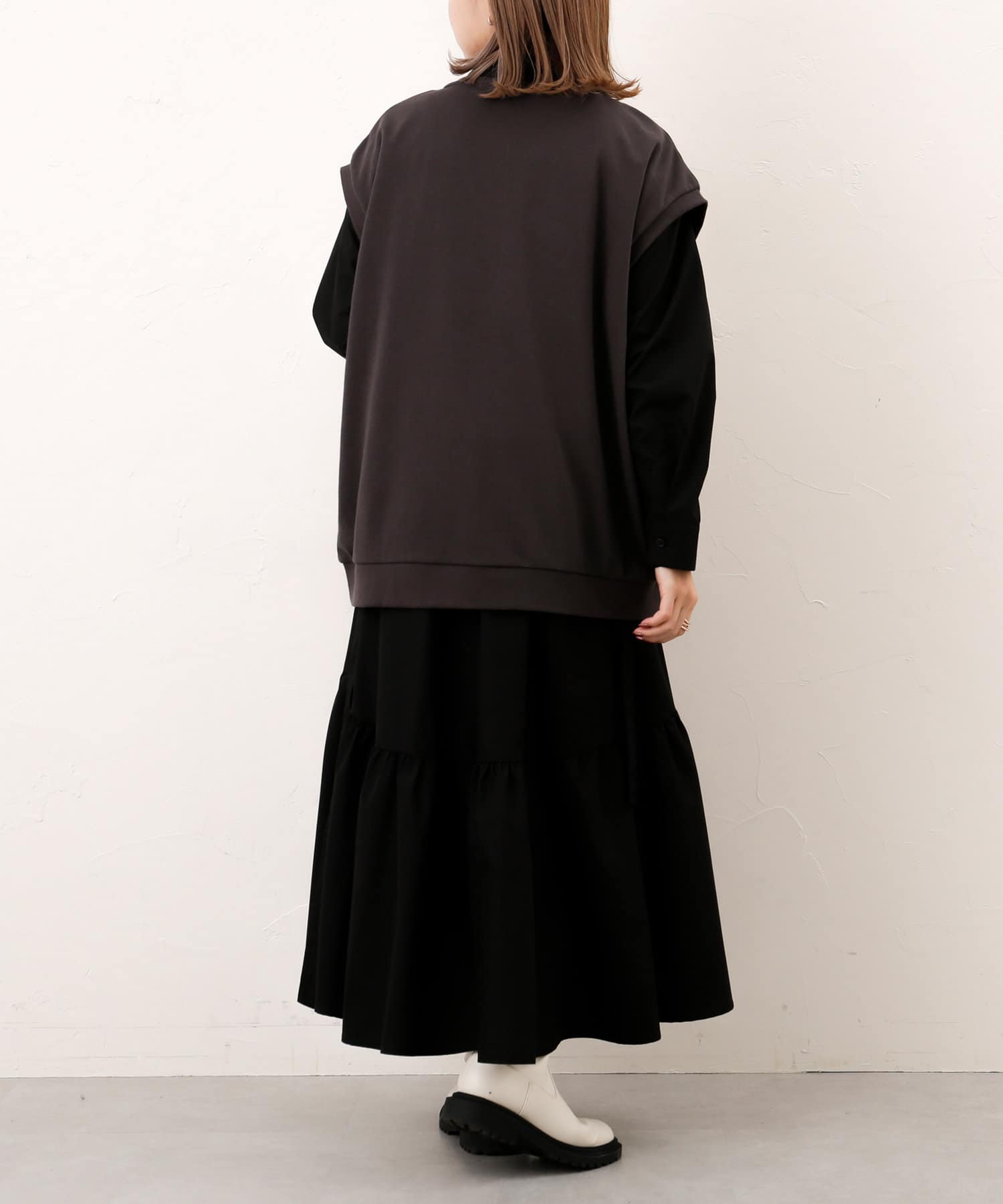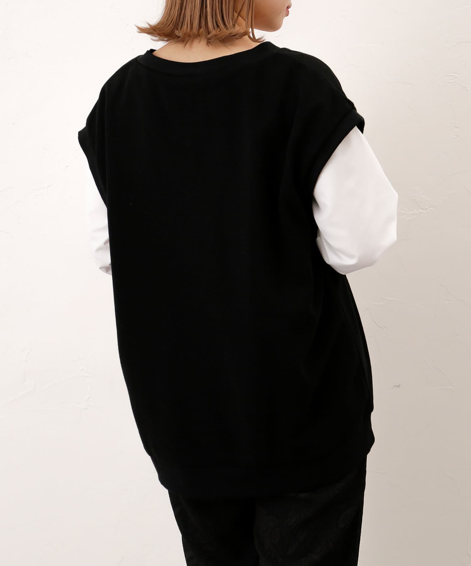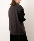 ゆとりがあるベストなので、オーバーサイズのカットソーや袖にデザインのあるシャツなど、半袖長袖問わず様々なトップスとレイヤードできます◎