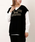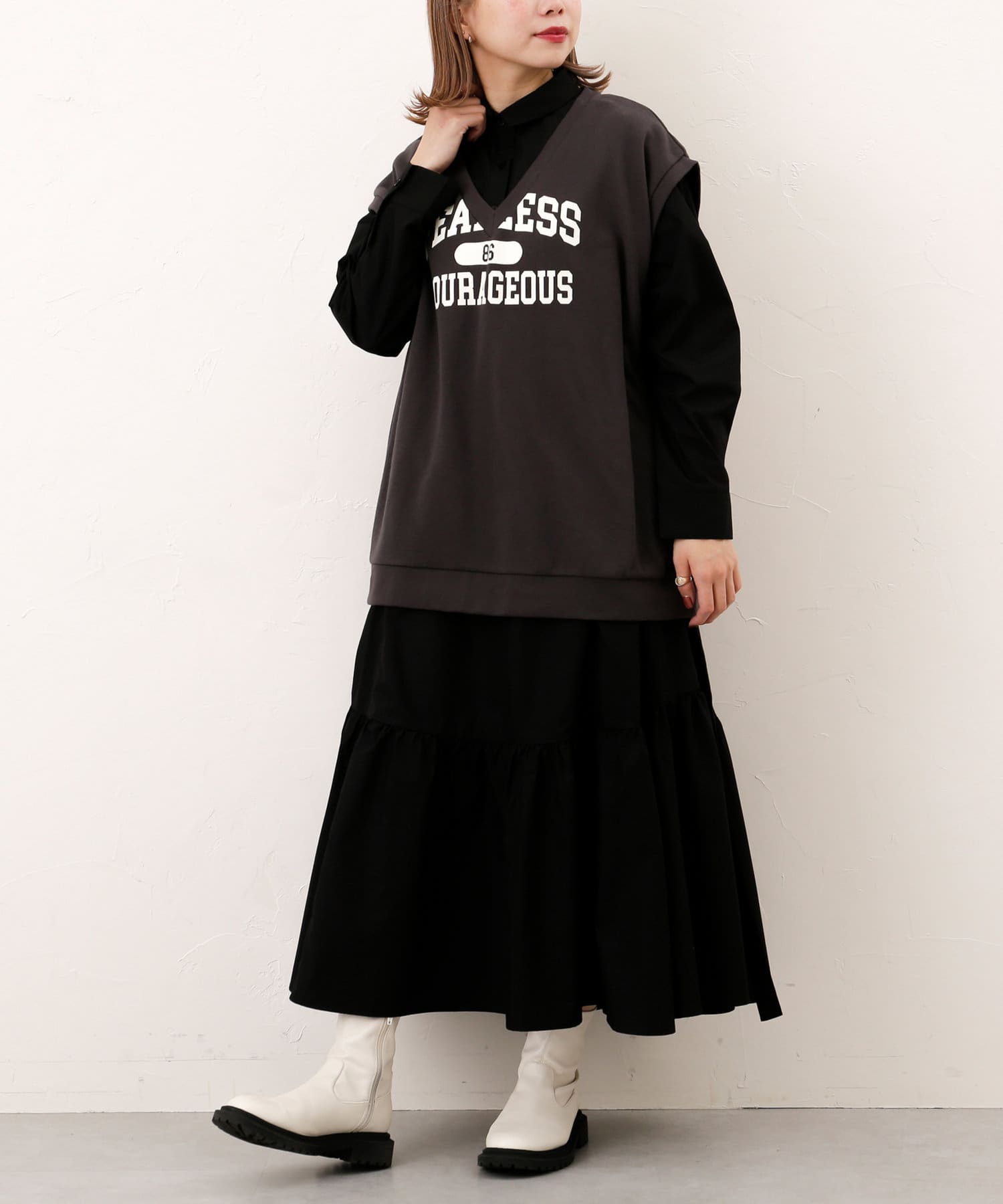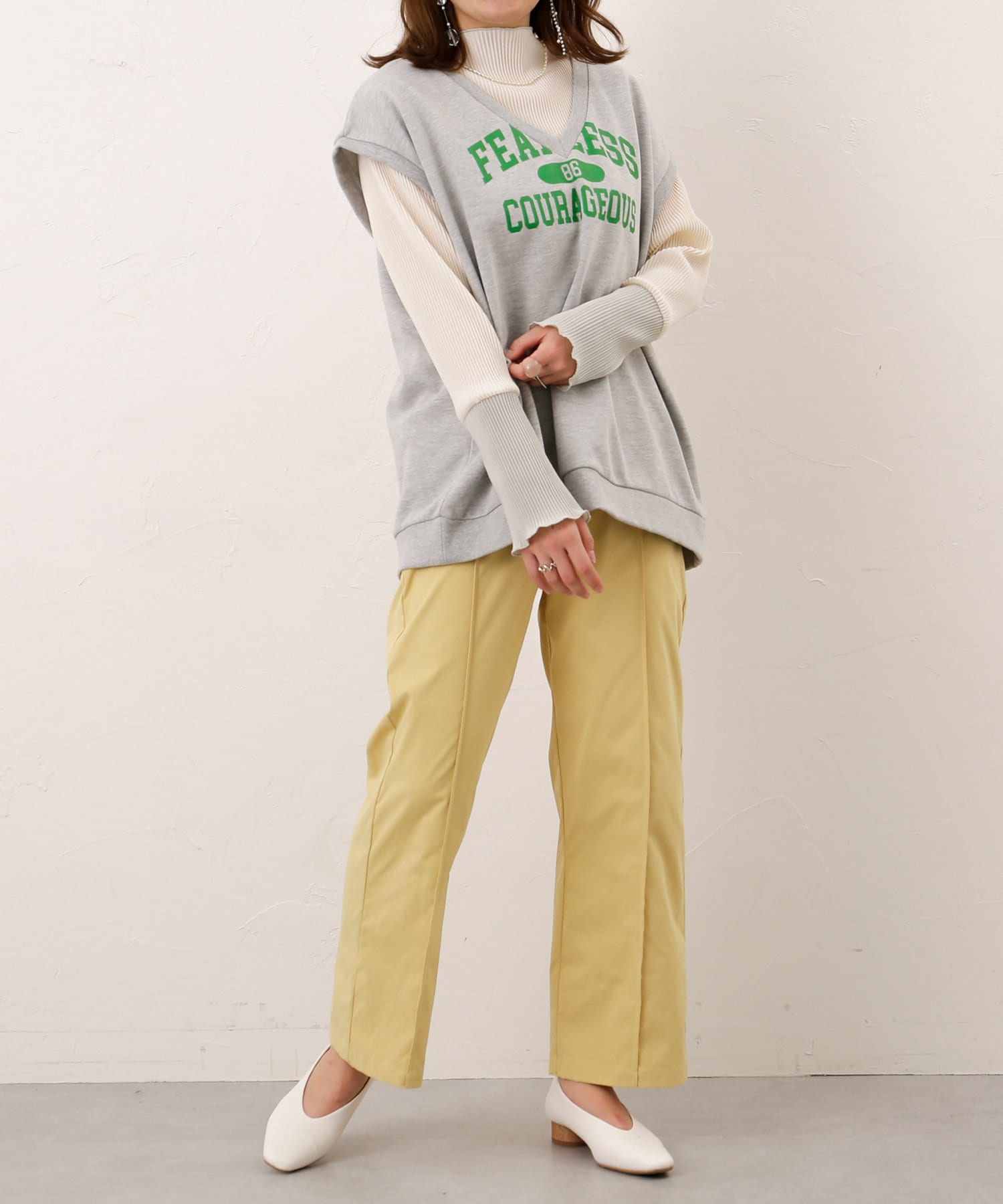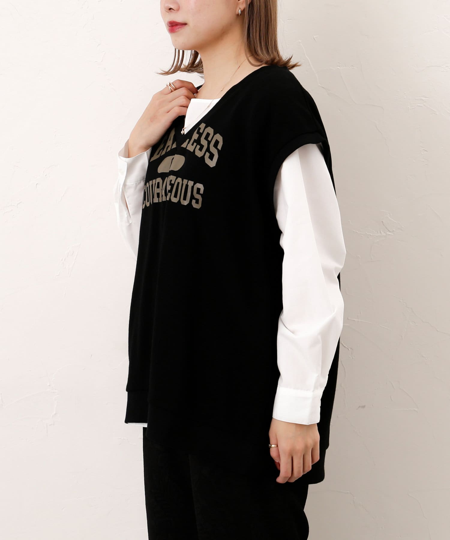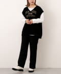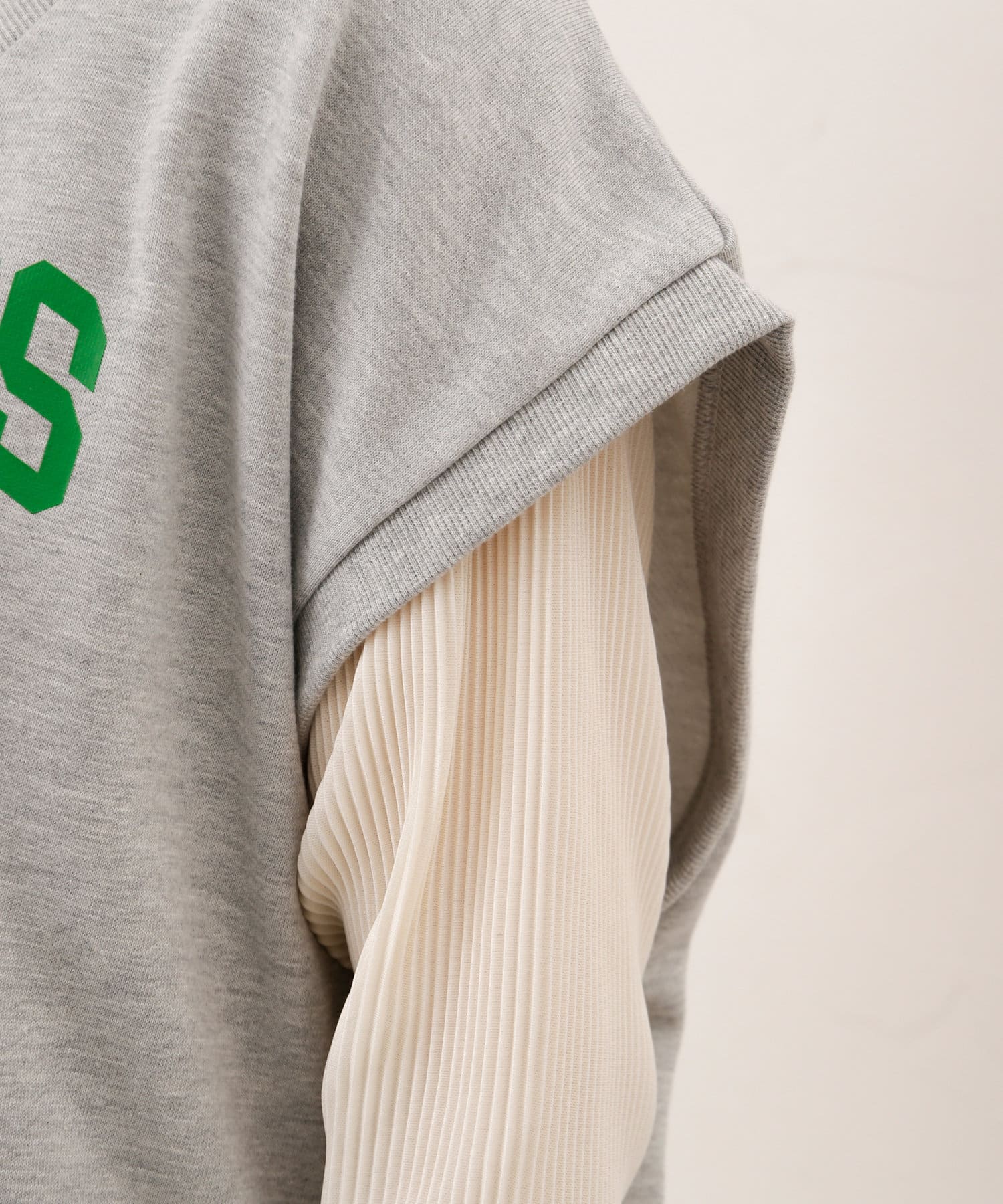 ゆとりがあるベストなので、オーバーサイズのカットソーや袖にデザインのあるシャツなど、半袖長袖問わず様々なトップスとレイヤードできます◎