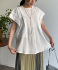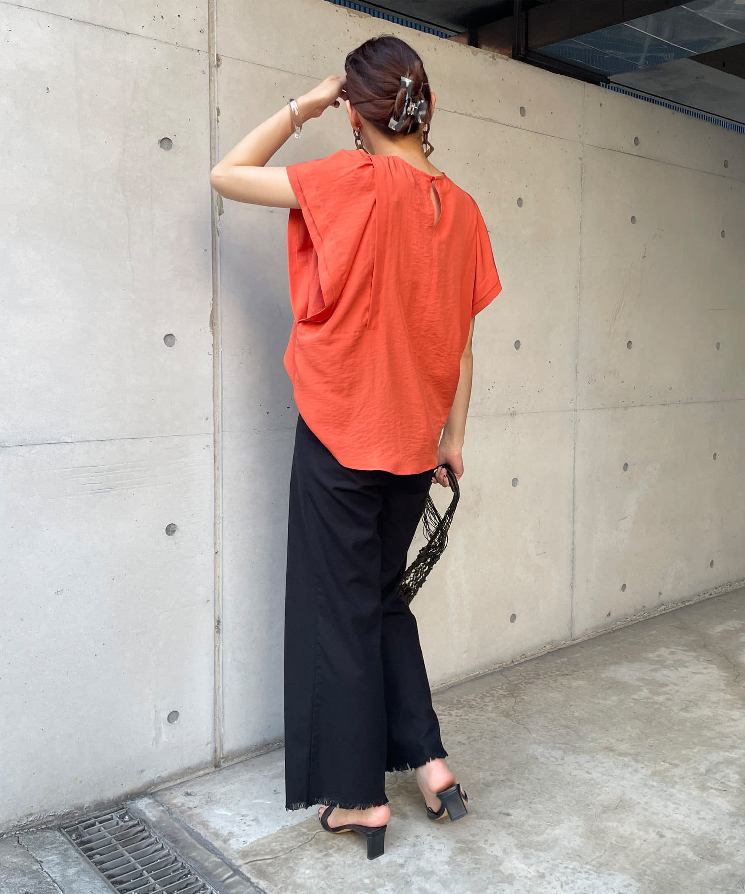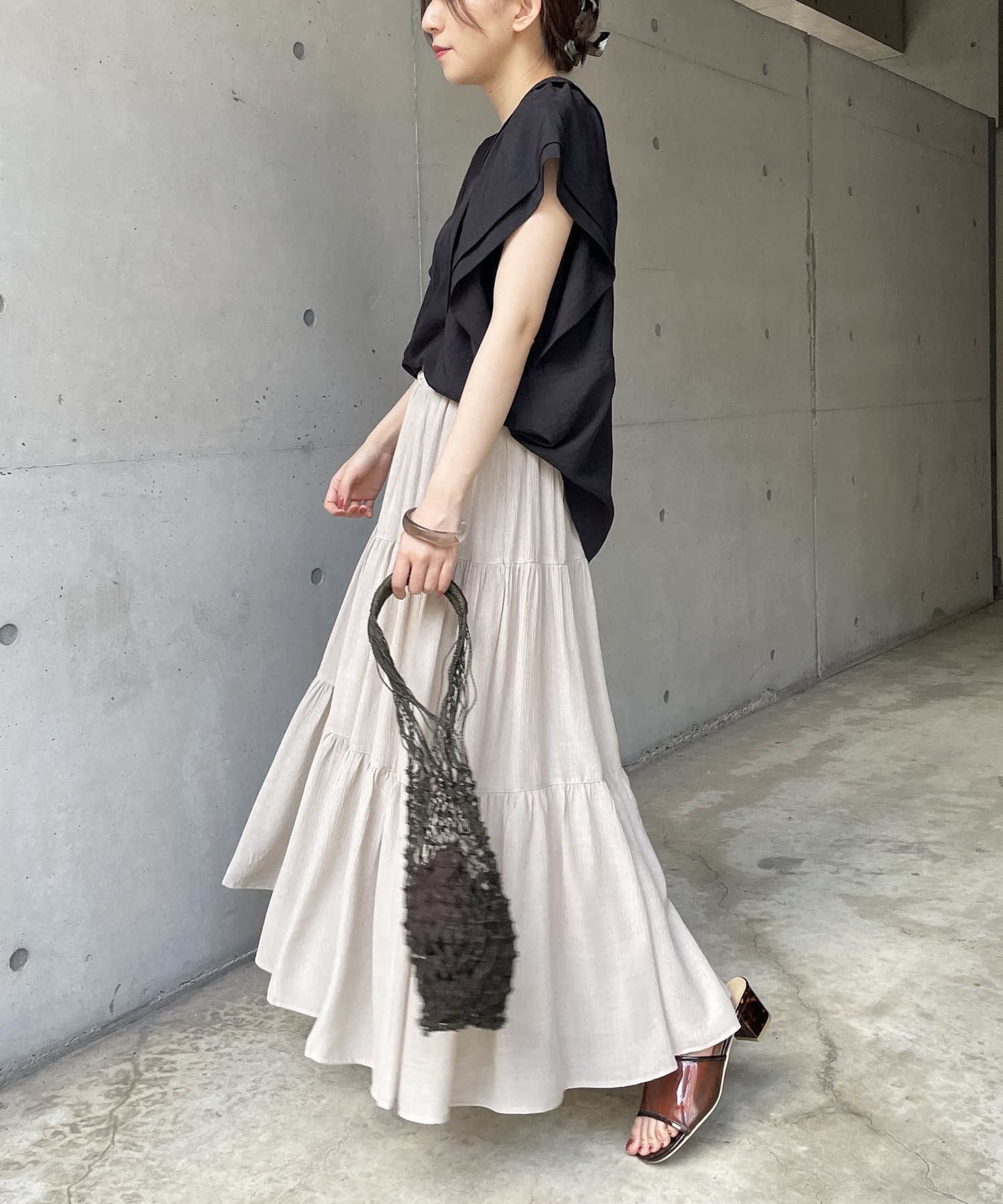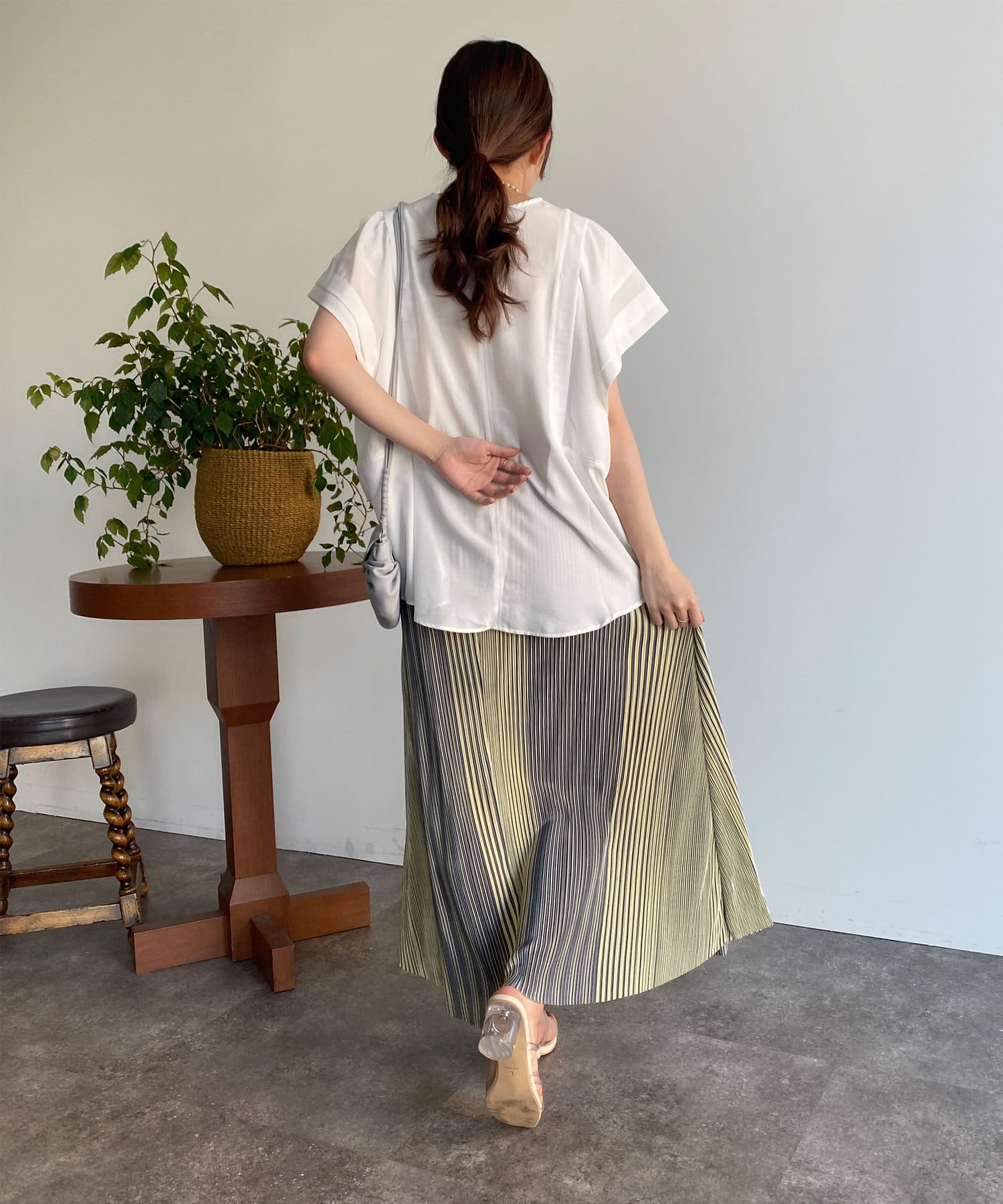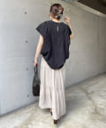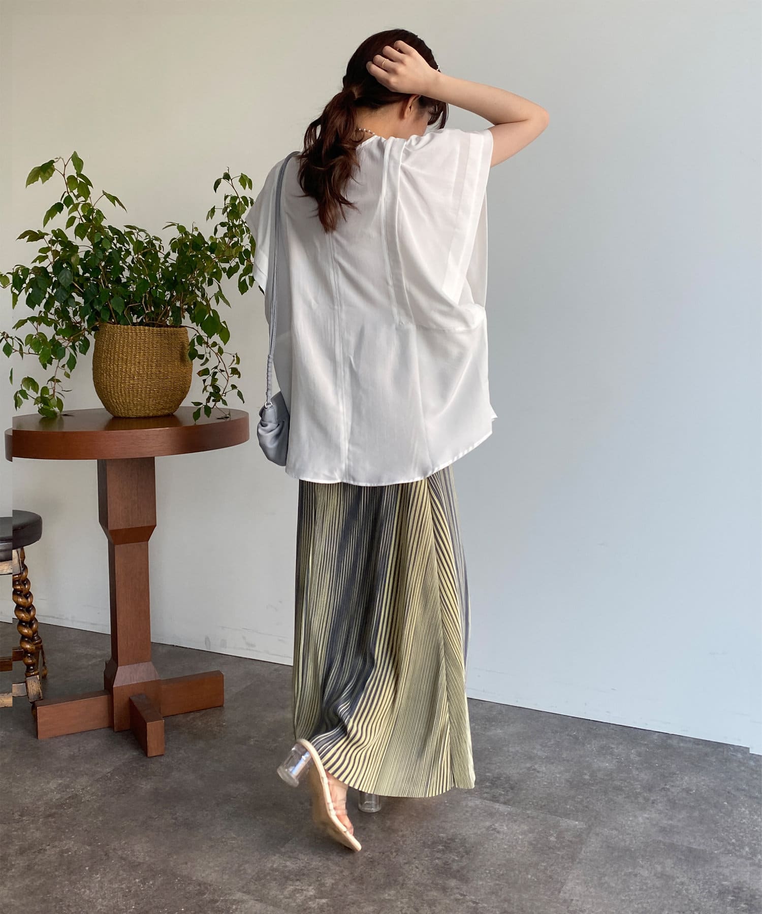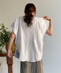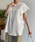 ふわっとした生地感でインでもアウトでも使いやすいので、どんなボトムスとも合わせやすく、着回しの効く一枚です。