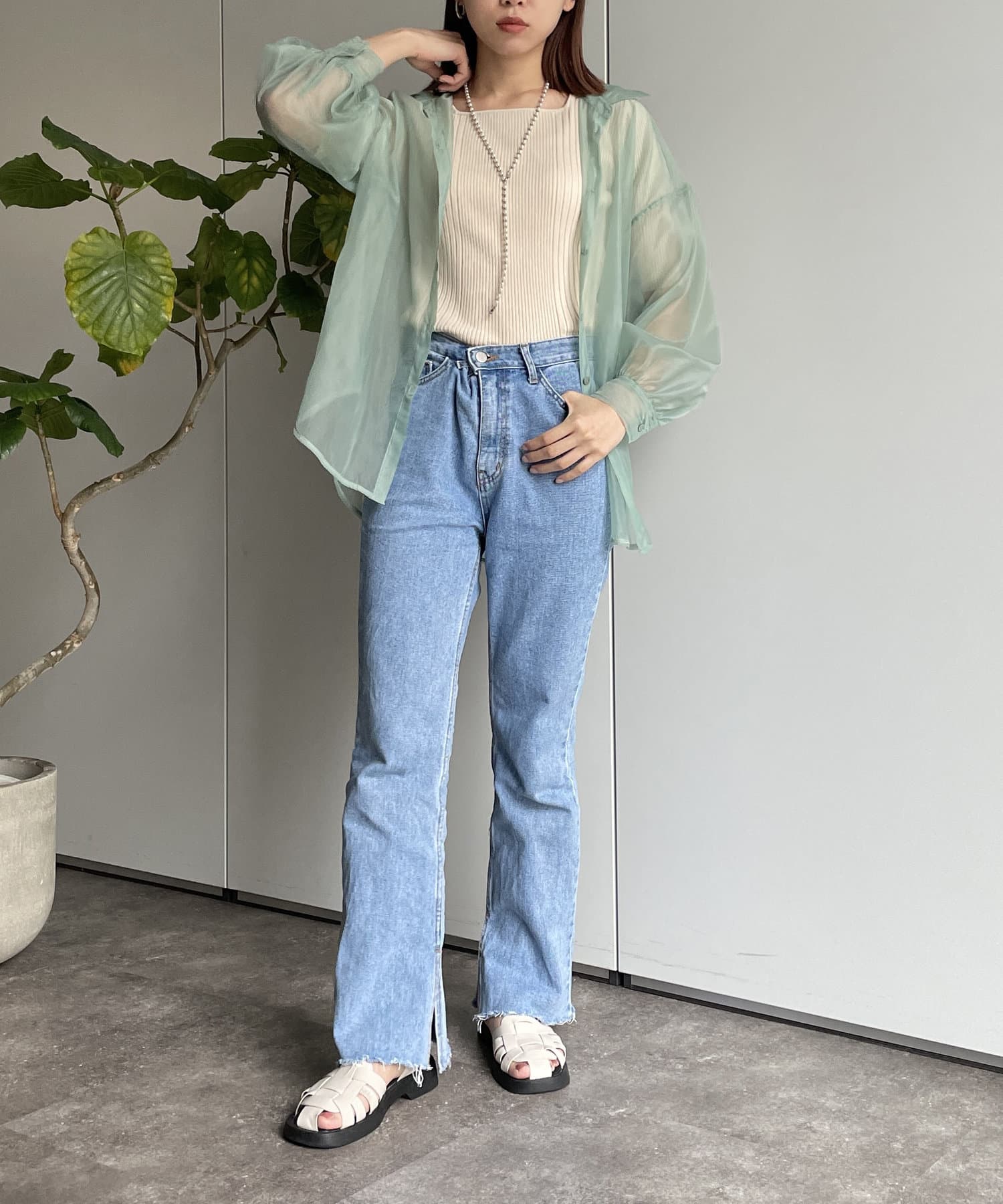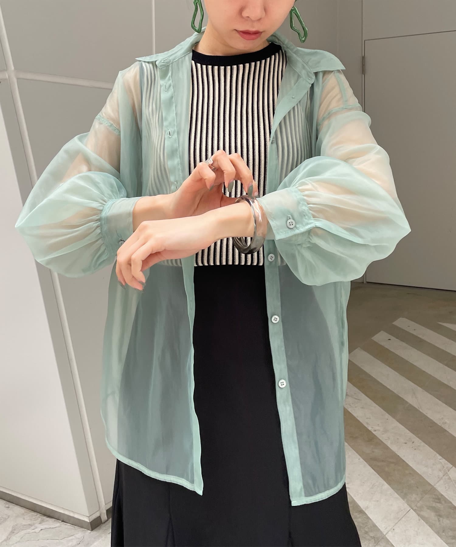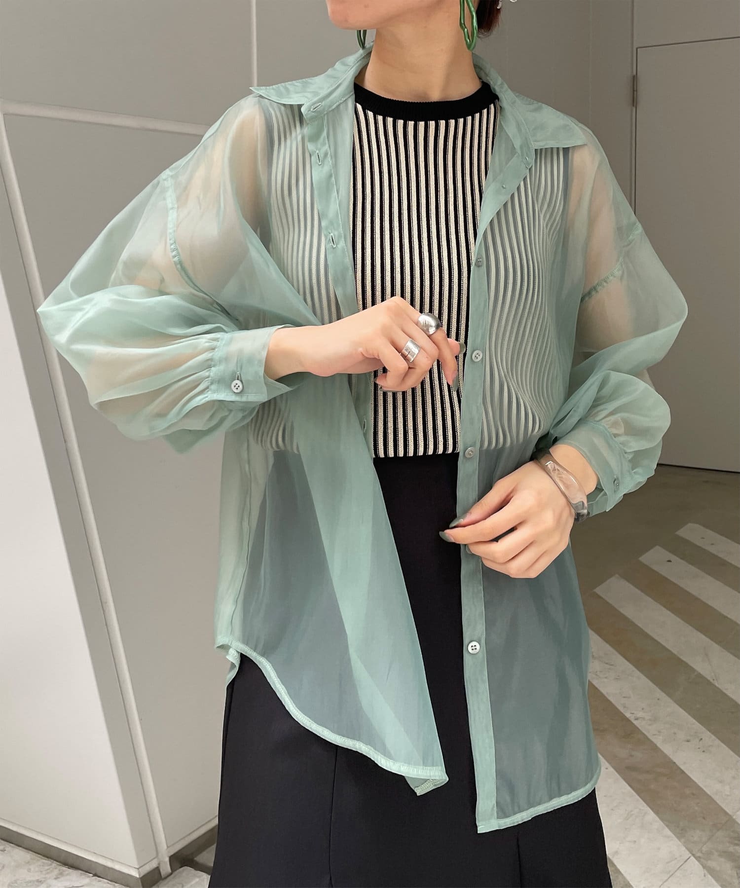 ・今季トレンドのシアーシャツです。