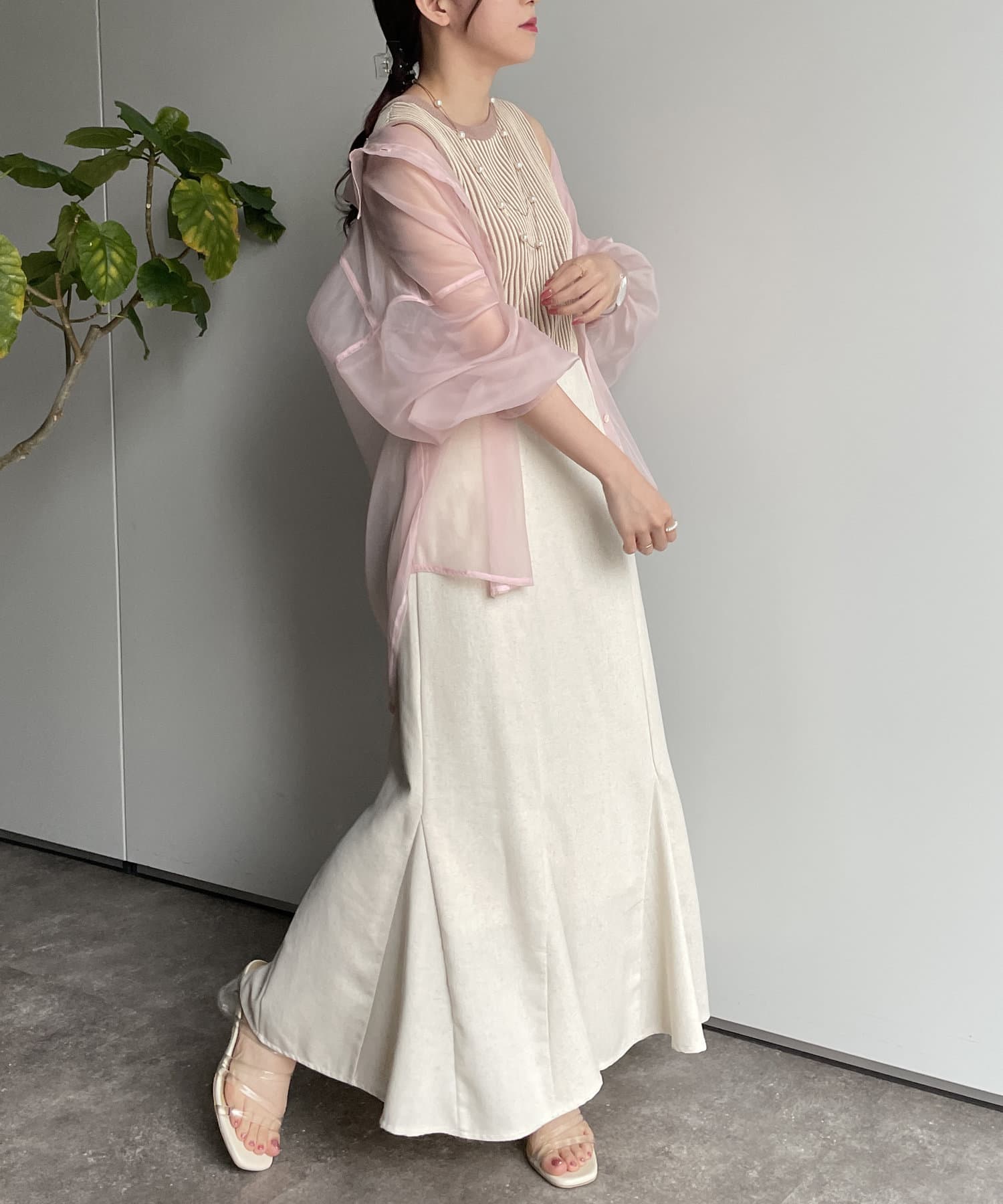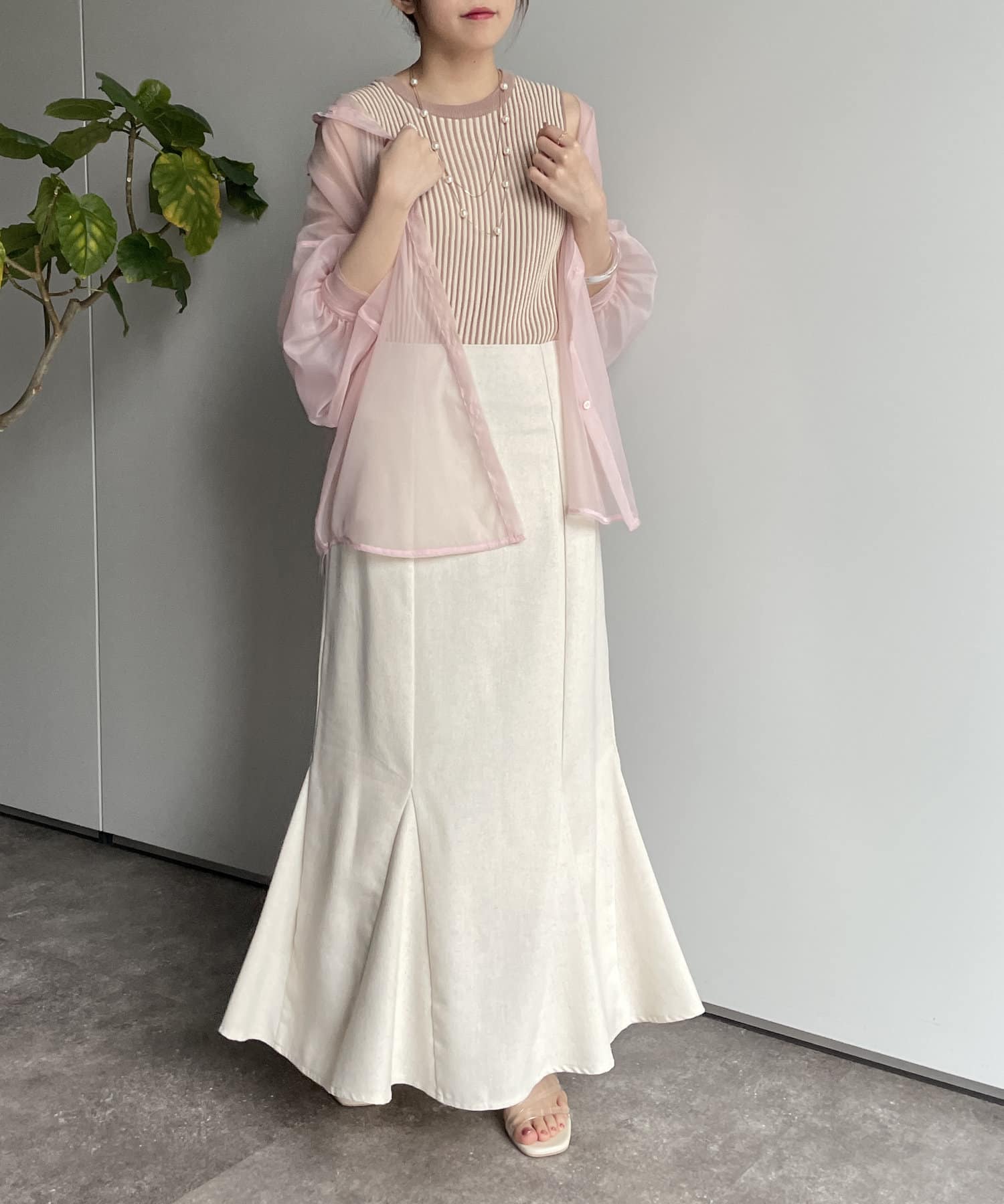 同系色インナーとの組み合わせはコーデに馴染みやすく、シアーアイテム初心者にもおすすめです。