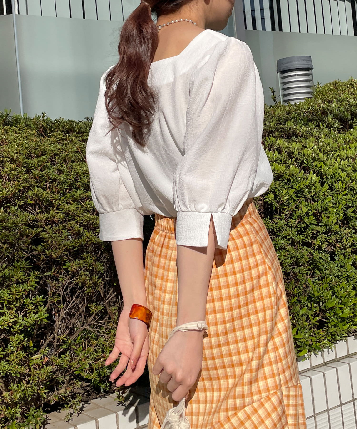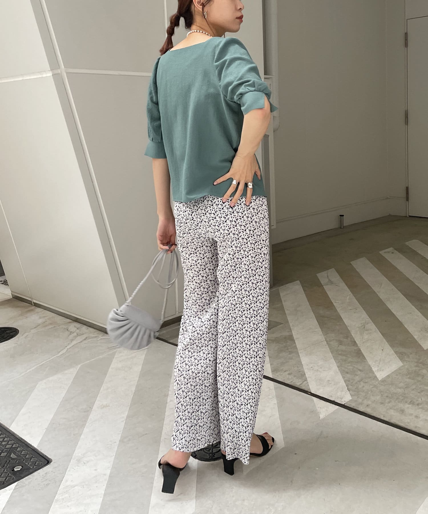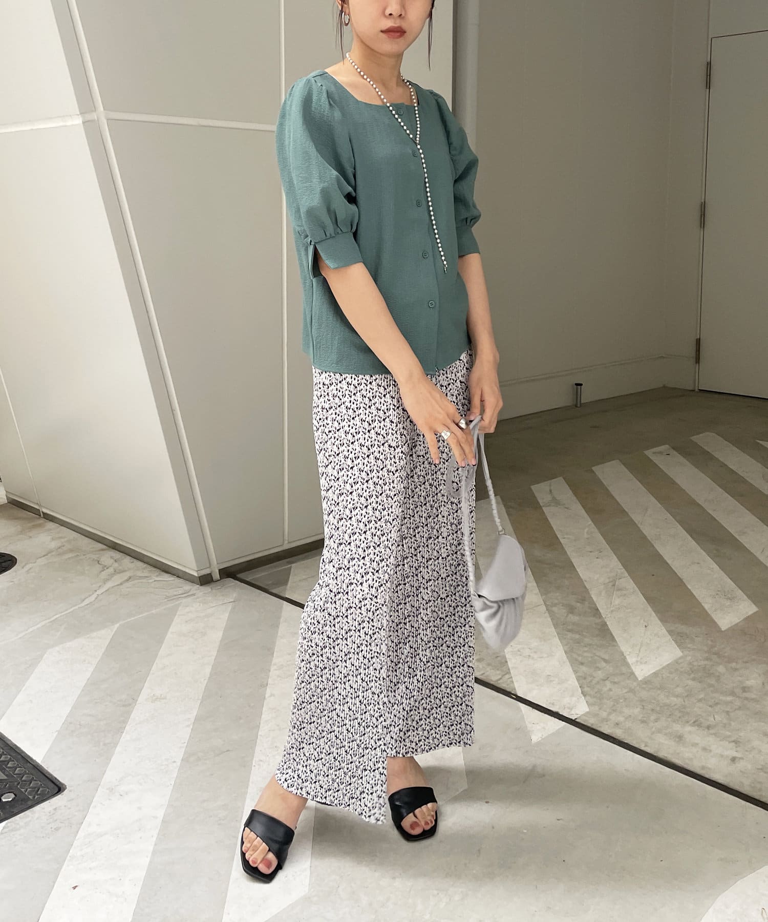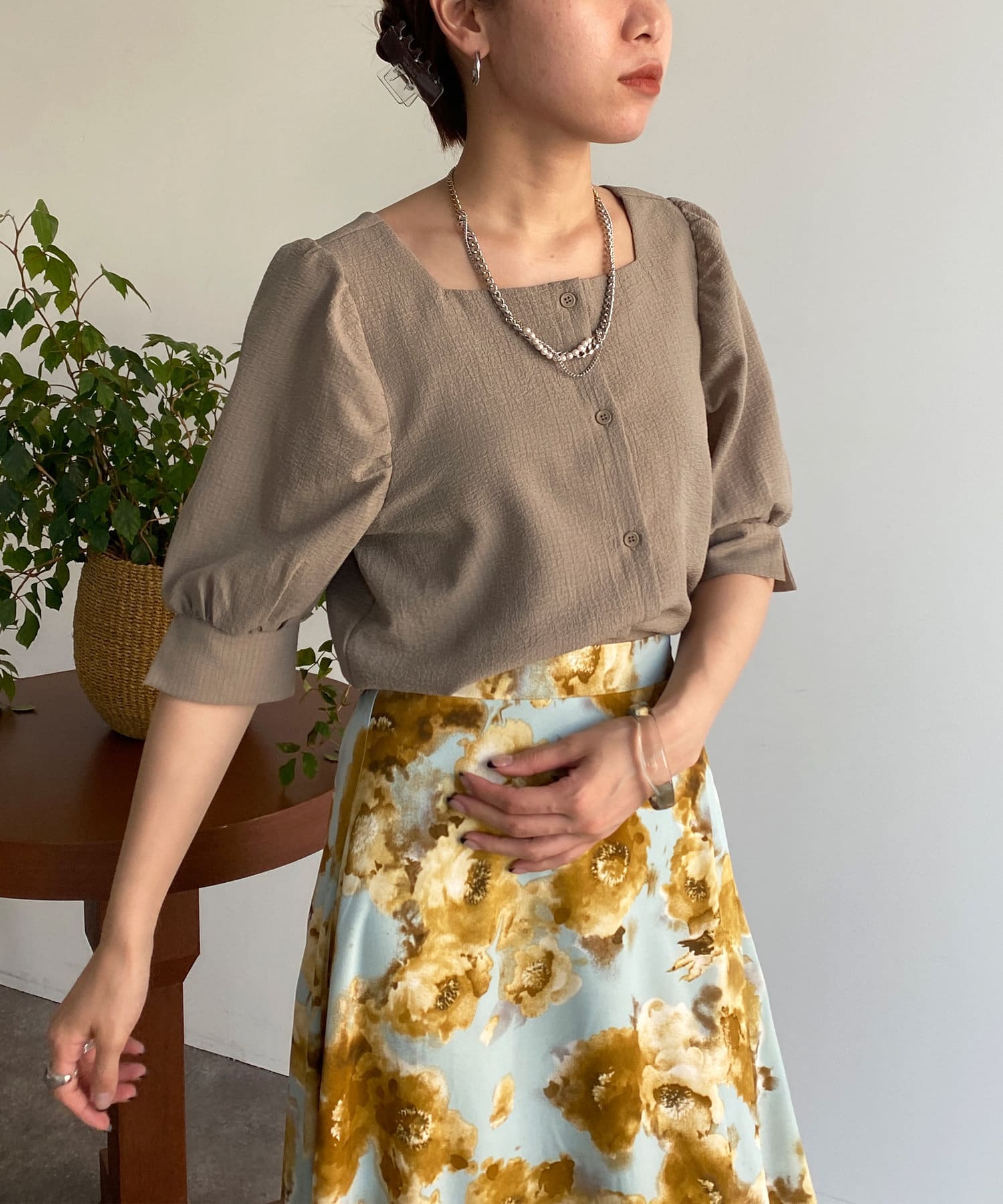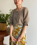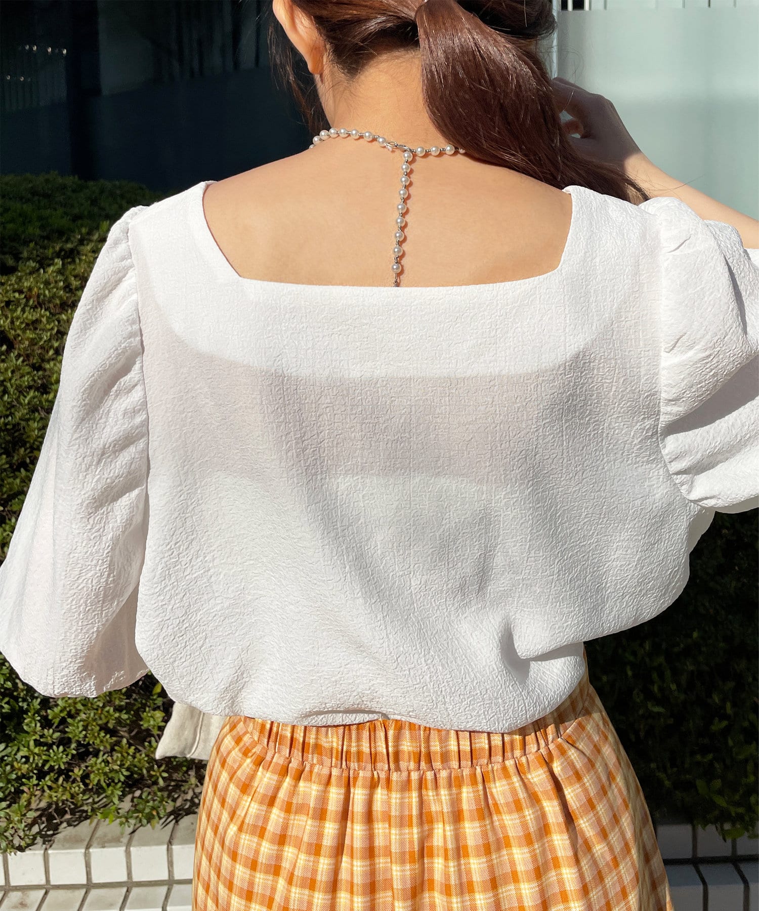 ・スクエアネックと程よくボリュームのあるパワショル袖が女性らしさを引き立てます。