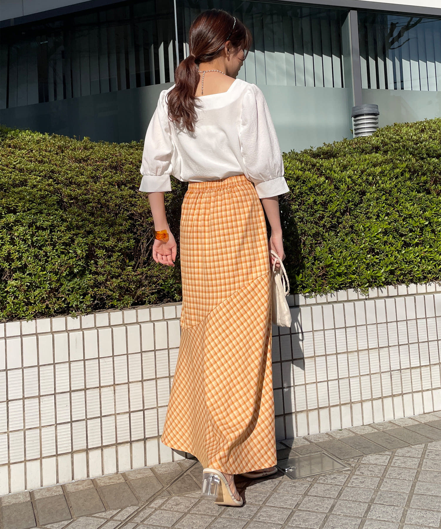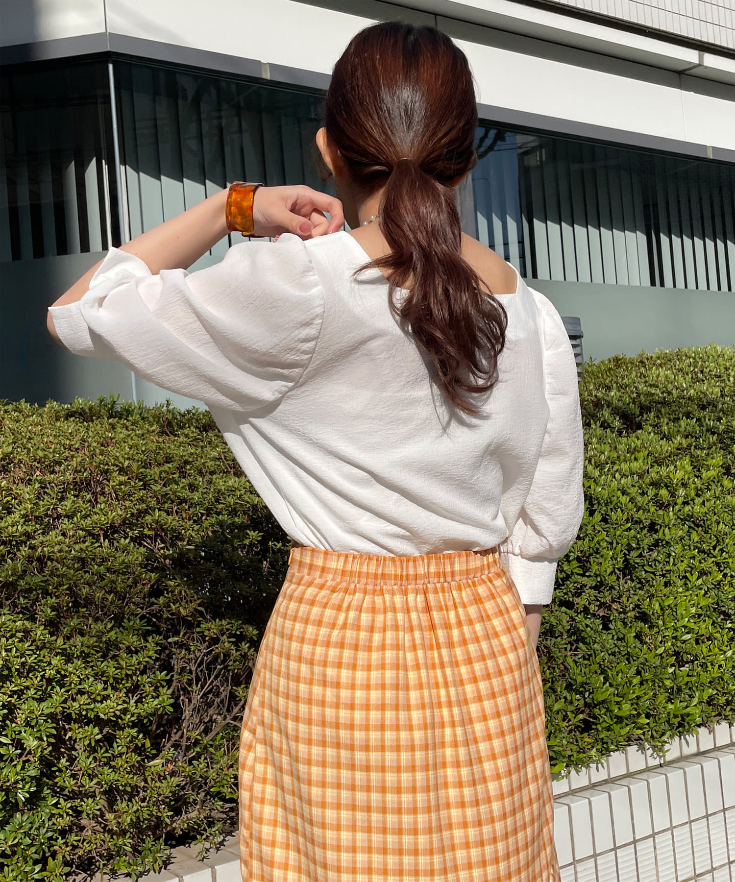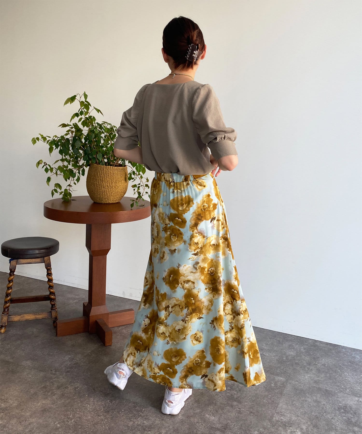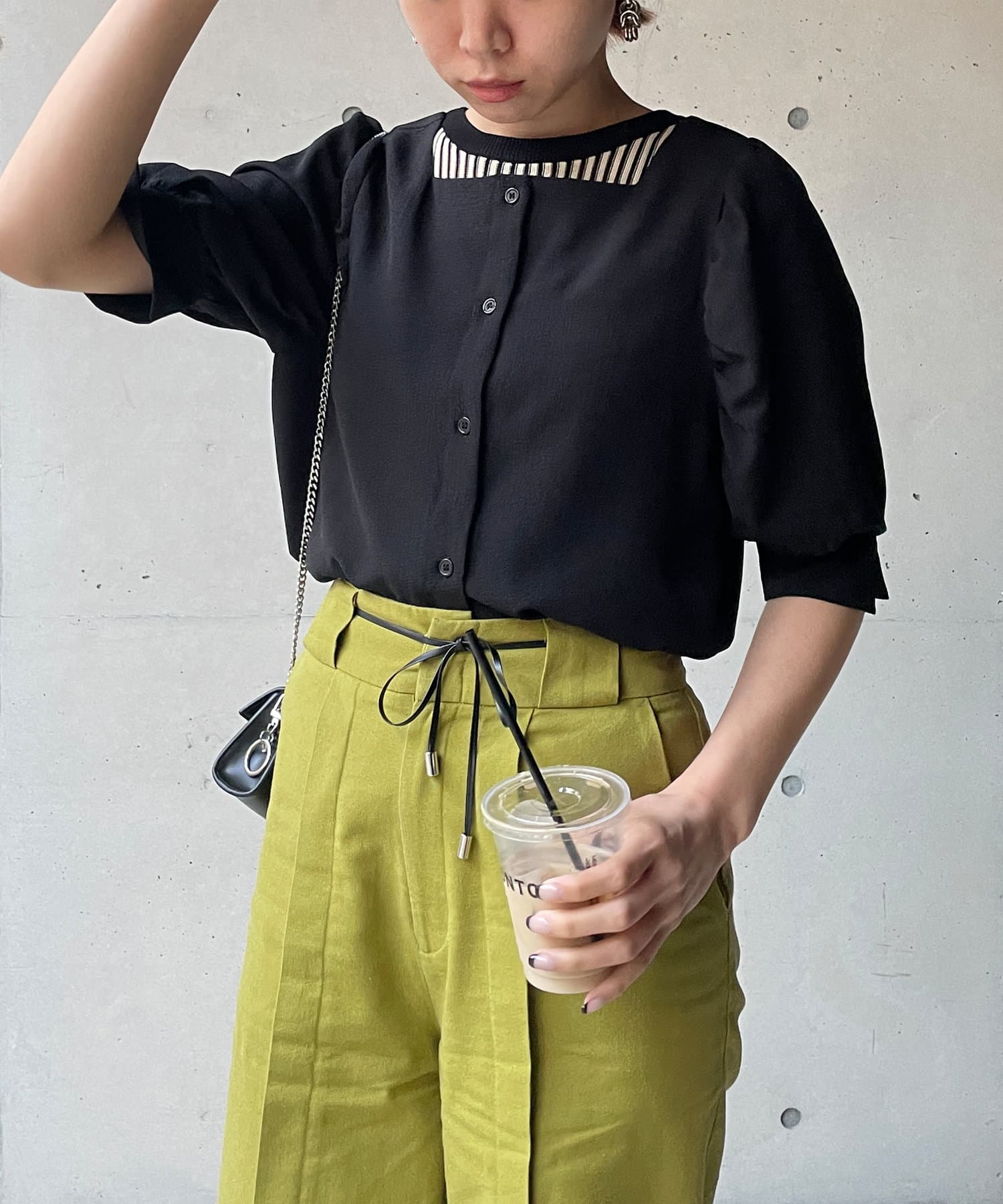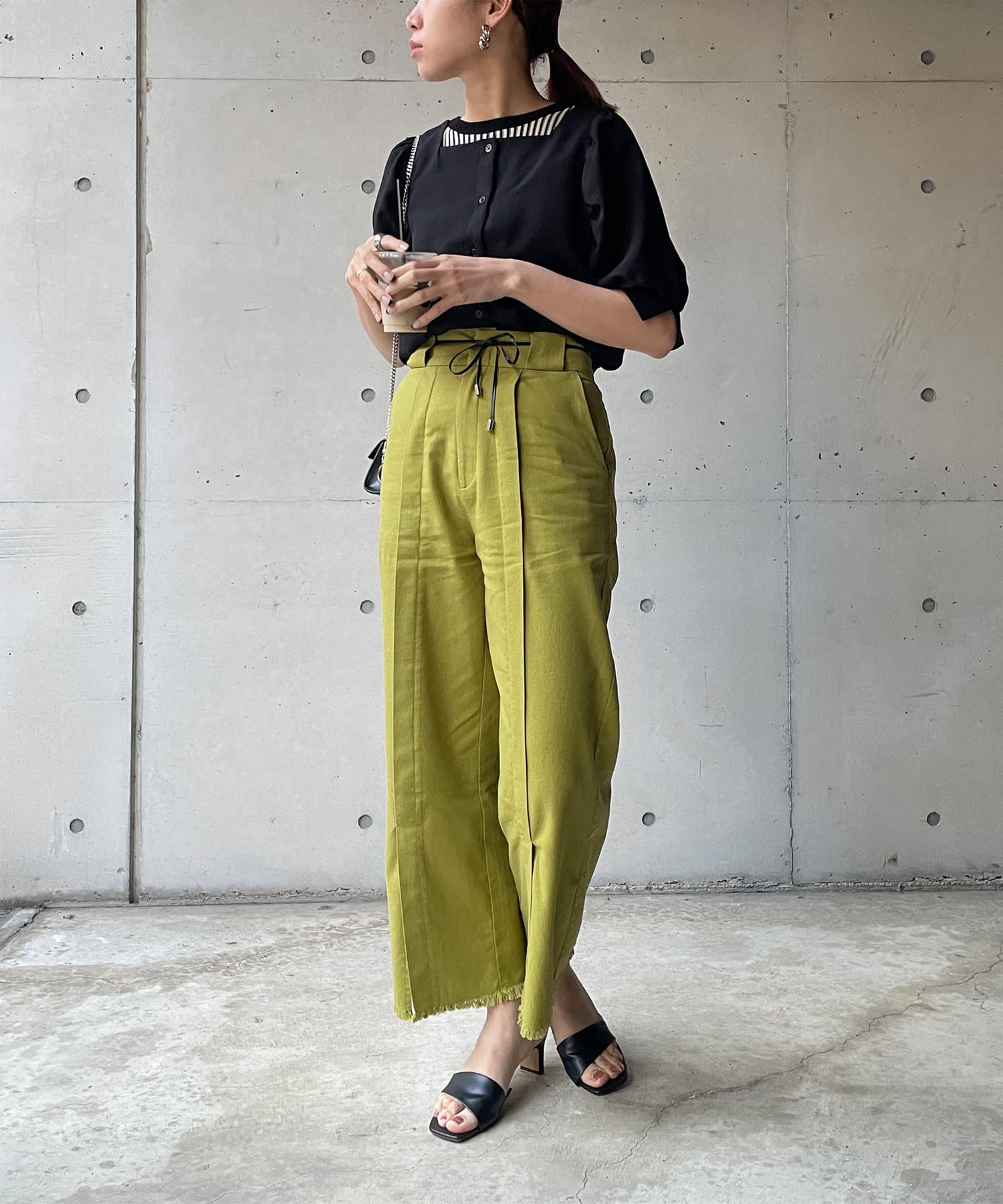 ・スクエアネックと程よくボリュームのあるパワショル袖が女性らしさを引き立てます。