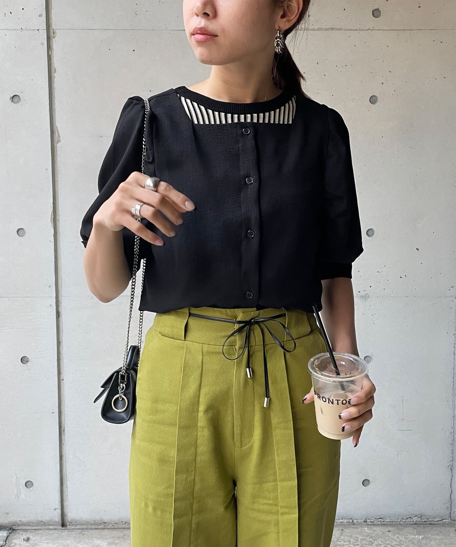 前開きでリブタンクトップなどとレイヤードしてもオシャレ見えします。