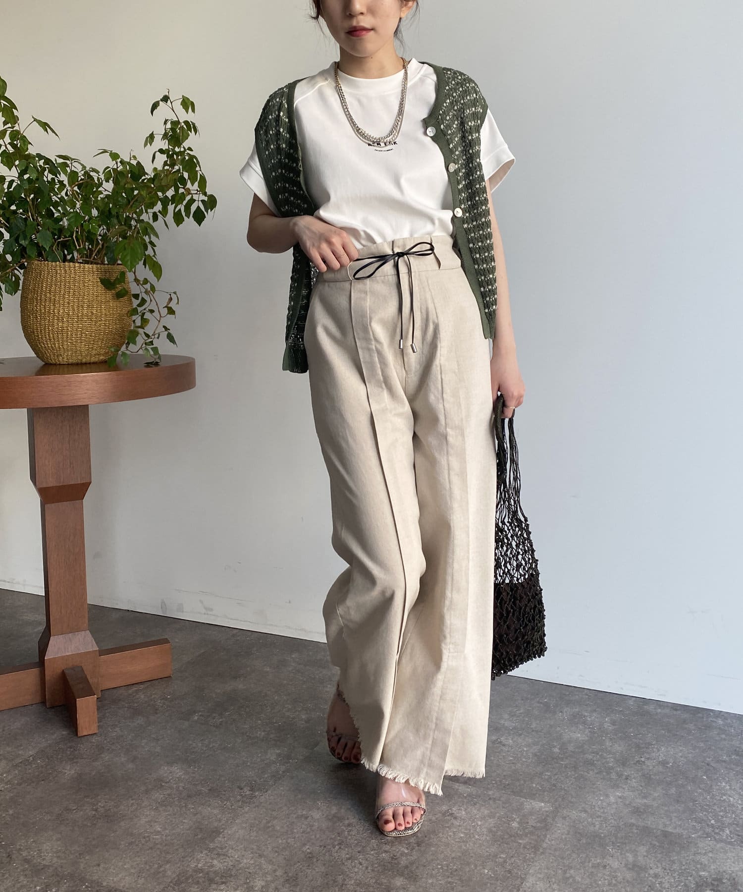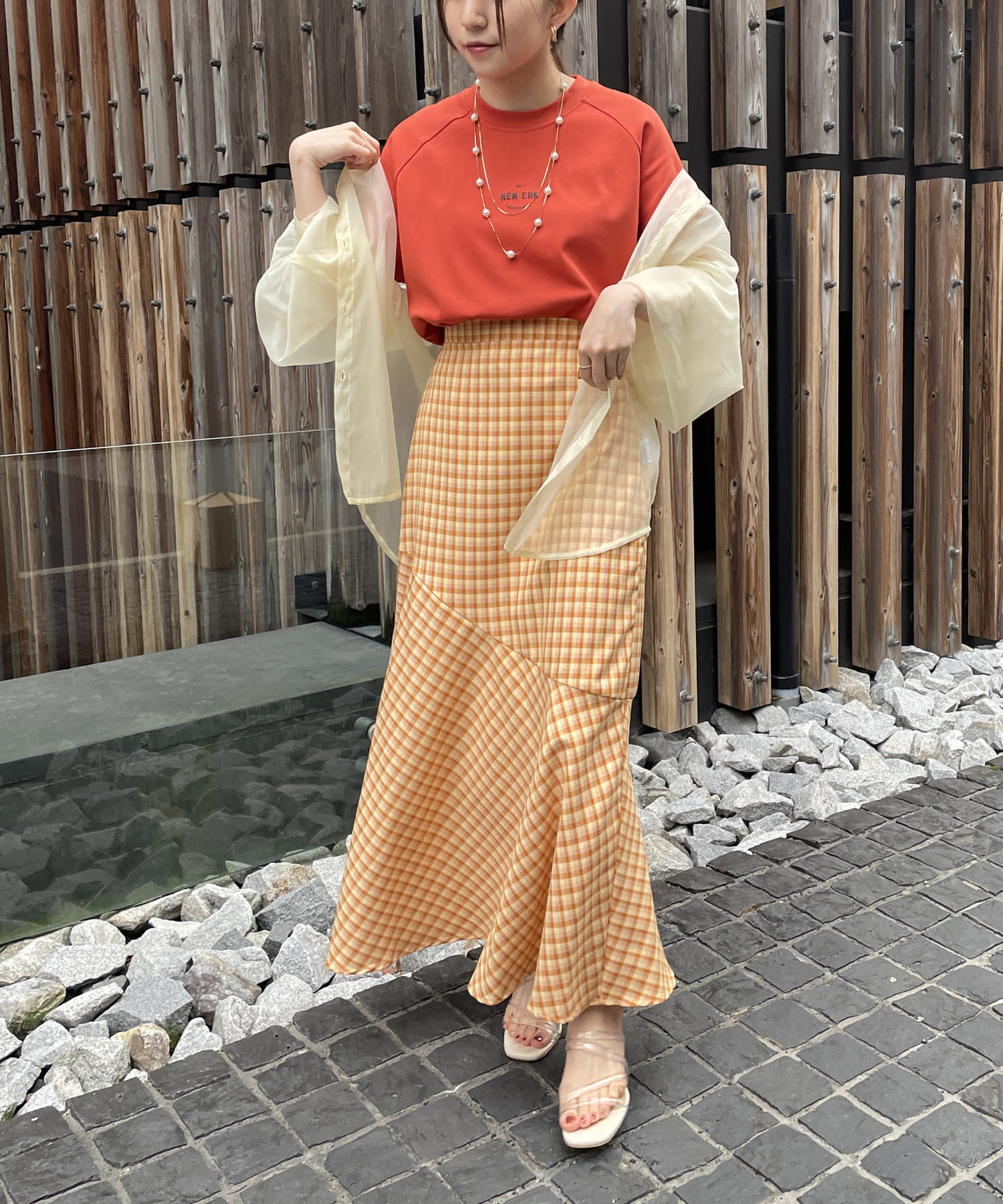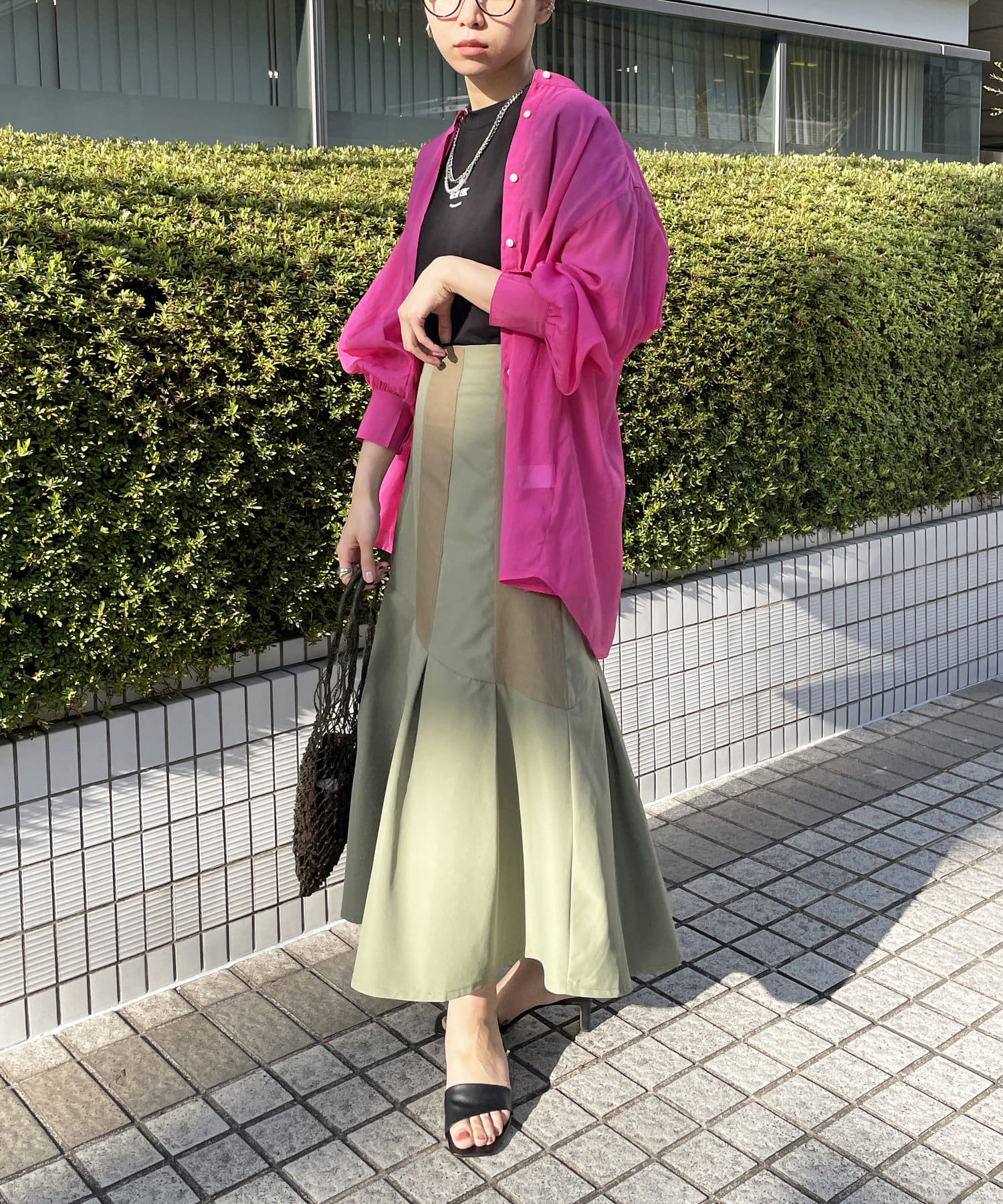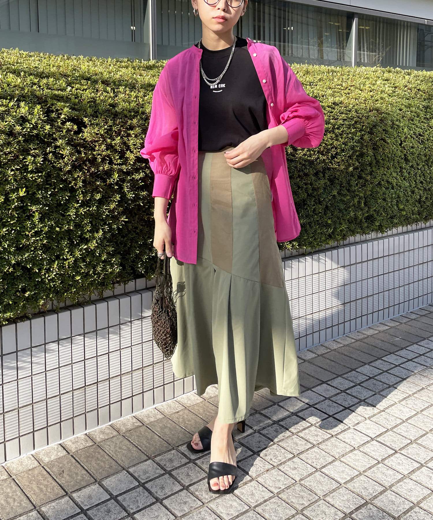 一枚でもオシャレ見えしますが、シアーシャツを羽織ればトレンドスタイリングに仕上がります。