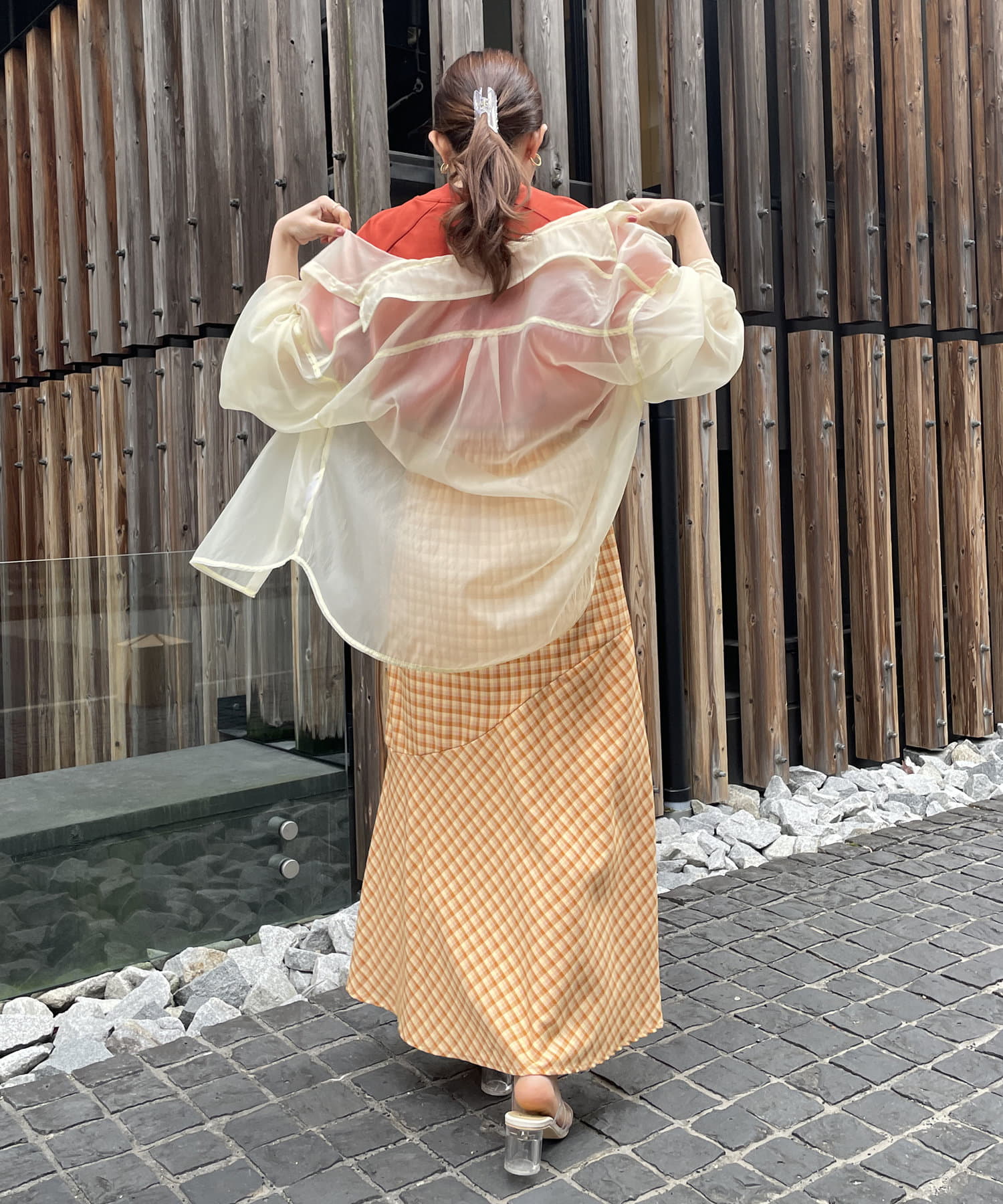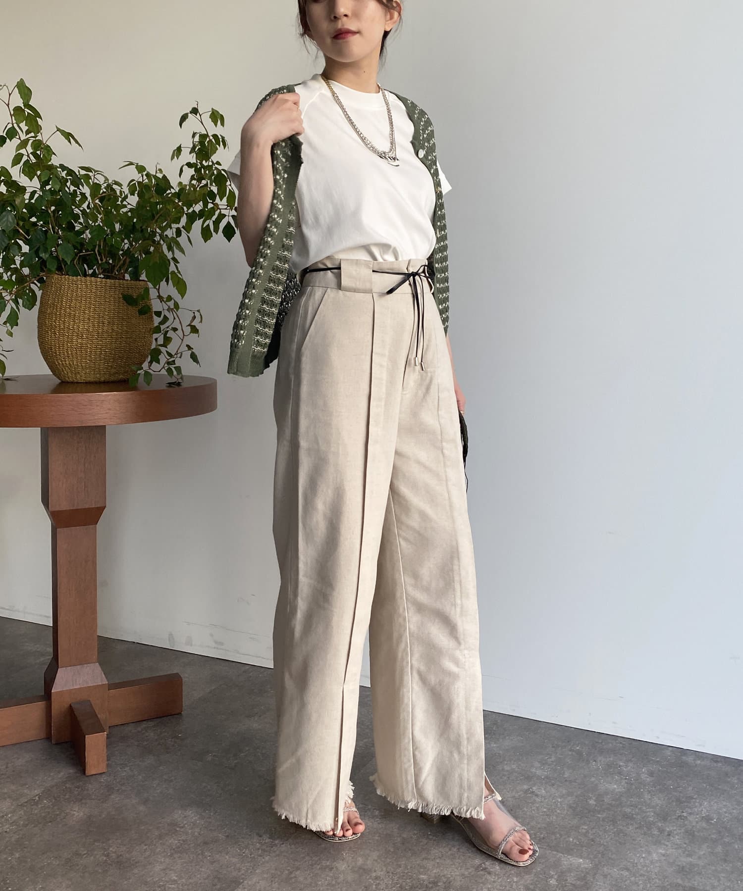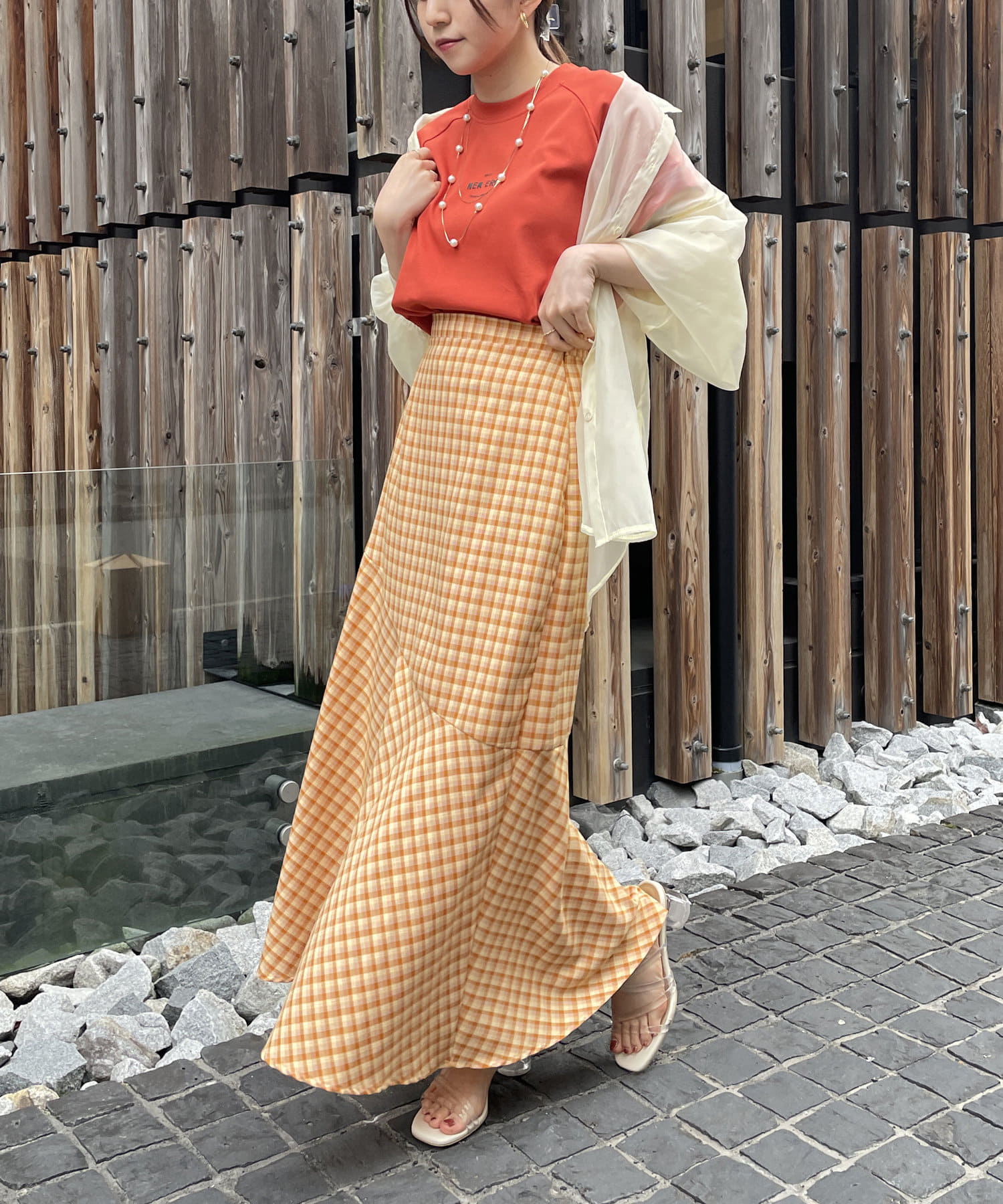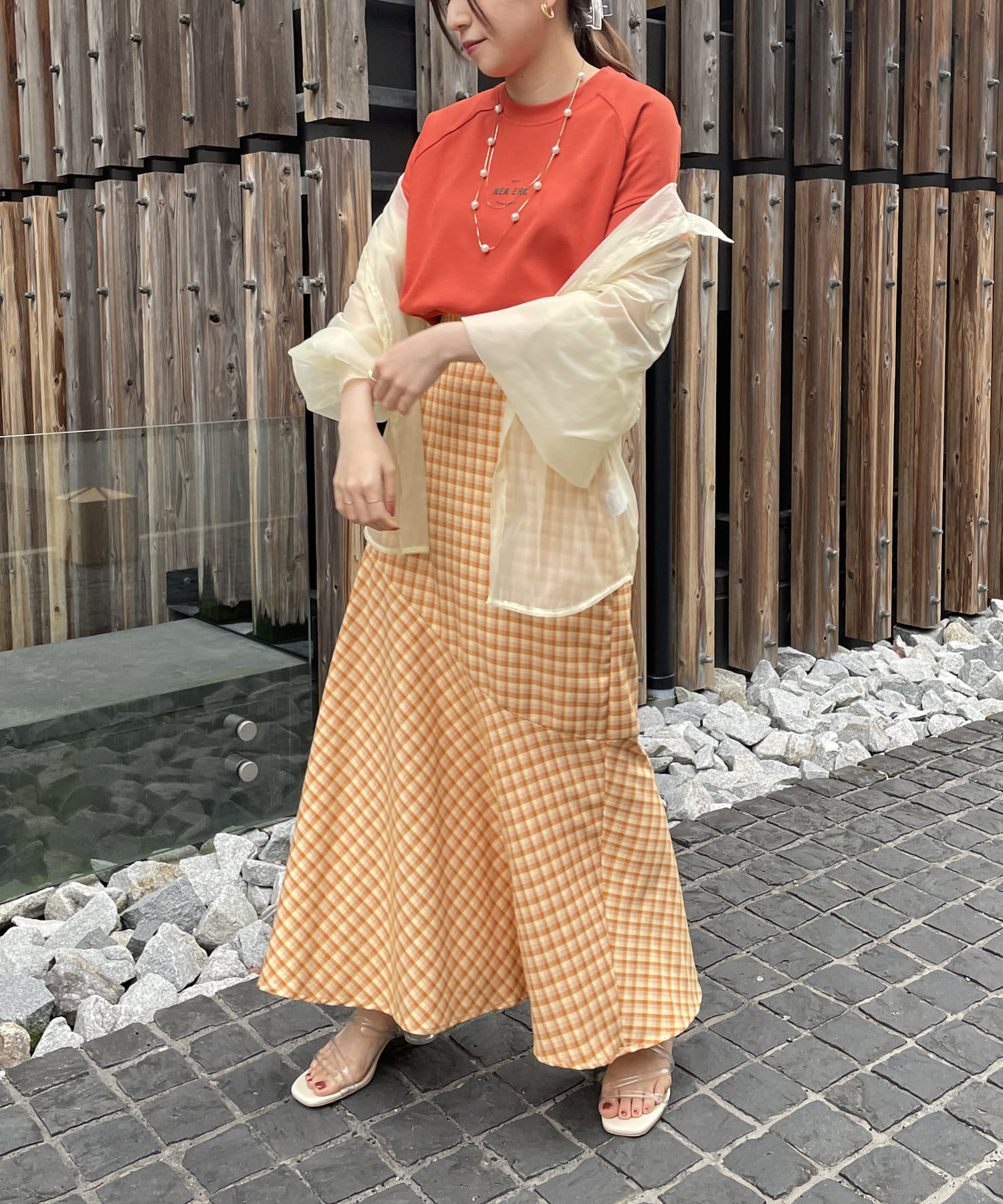 一枚でもオシャレ見えしますが、シアーシャツを羽織ればトレンドスタイリングに仕上がります。