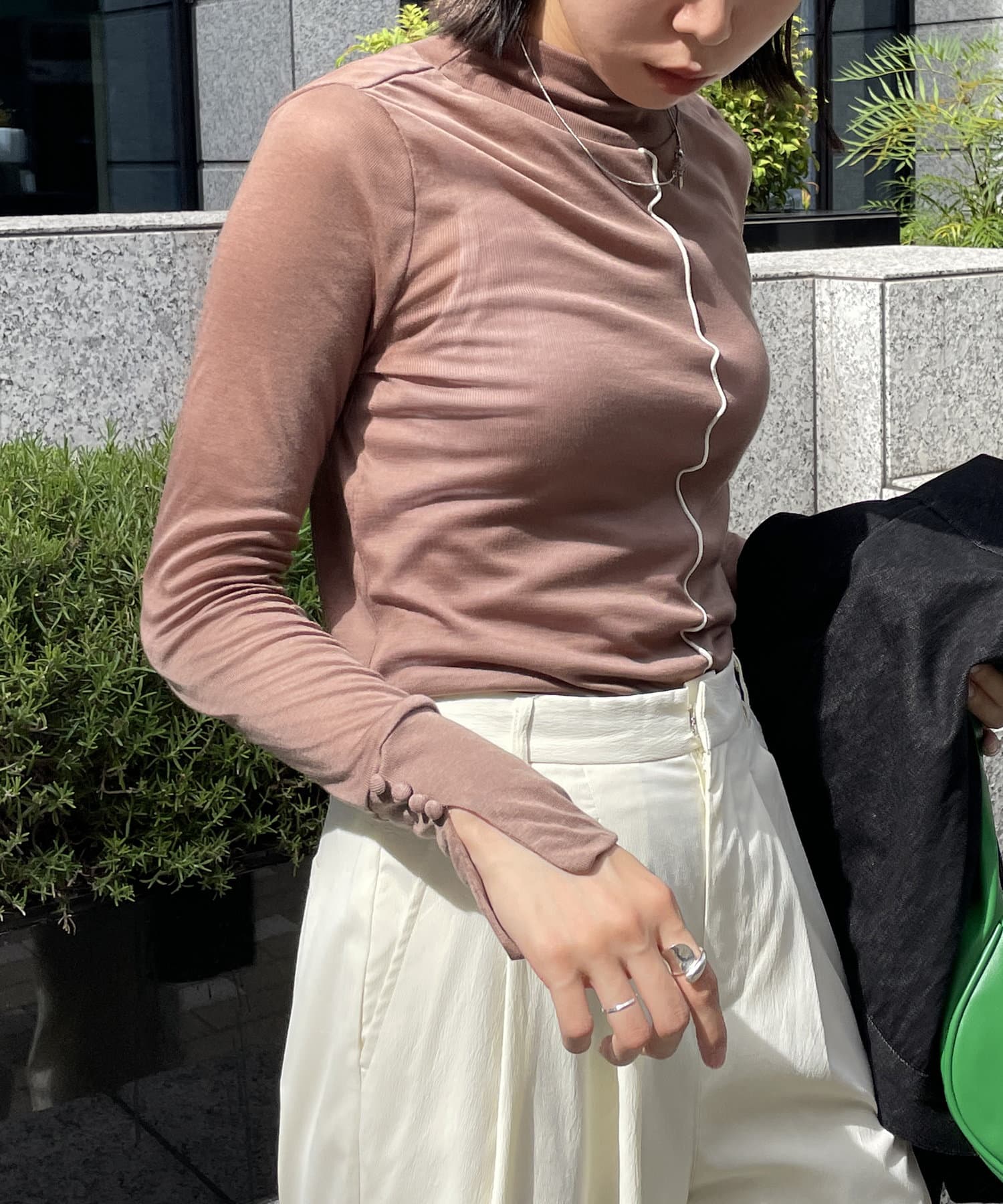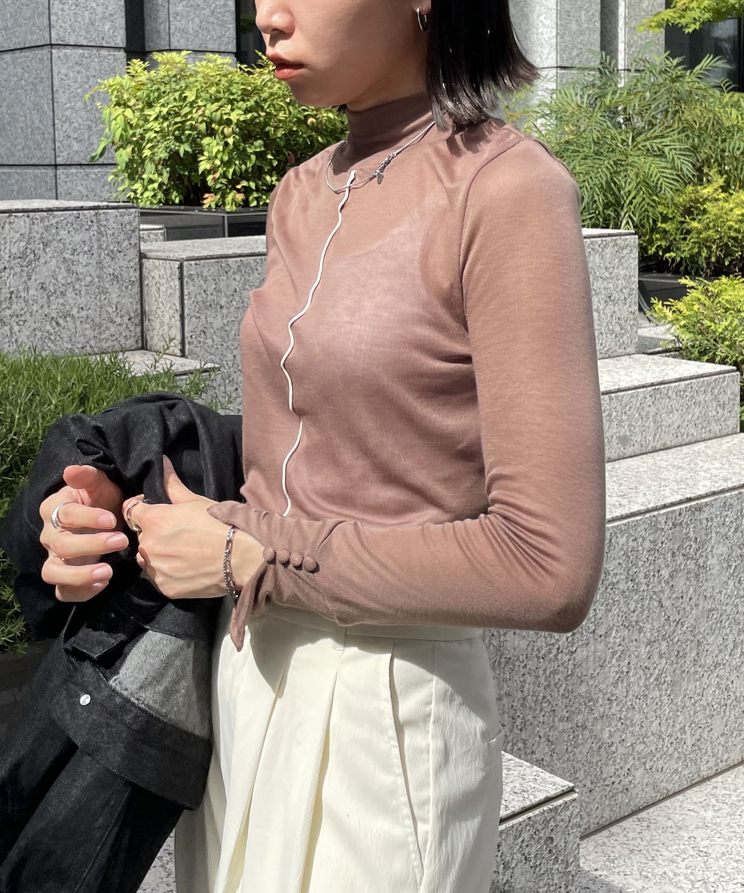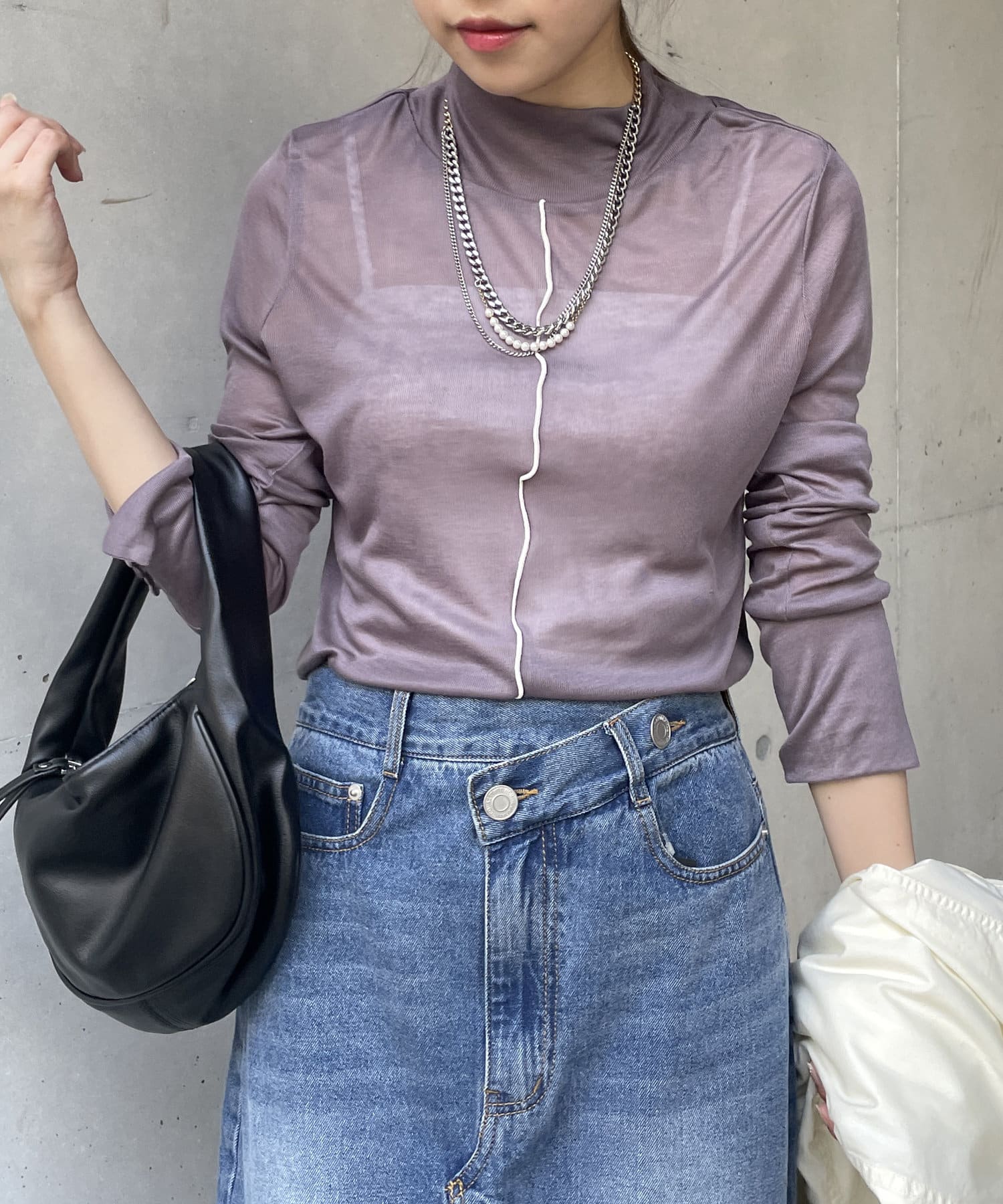 ハイネック+長めの袖なのでニットやシャツとレイヤードしてチラ見せするのがお洒落!