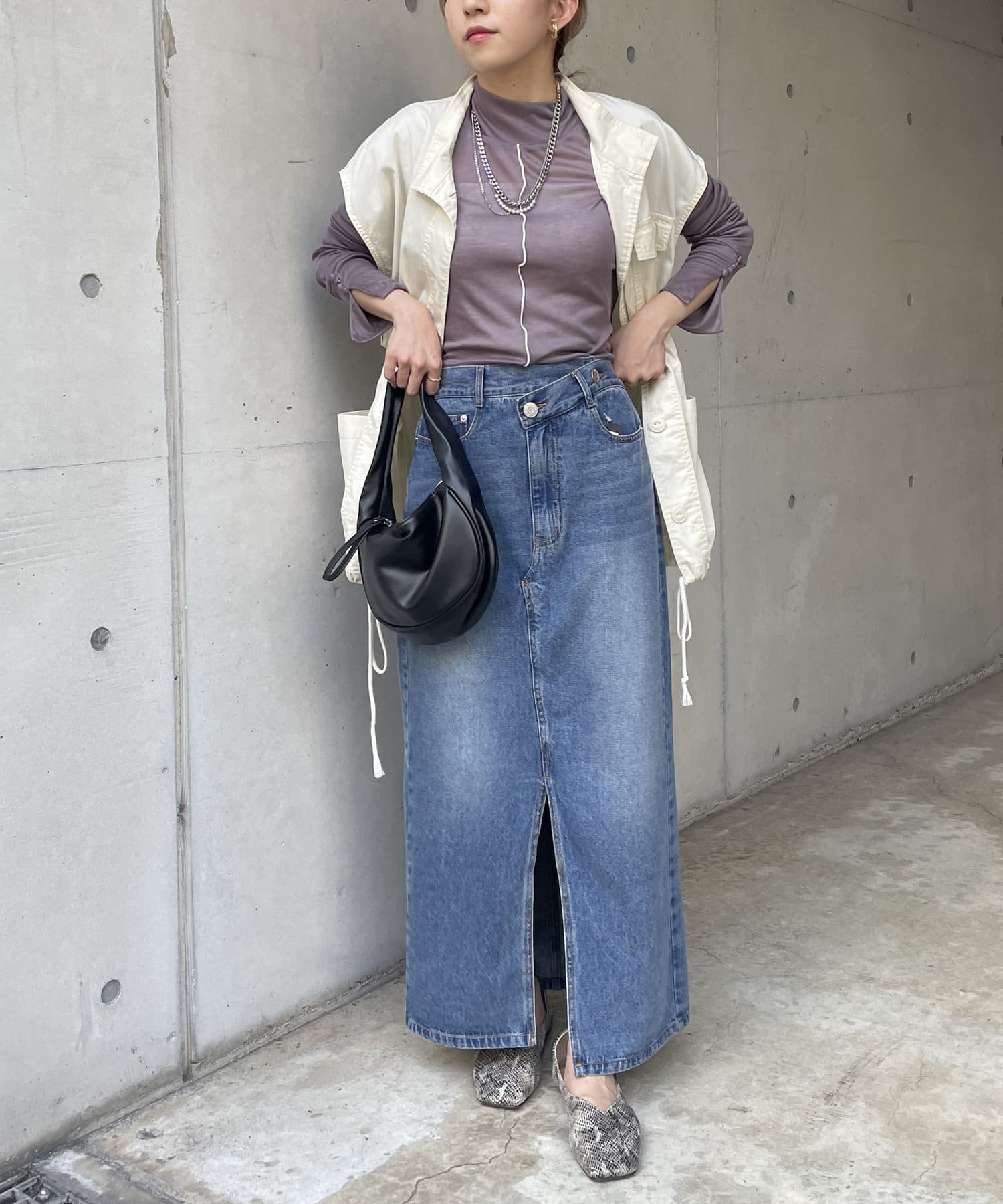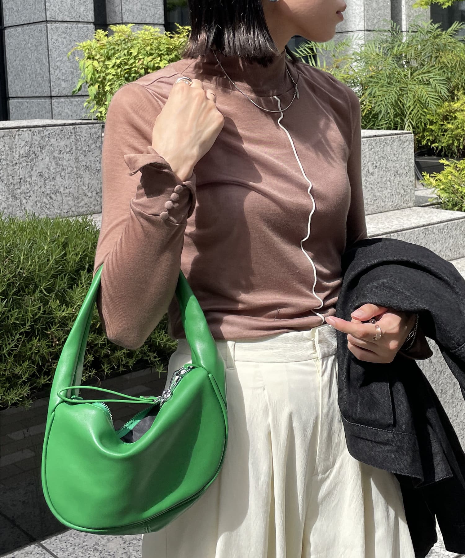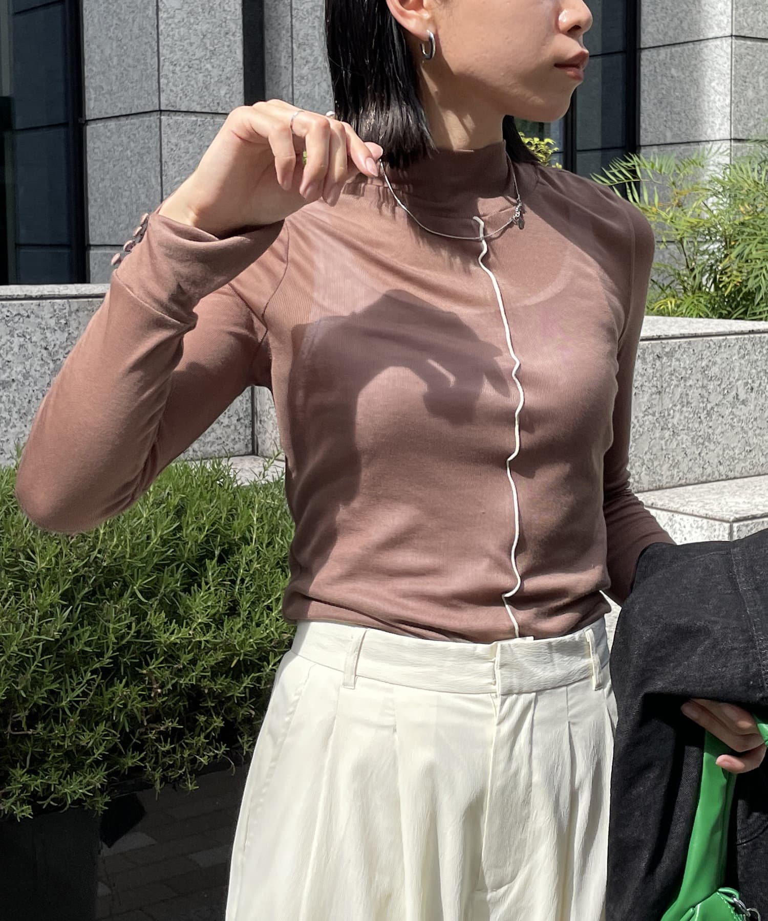 ハイネック+長めの袖なのでニットやシャツとレイヤードしてチラ見せするのがお洒落!