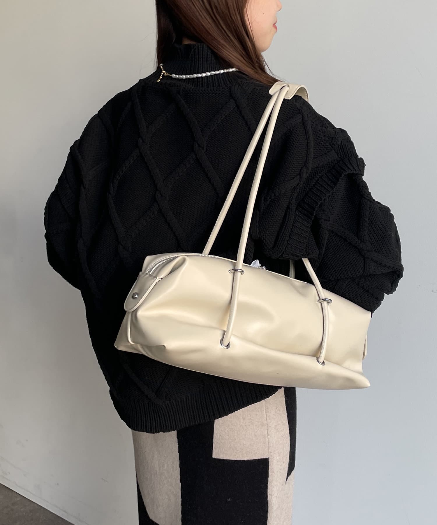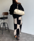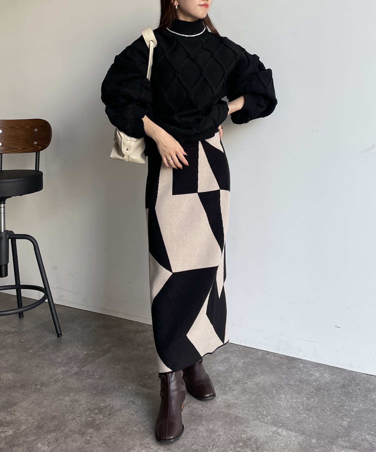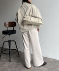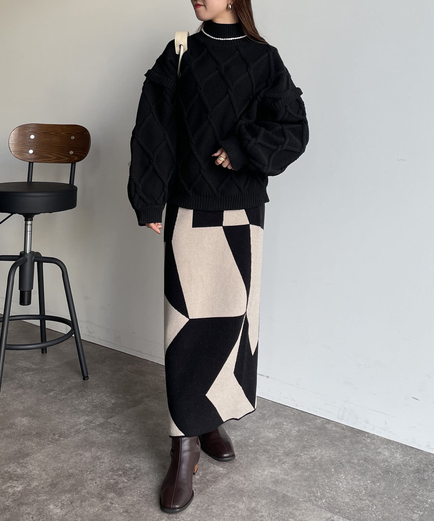 ・ボリューミーなシルエットを活かして、タイトスカートやパンツでメリハリをつけると、すっきりと着こなせます。