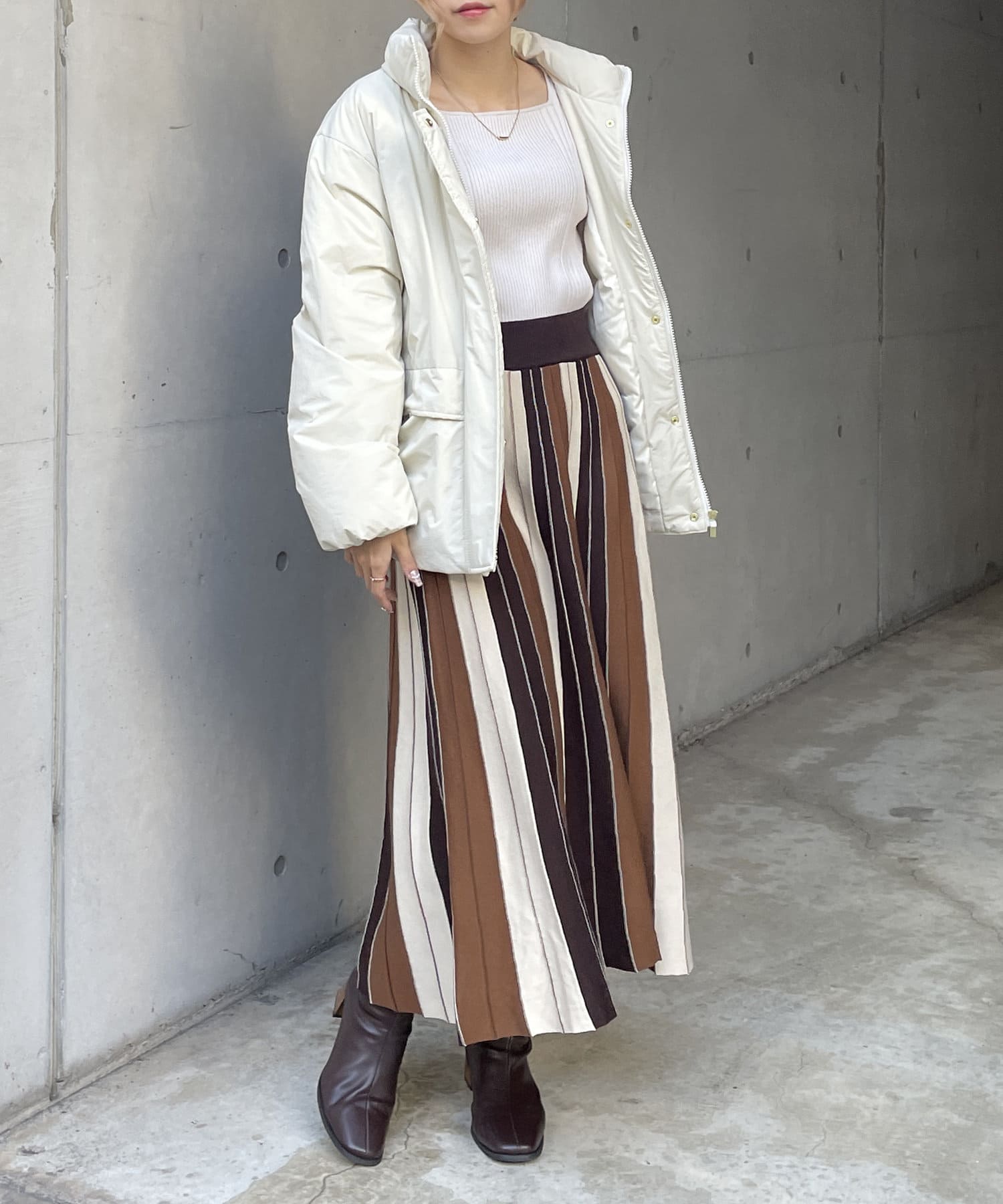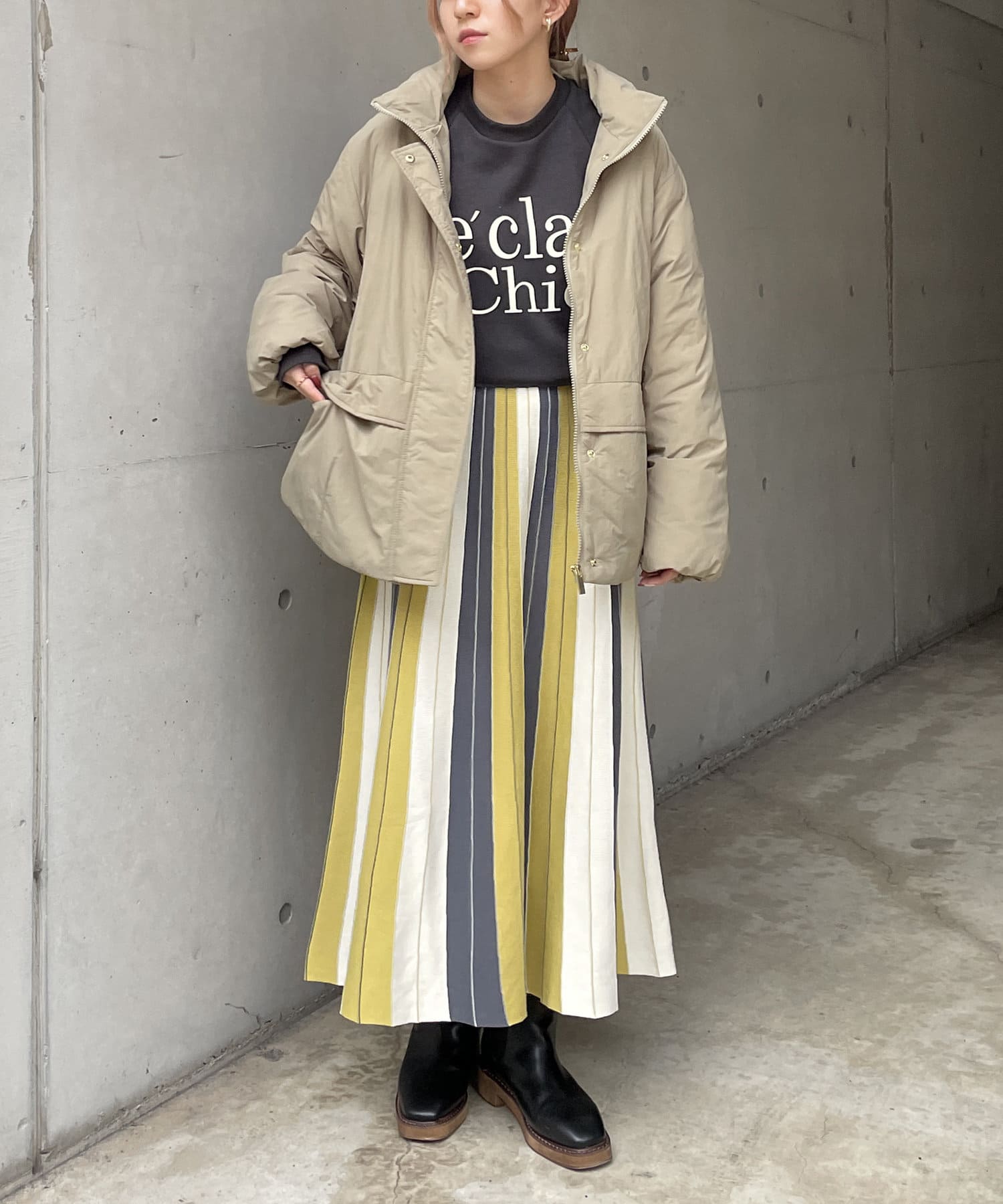 ニットでキレイめなスタイリングは勿論、スウェットやダウンでカジュアルダウンさせるのもおすすめです。