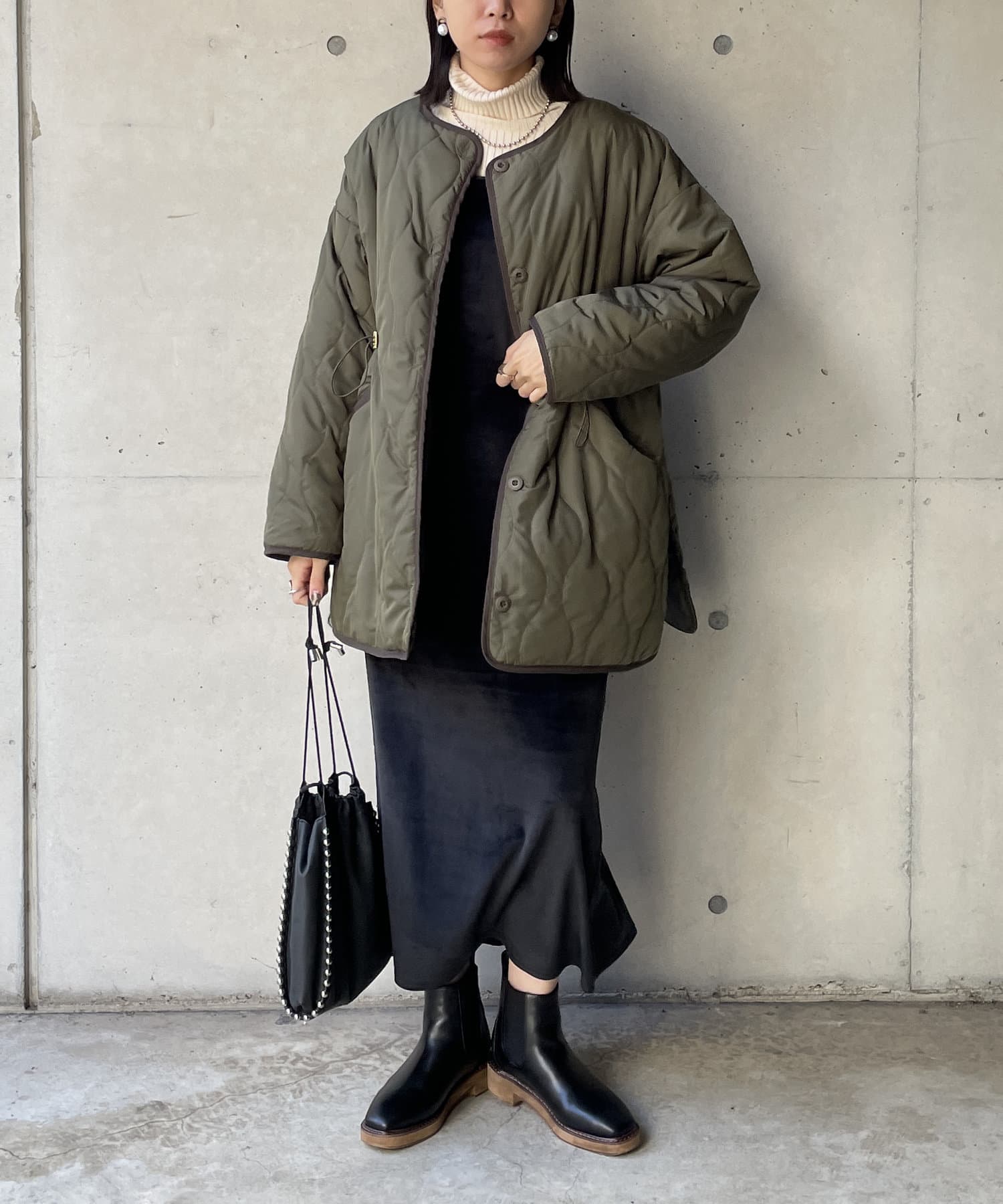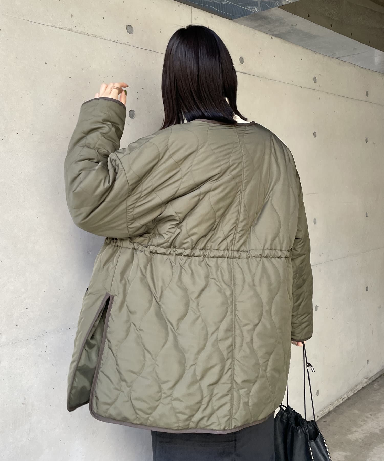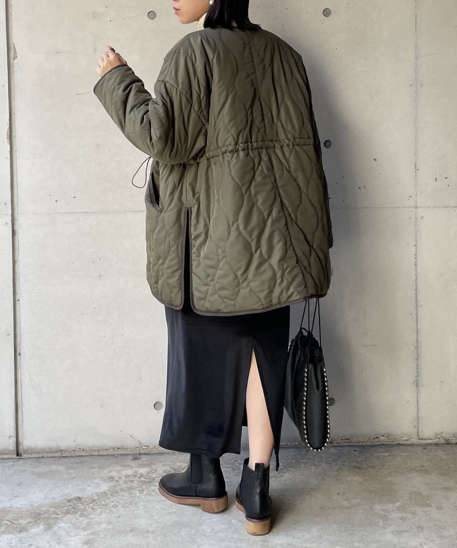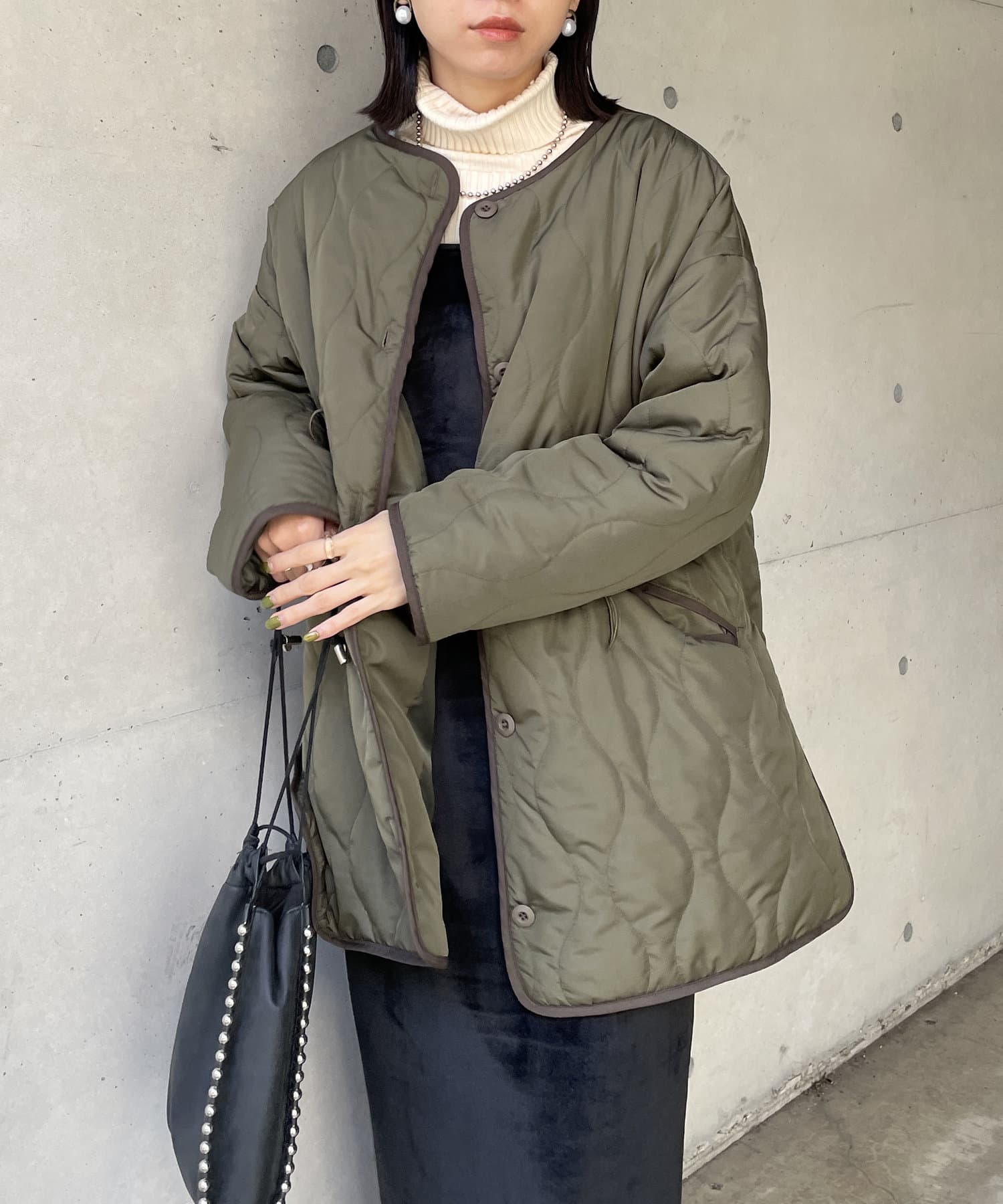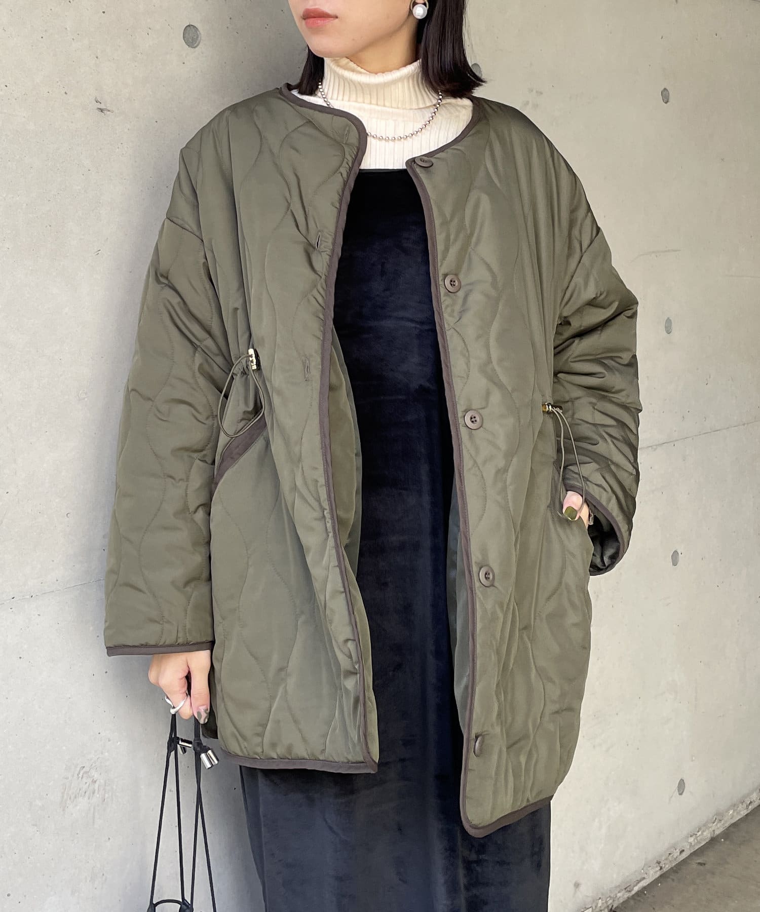 個性的デティールが目を引くキルティング中綿コート