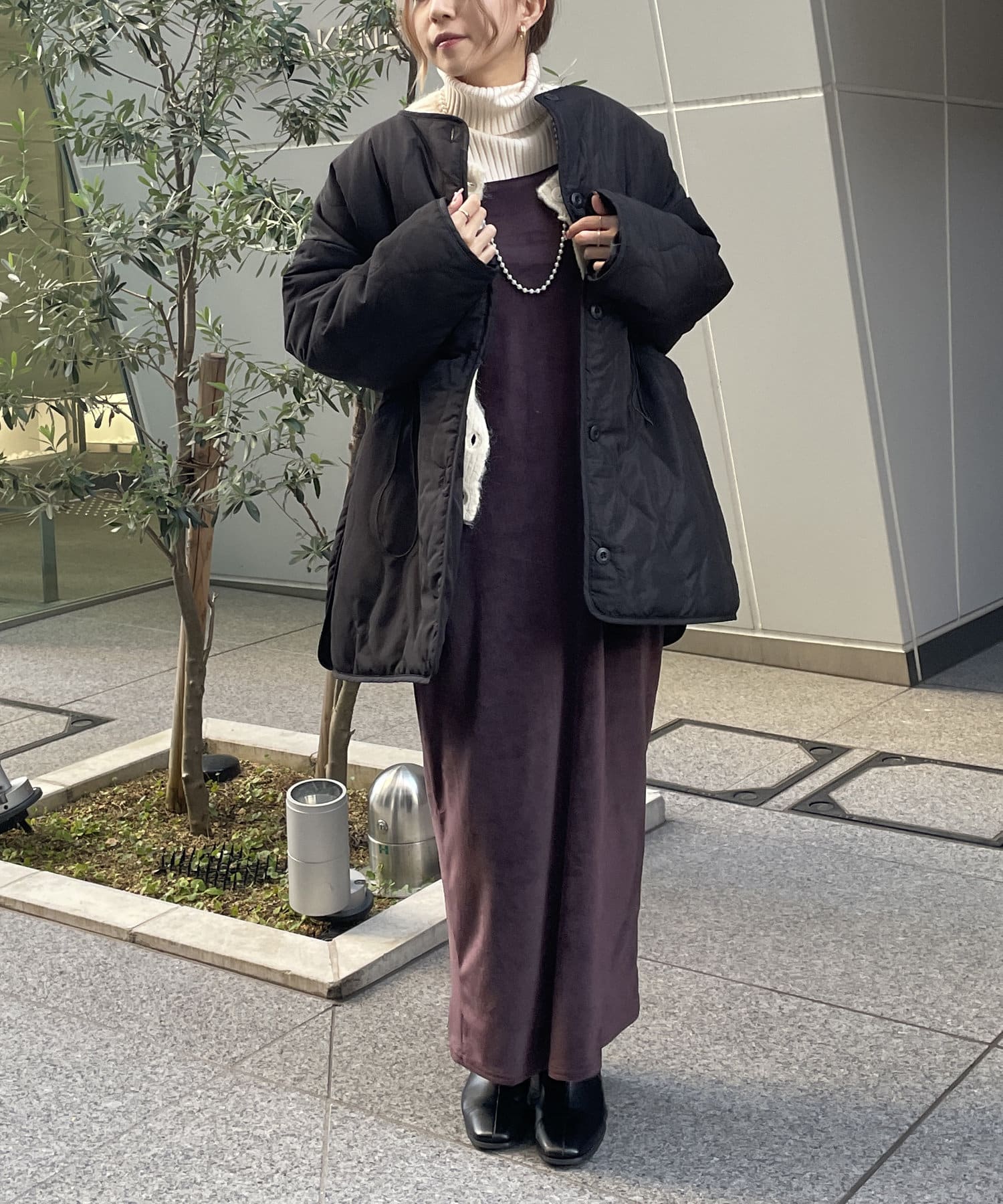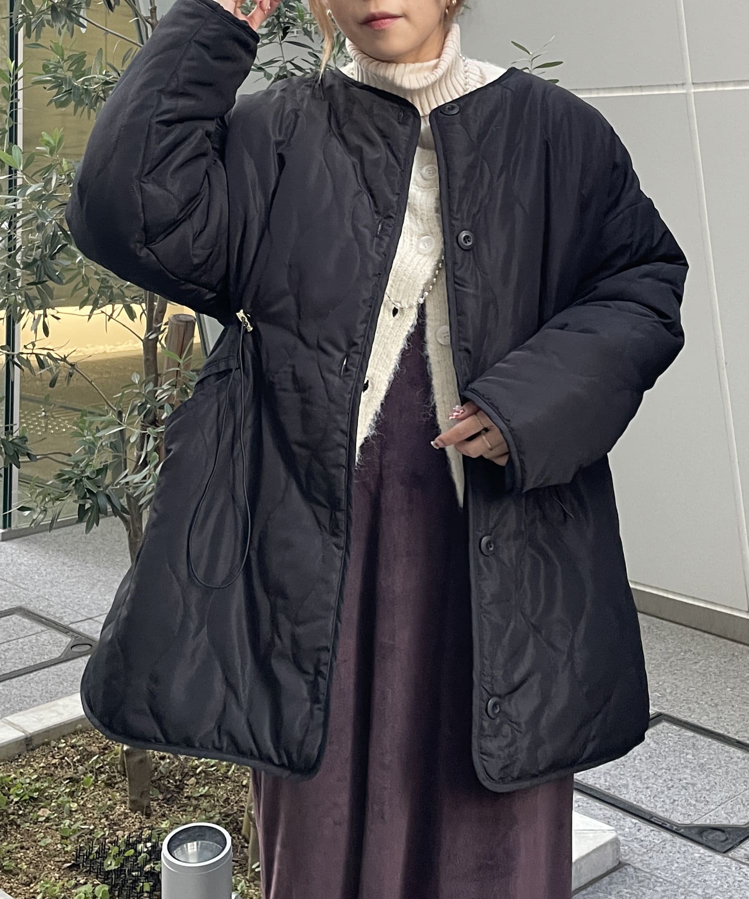 おしりまでしっかり隠れる丈感やスリット、金色の金具、小さめなマットなボタンなど色々気に入っています! また、最近は大きなポケットデザインが表面から見える物も多く見ますが、表がシンプルなデザインなので、軽いのにカジュアルすぎず大人っぽく着れるキルティングアウターだと思います◎!