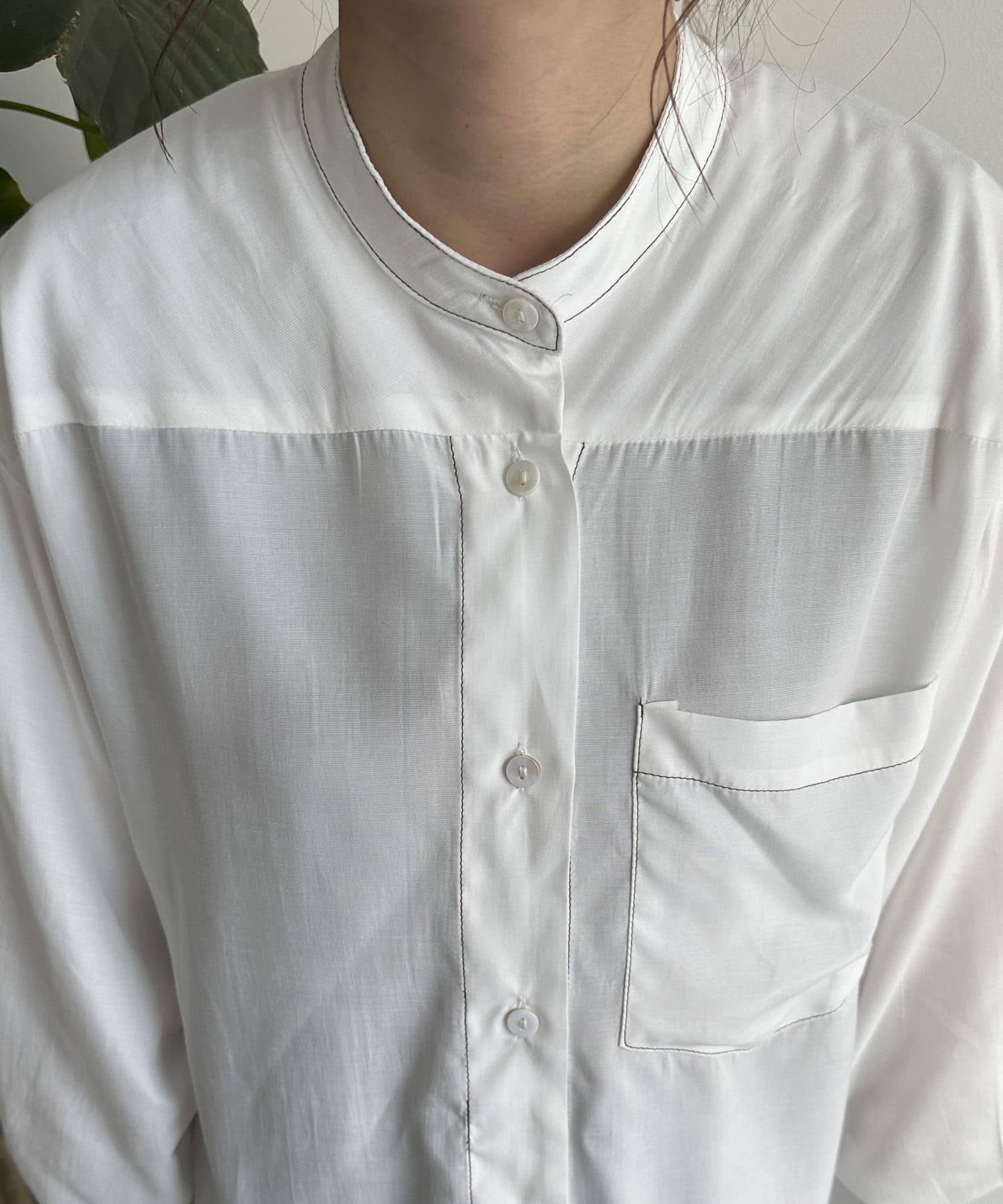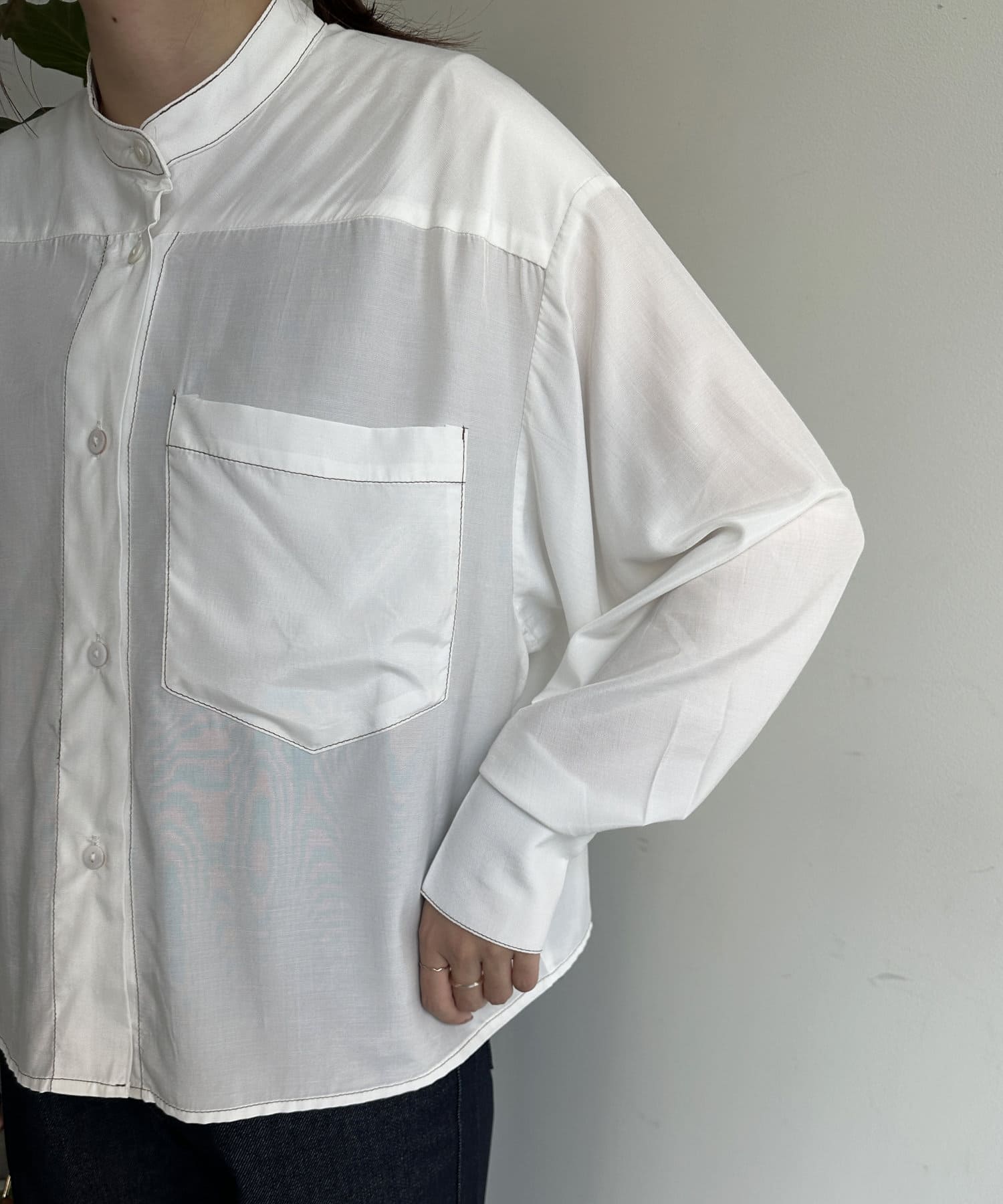 配色ステッチ短丈バンドカラーシャツ
