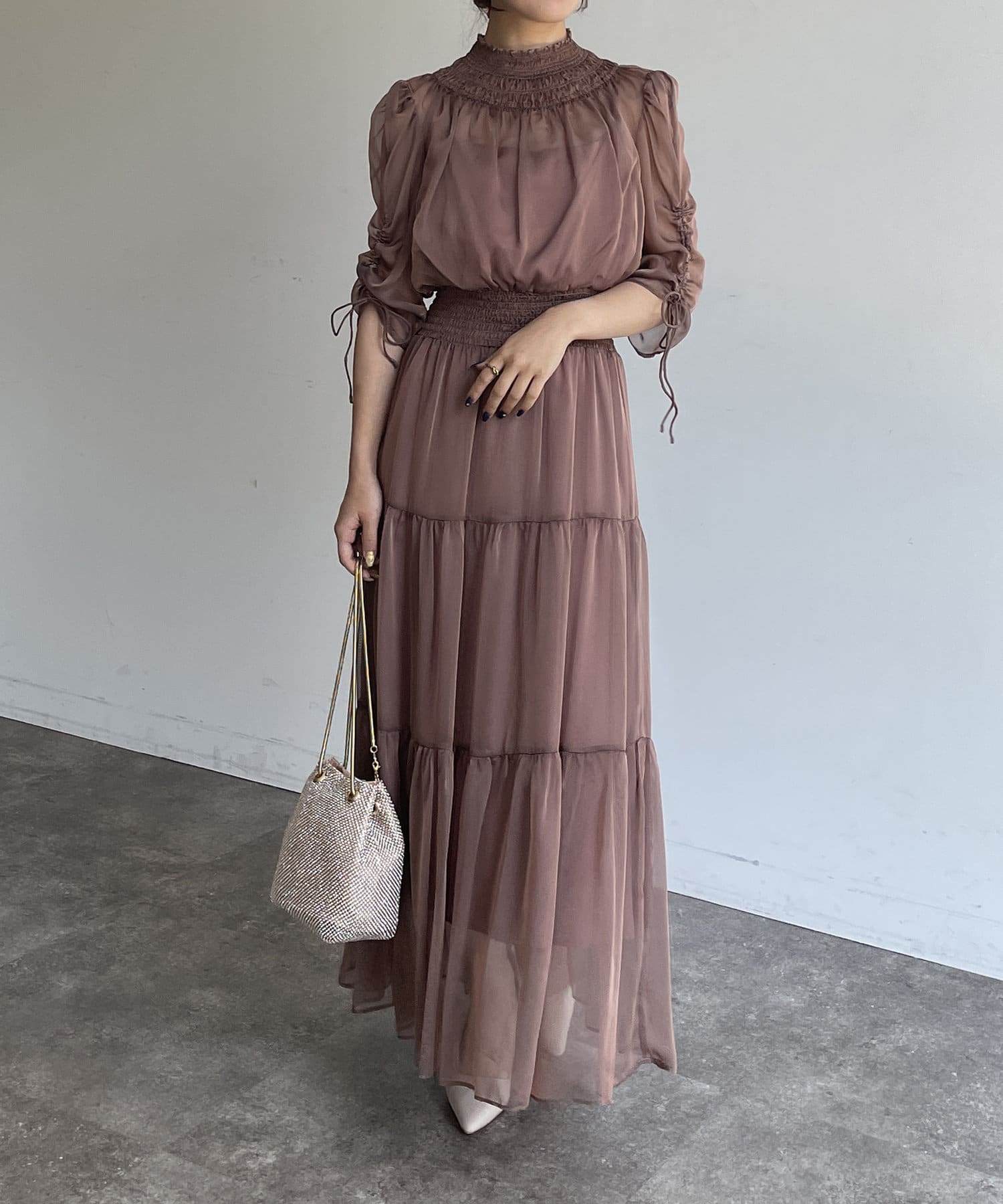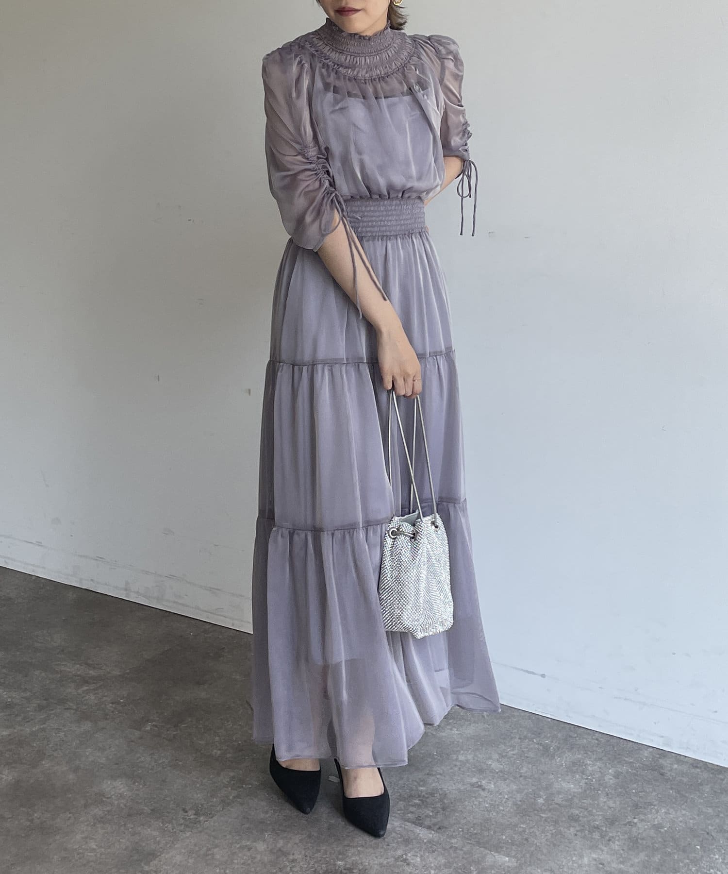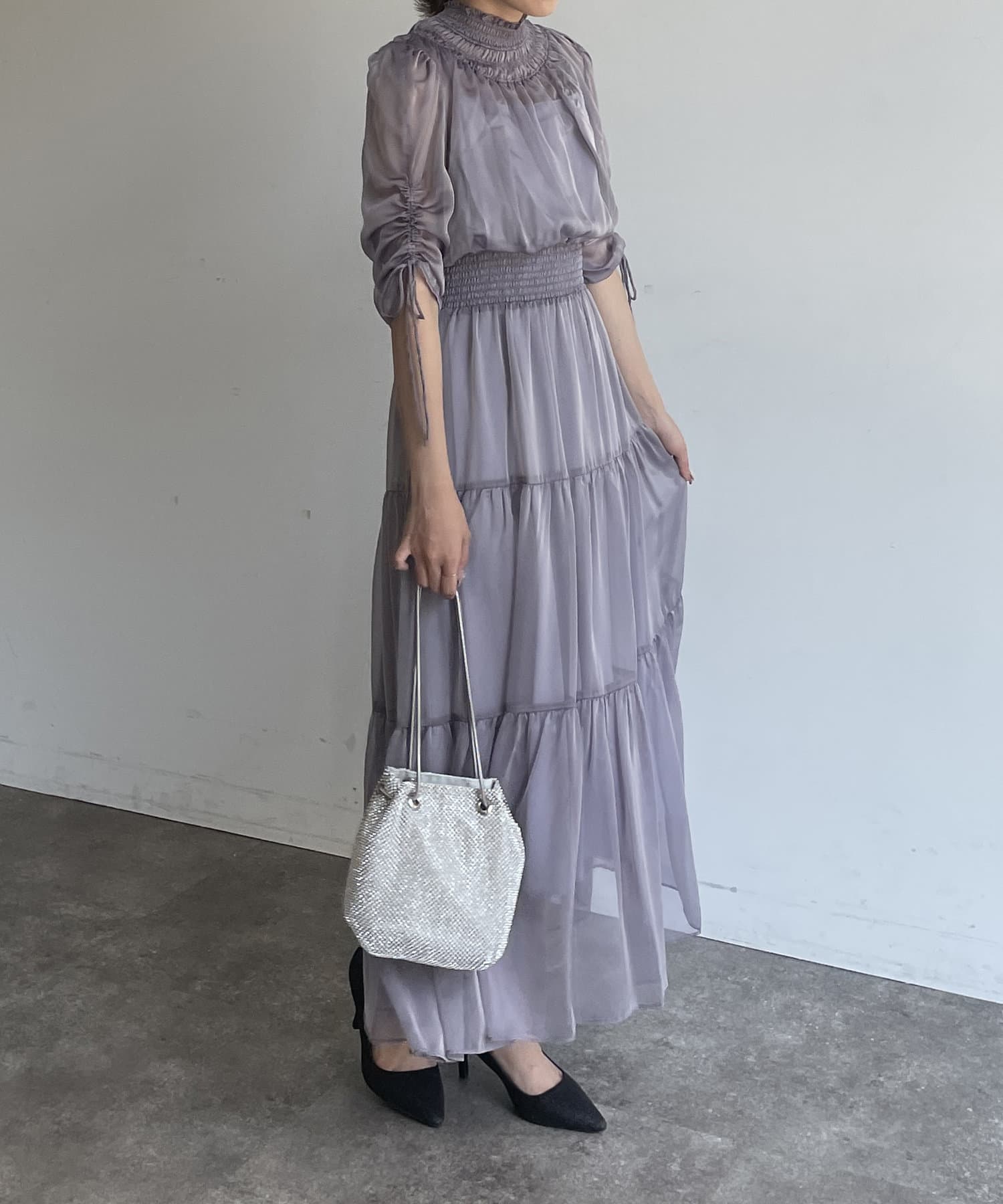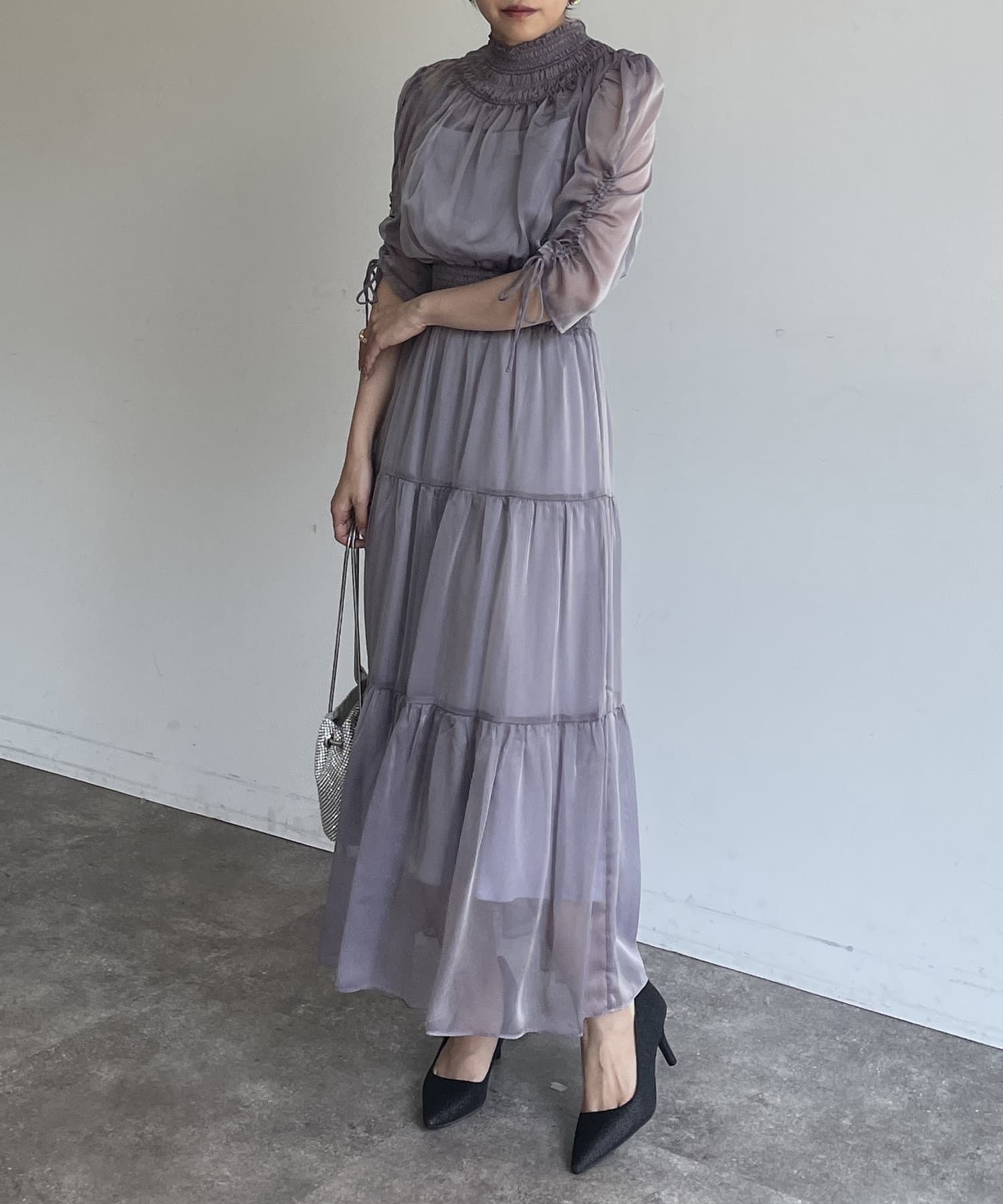 【オケージョン】袖シャーリングハイネックティアードワンピース