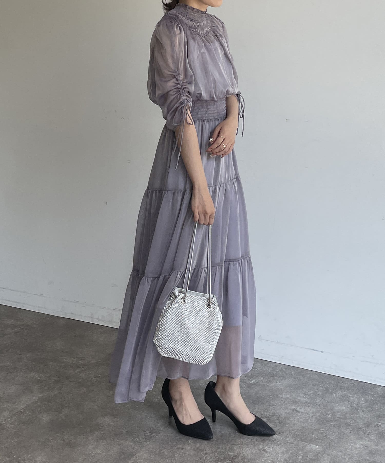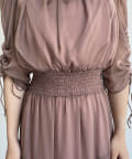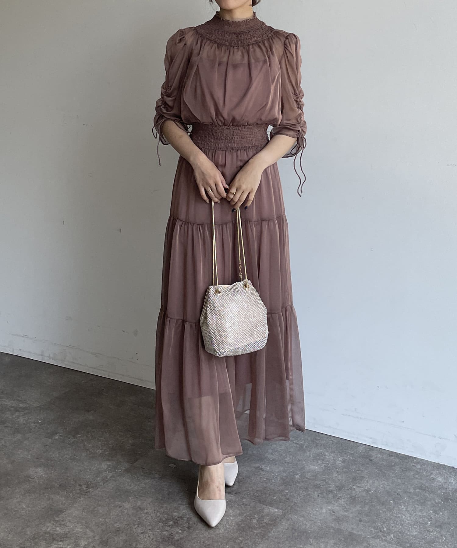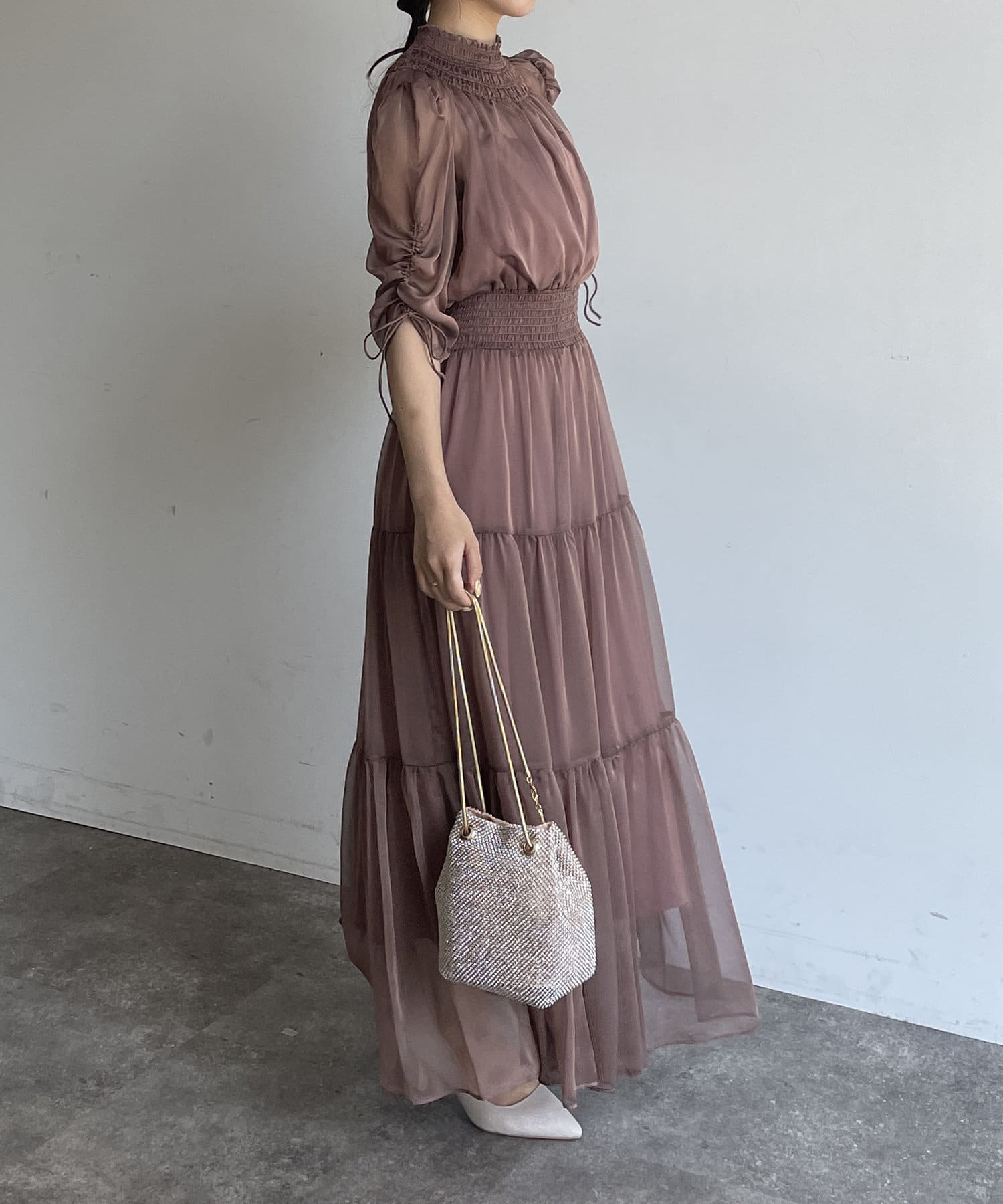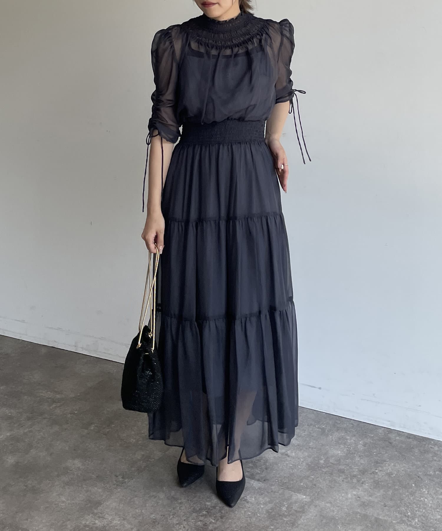 【オケージョン】袖シャーリングハイネックティアードワンピース