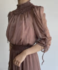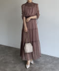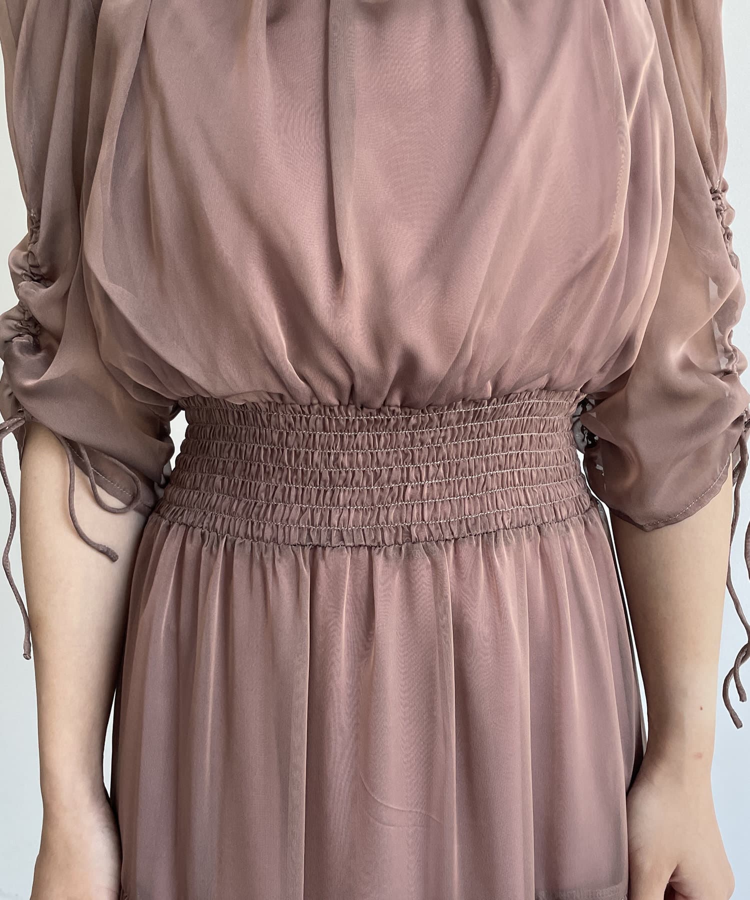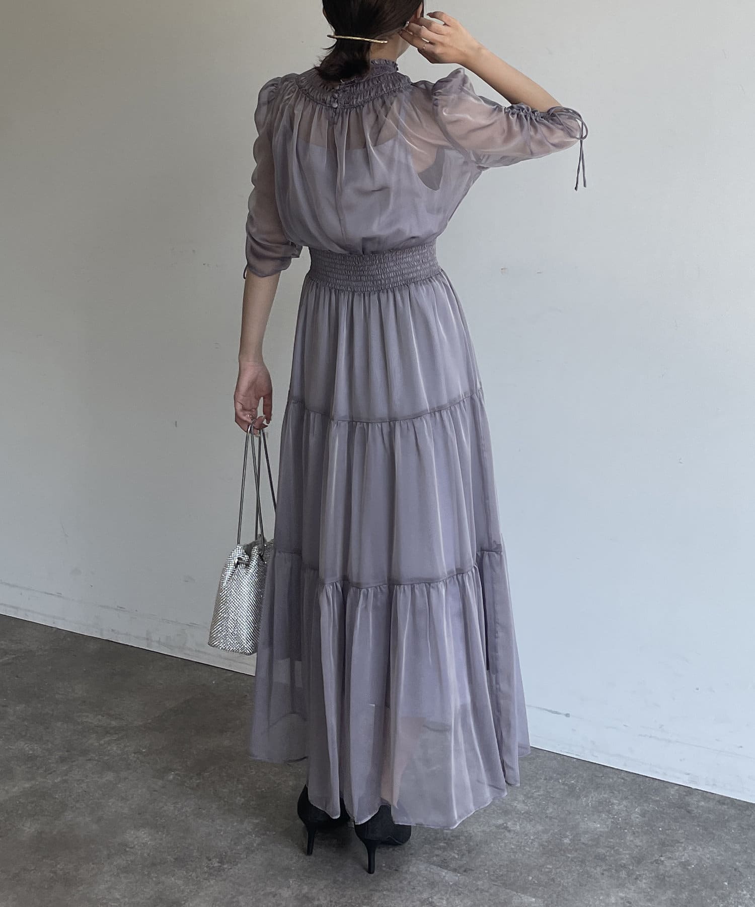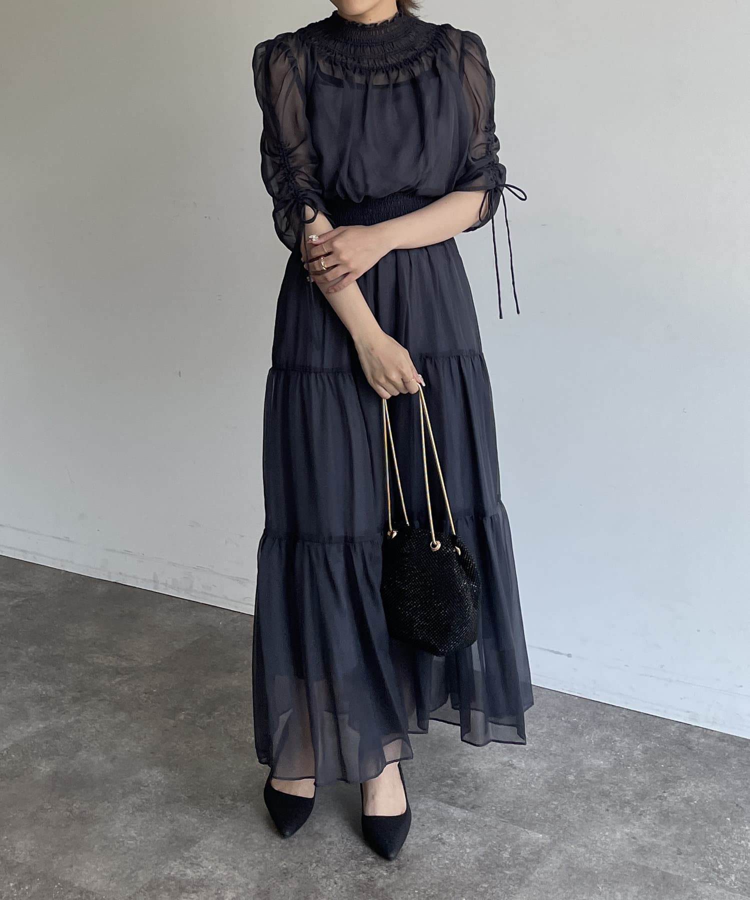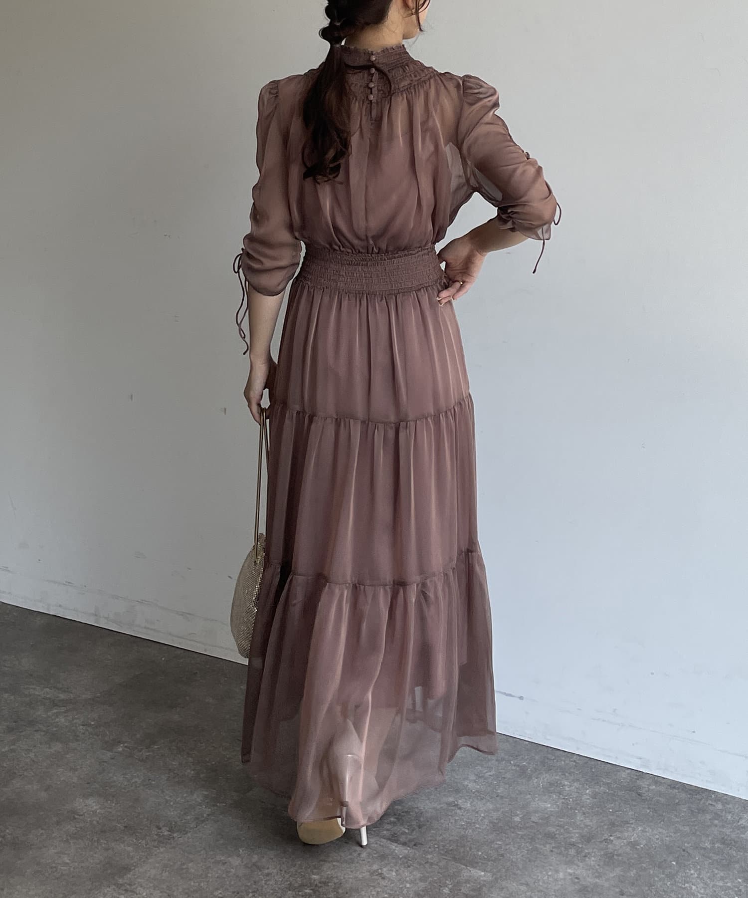 【オケージョン】袖シャーリングハイネックティアードワンピース