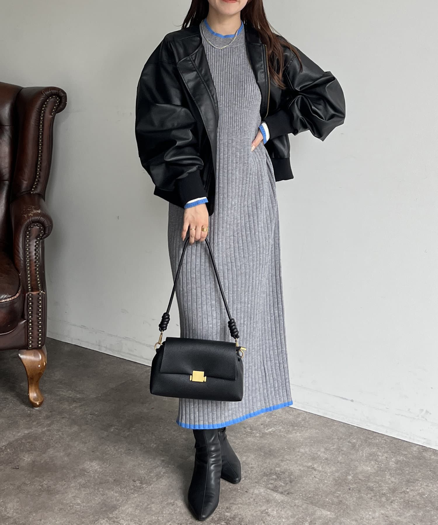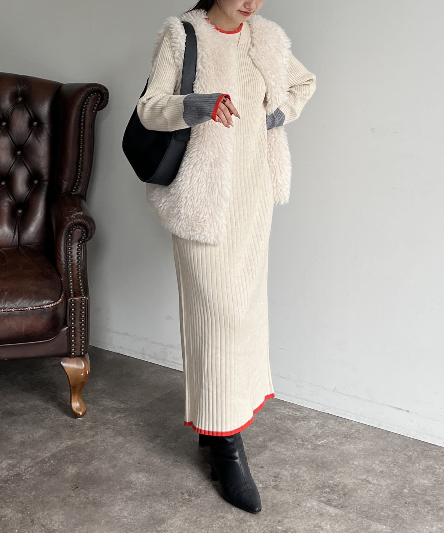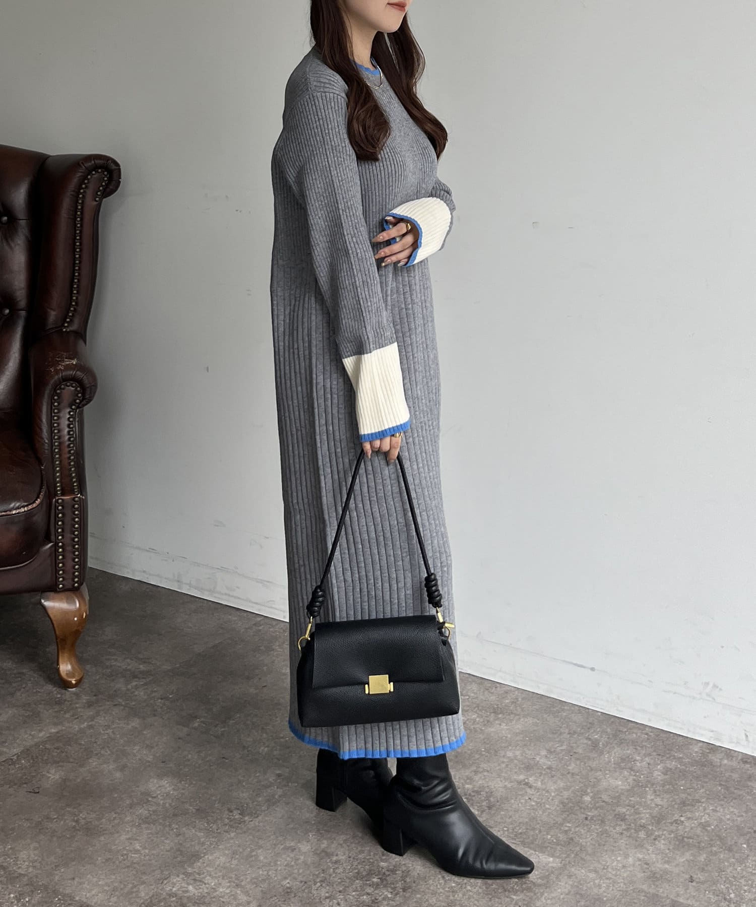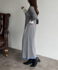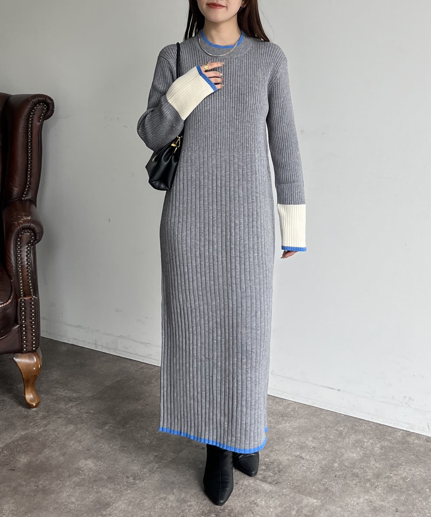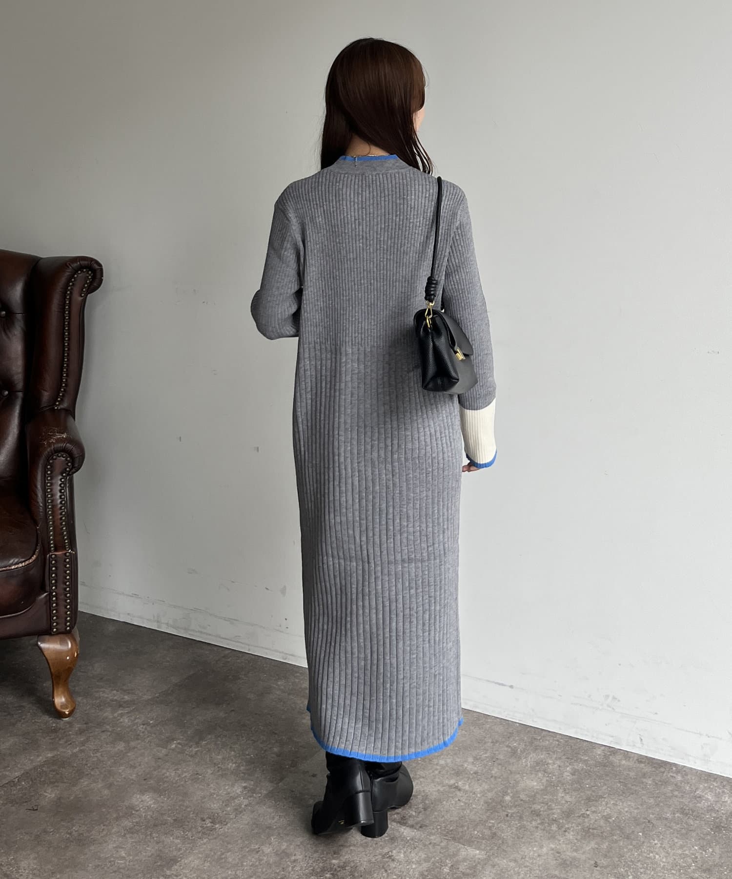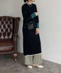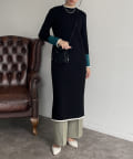 袖配色ラインリブニットワンピース