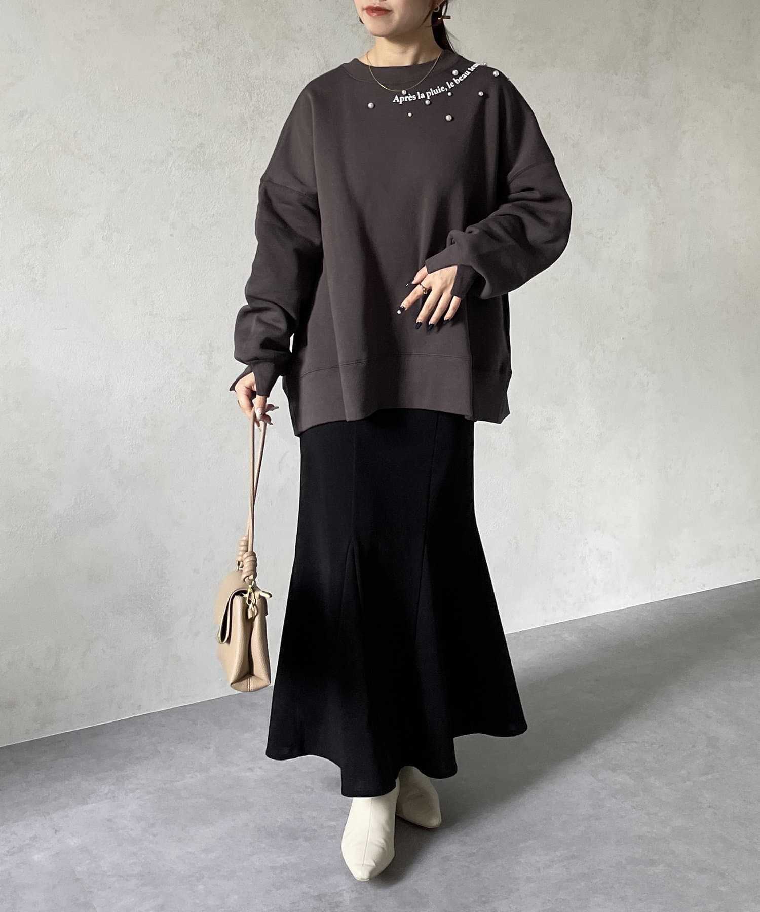 グレー希望でしたが完売。オフホワイトは汚れそうですが合わせやすそう。裏起毛で暖かく、さりげないロゴとパールが可愛いです。