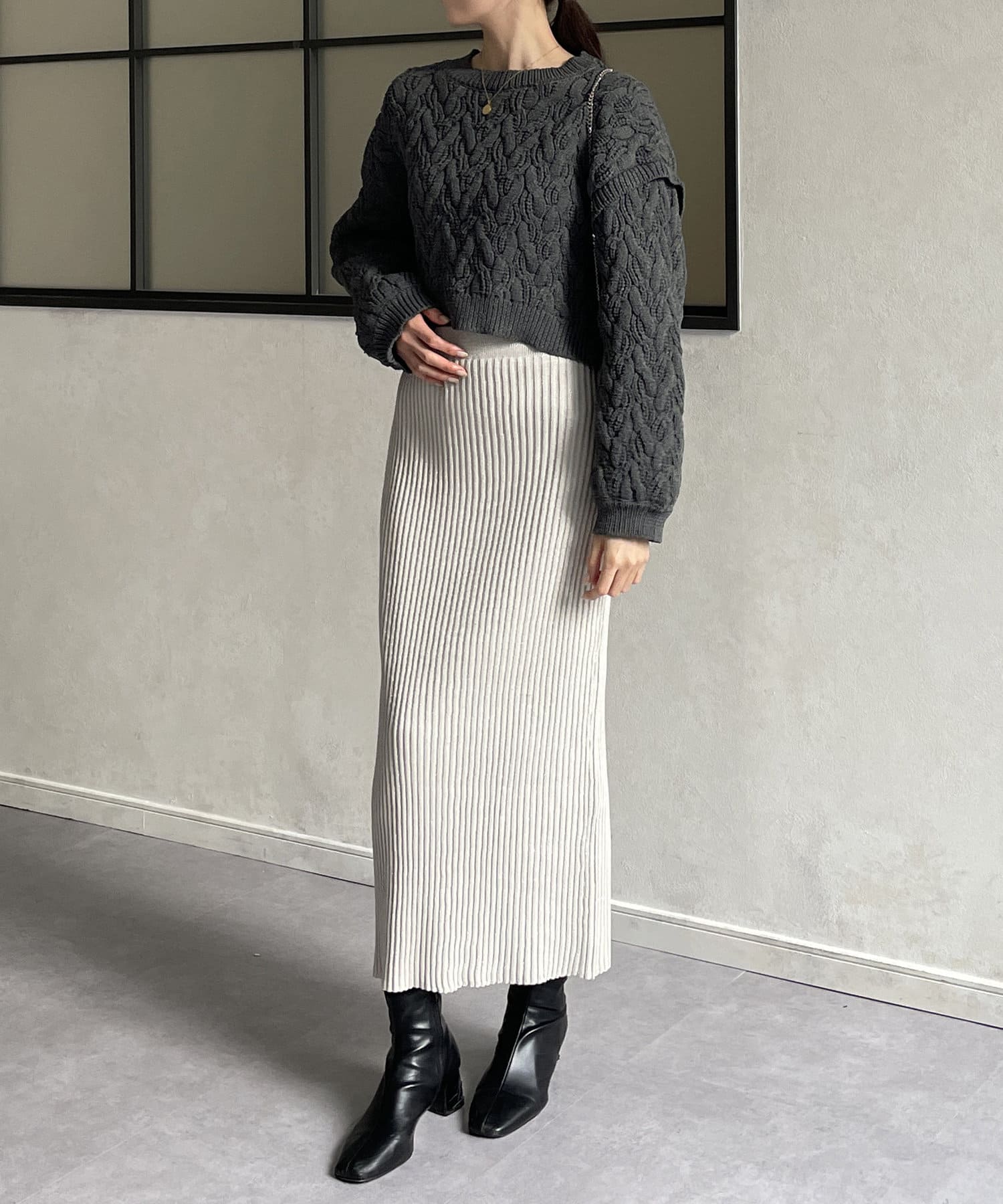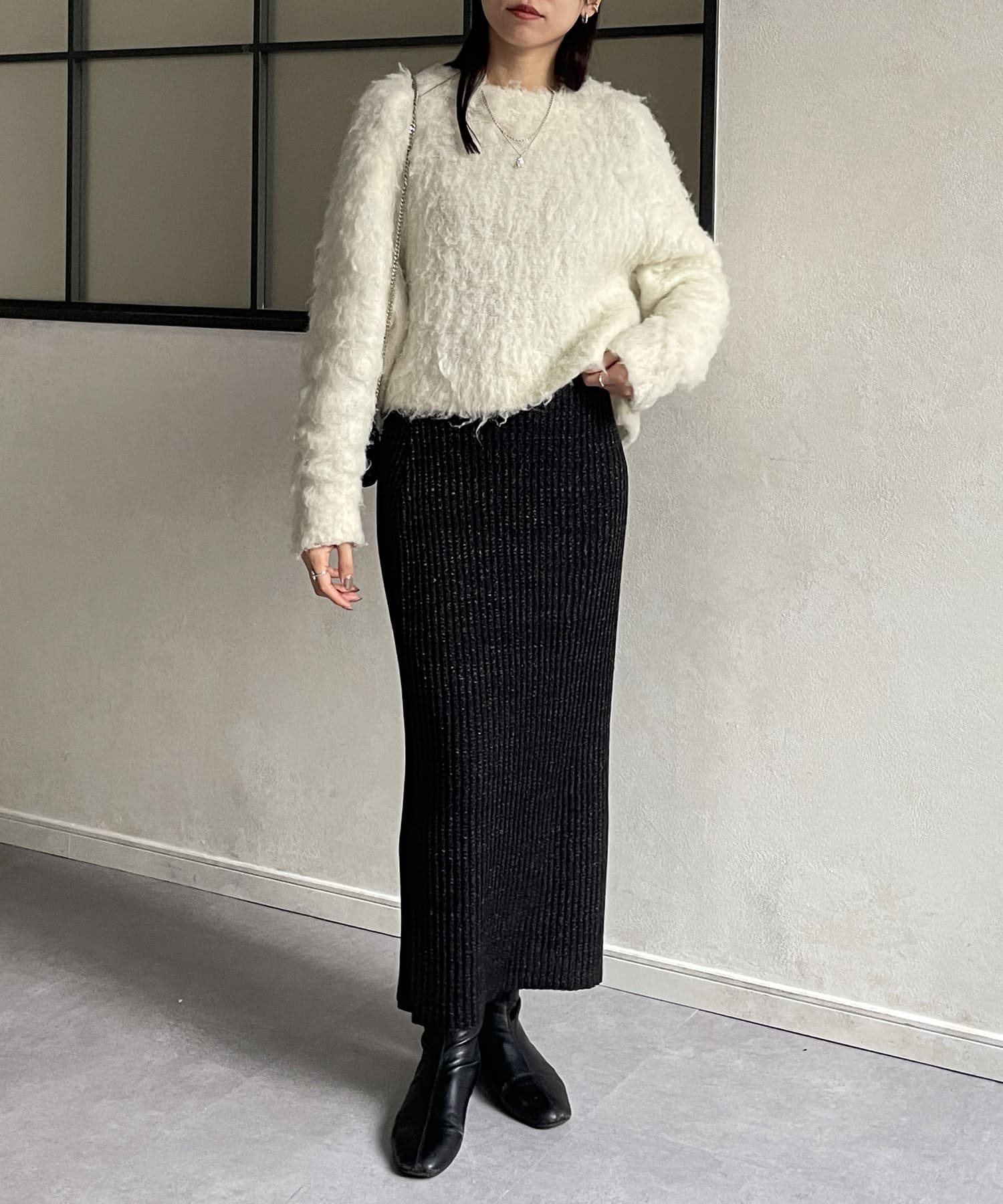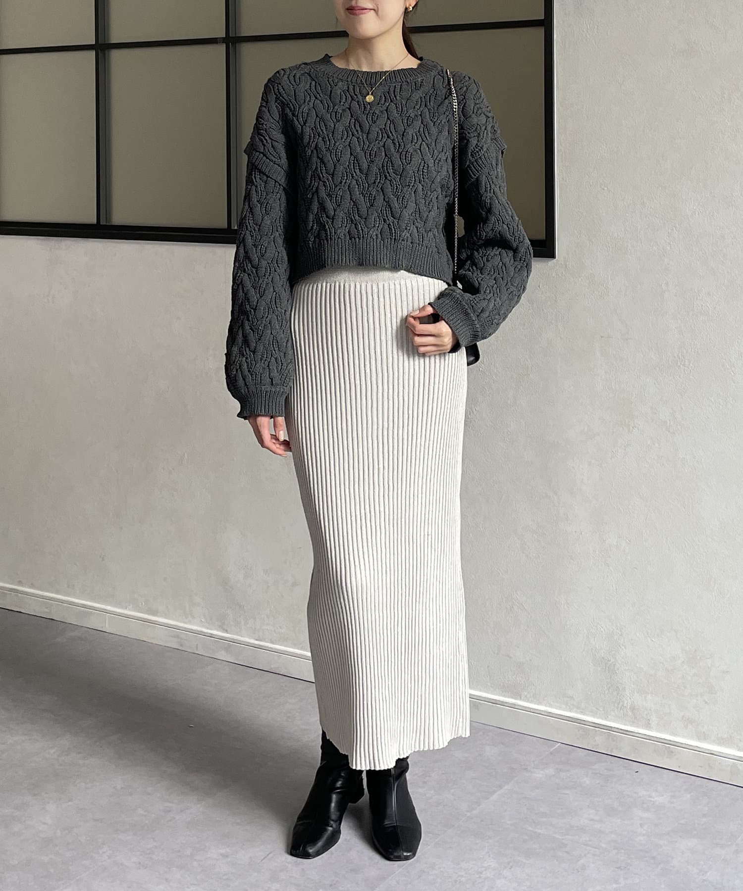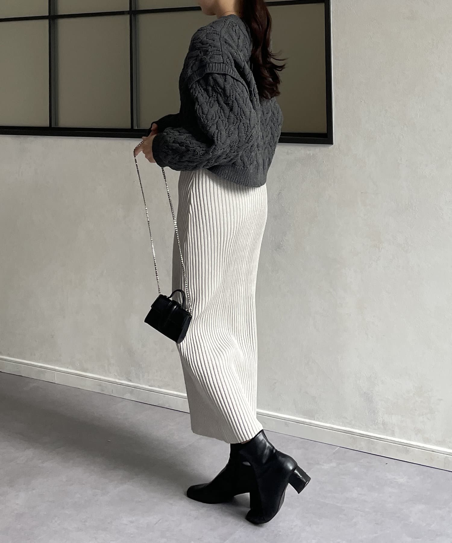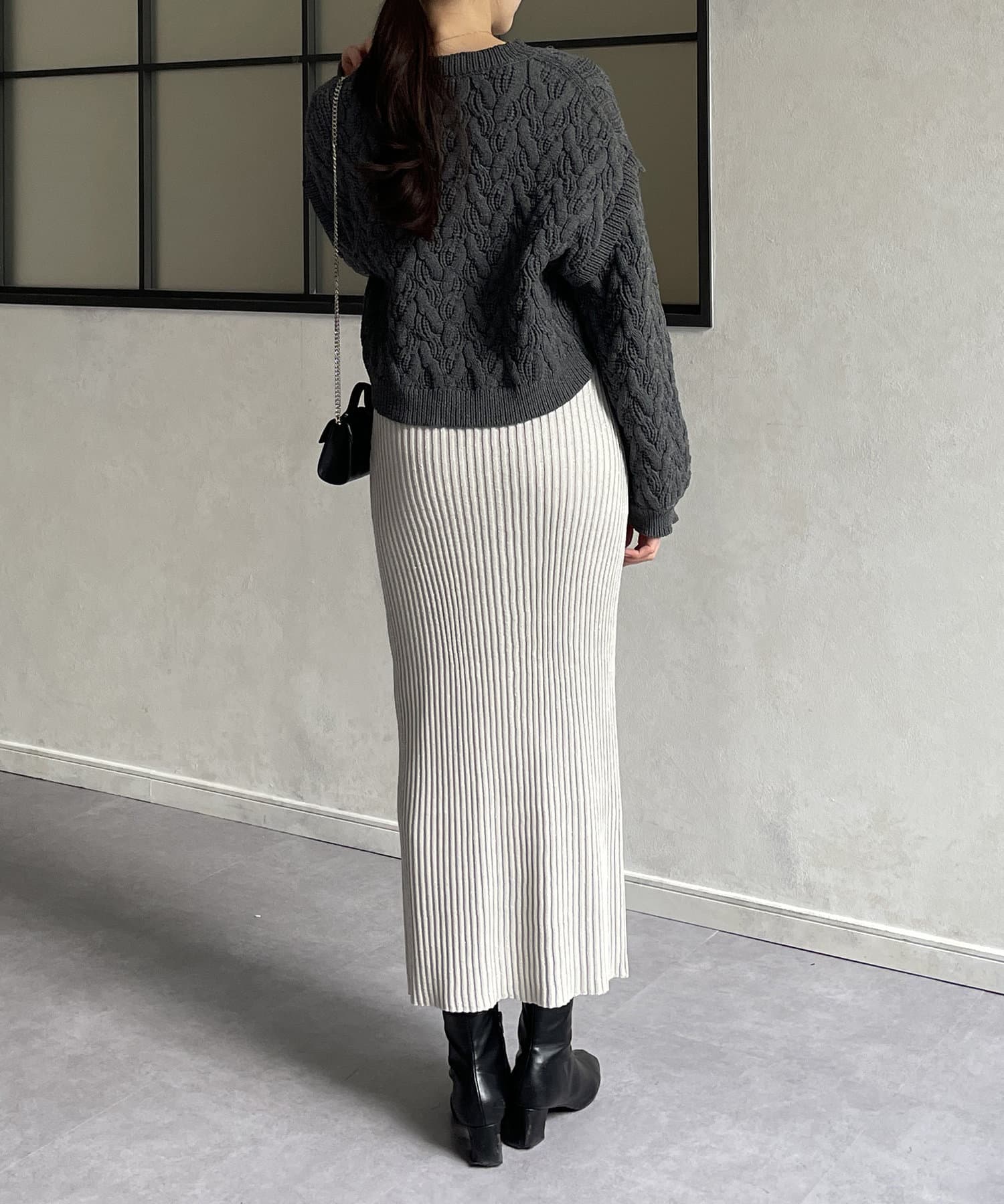 ・ナローシルエットとリブニットの縦ラインでスタイルアップ効果◎