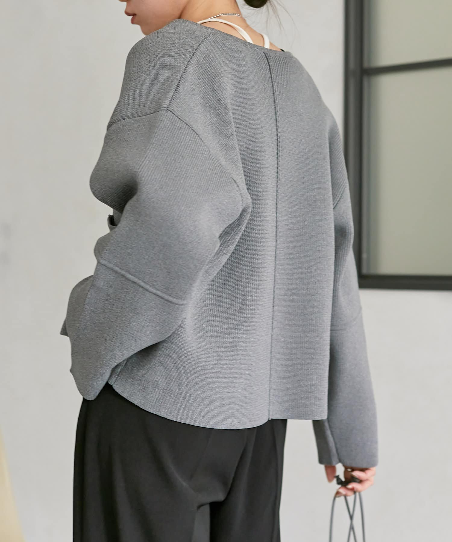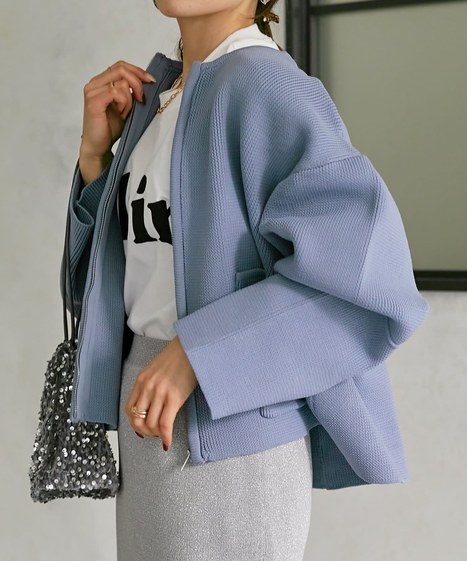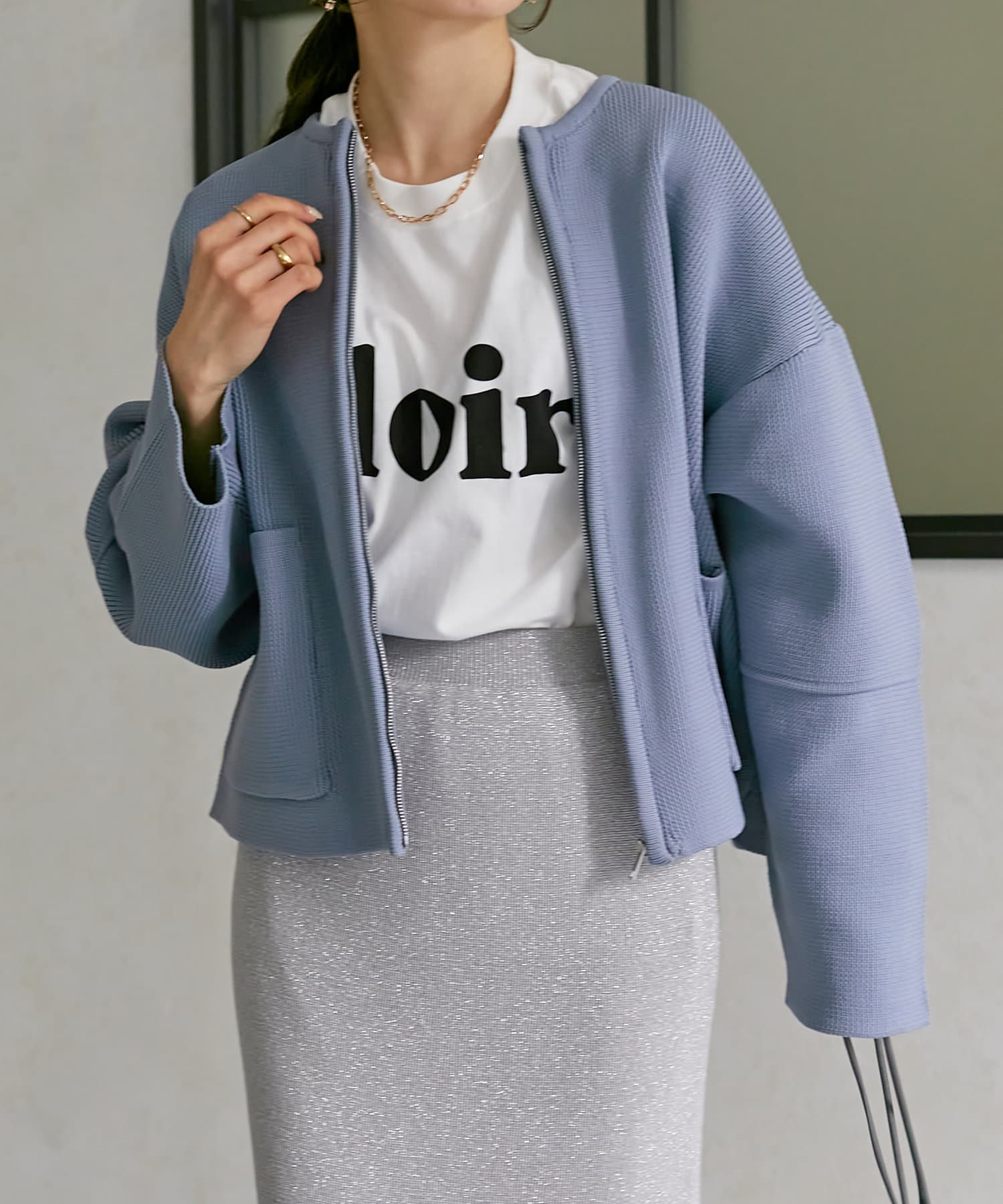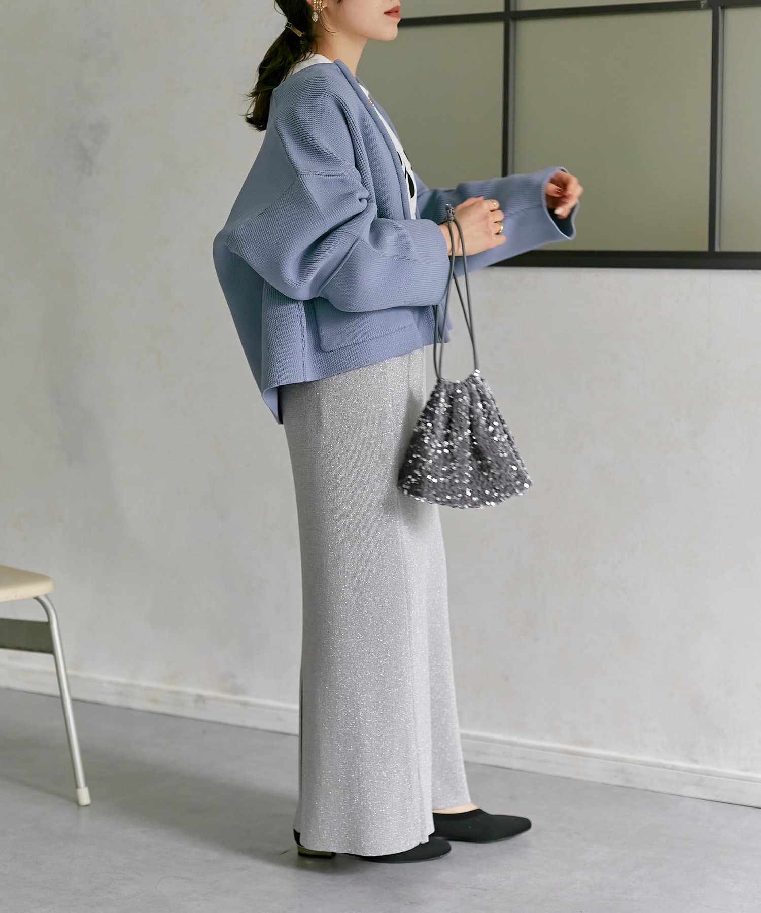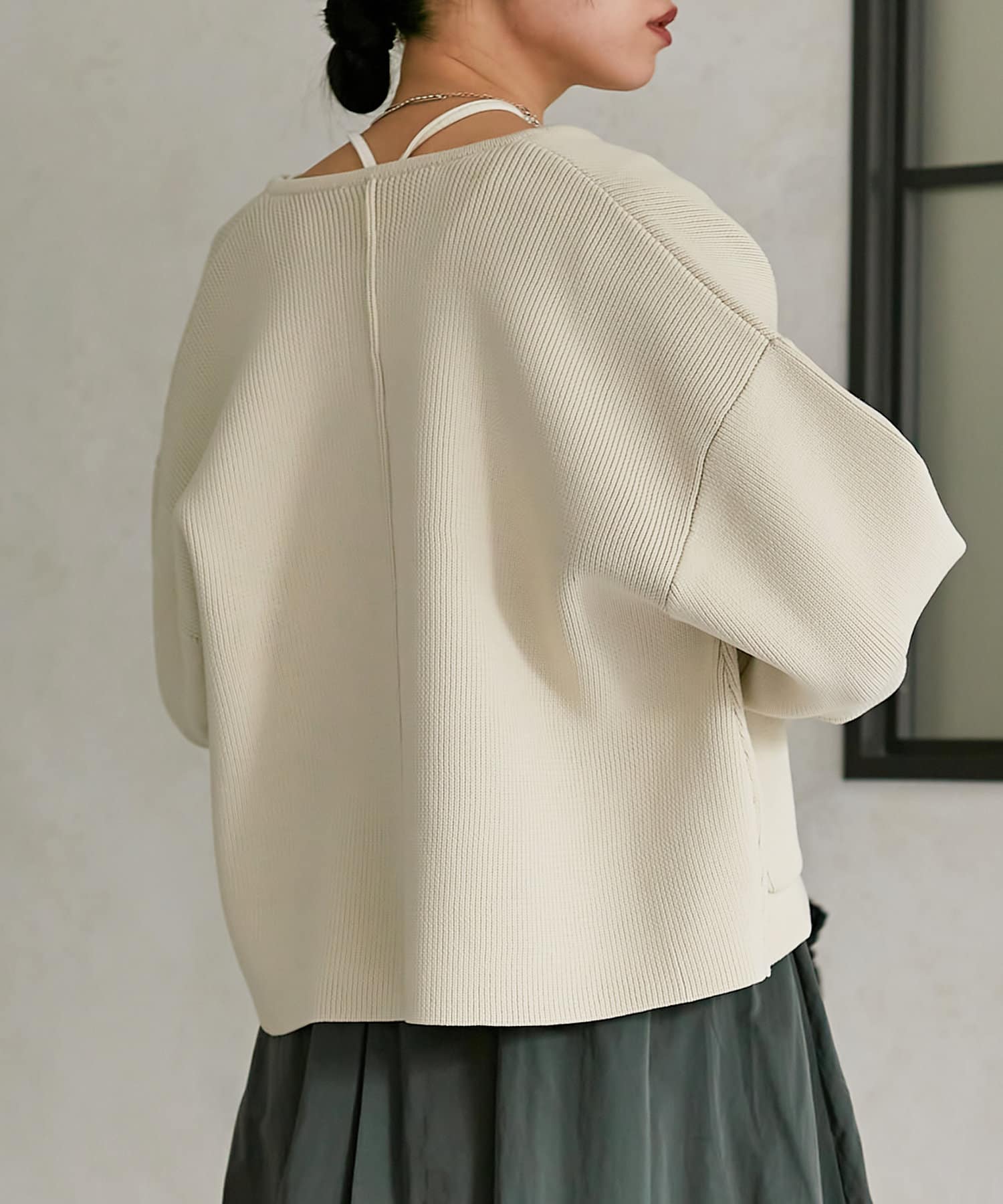 程よい丈感なので、ナロースカートやフレアデニムなどすっきりとしたボトムスに