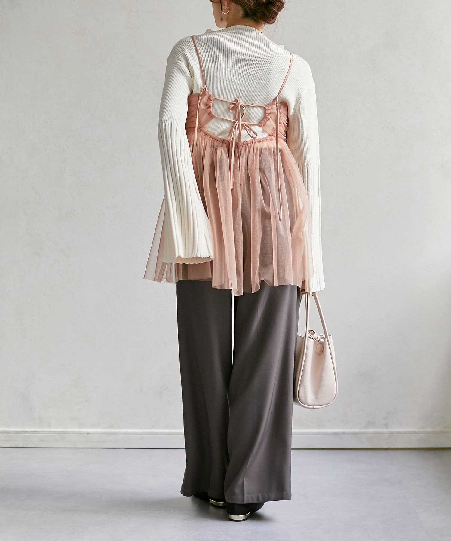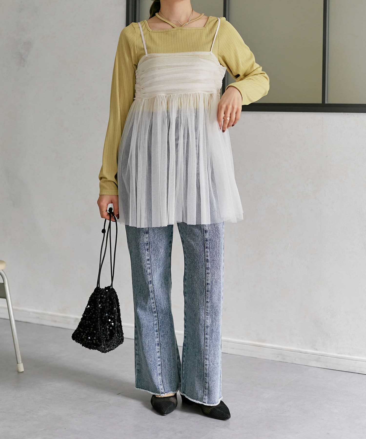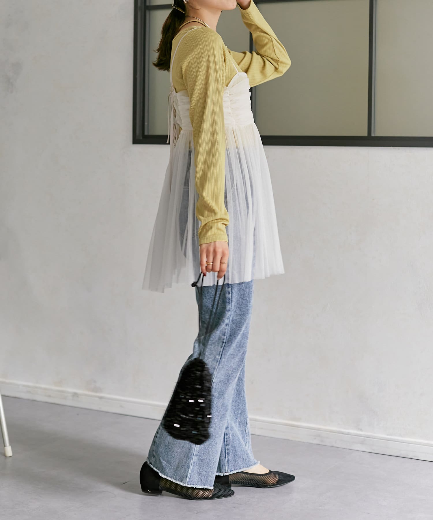 ・リブニットやカットソーなどすっきりとしたトップスにレイヤードし、