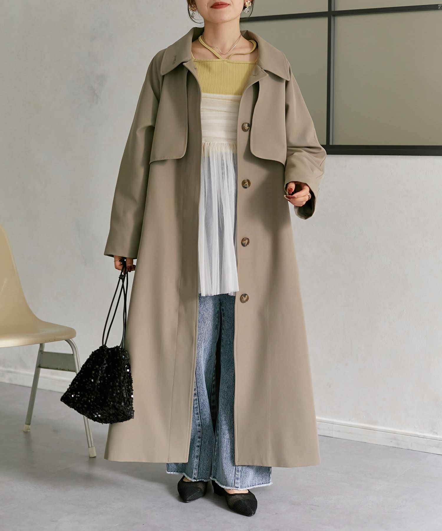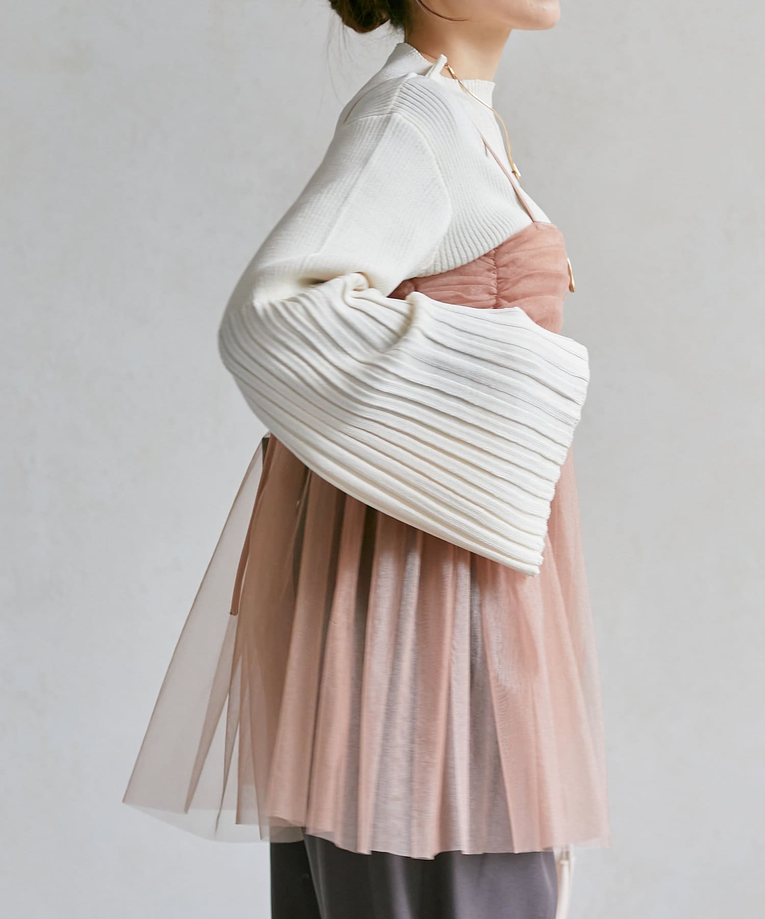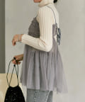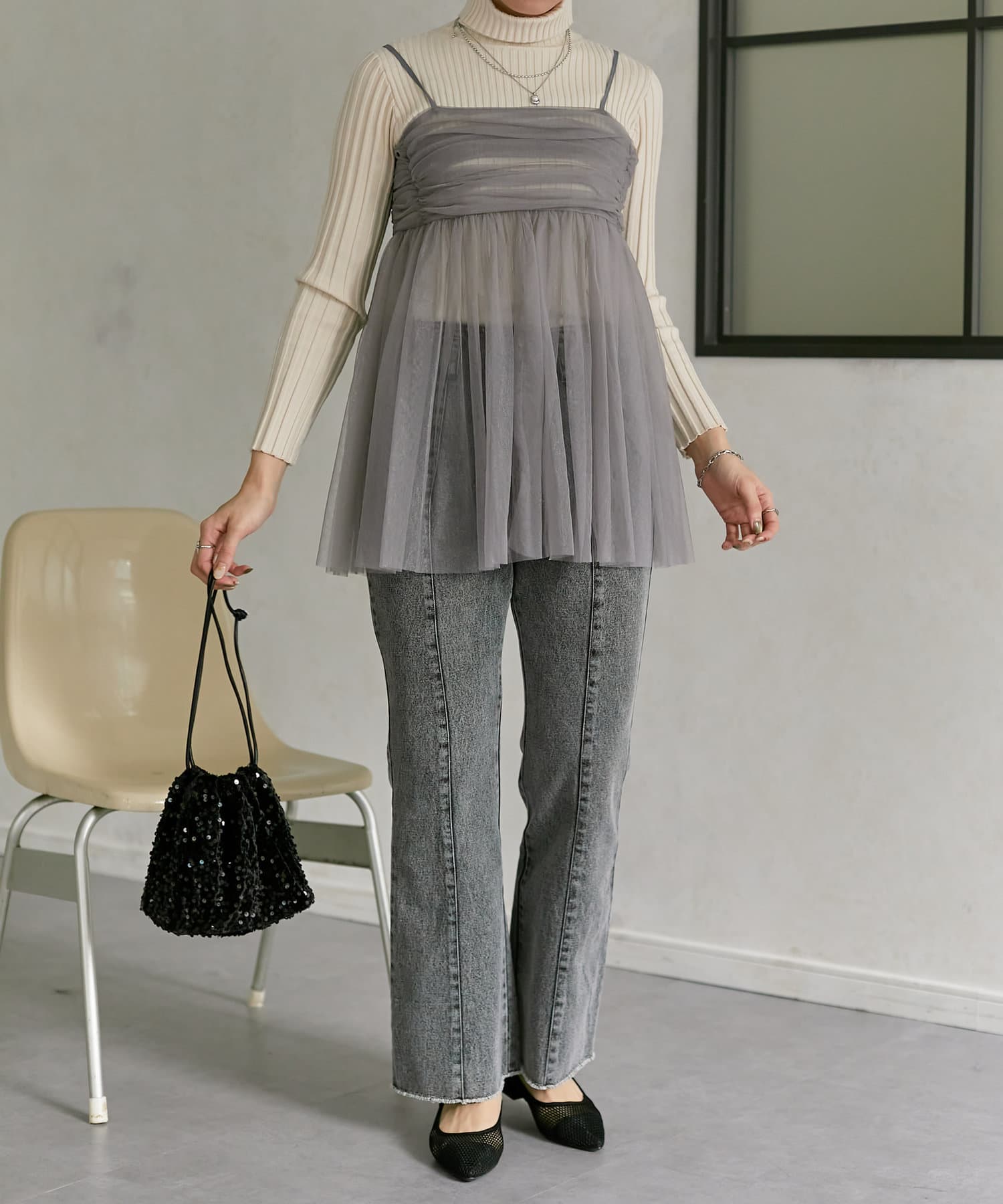 ・リブニットやカットソーなどすっきりとしたトップスにレイヤードし、