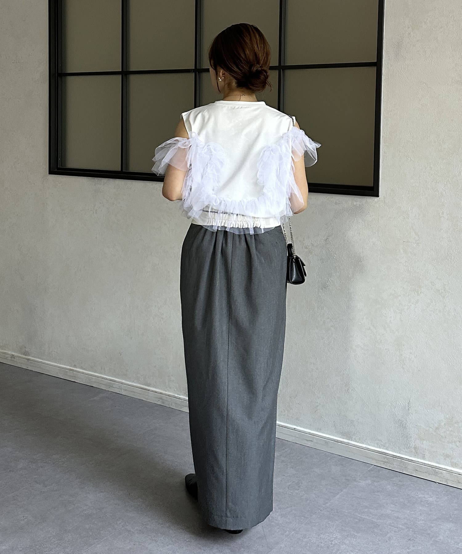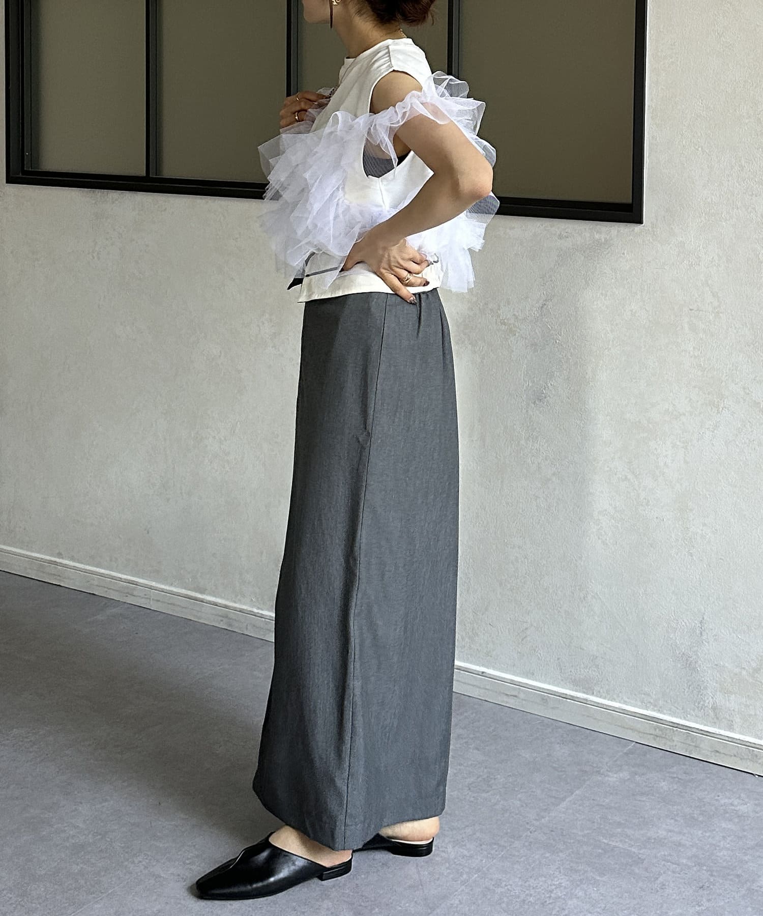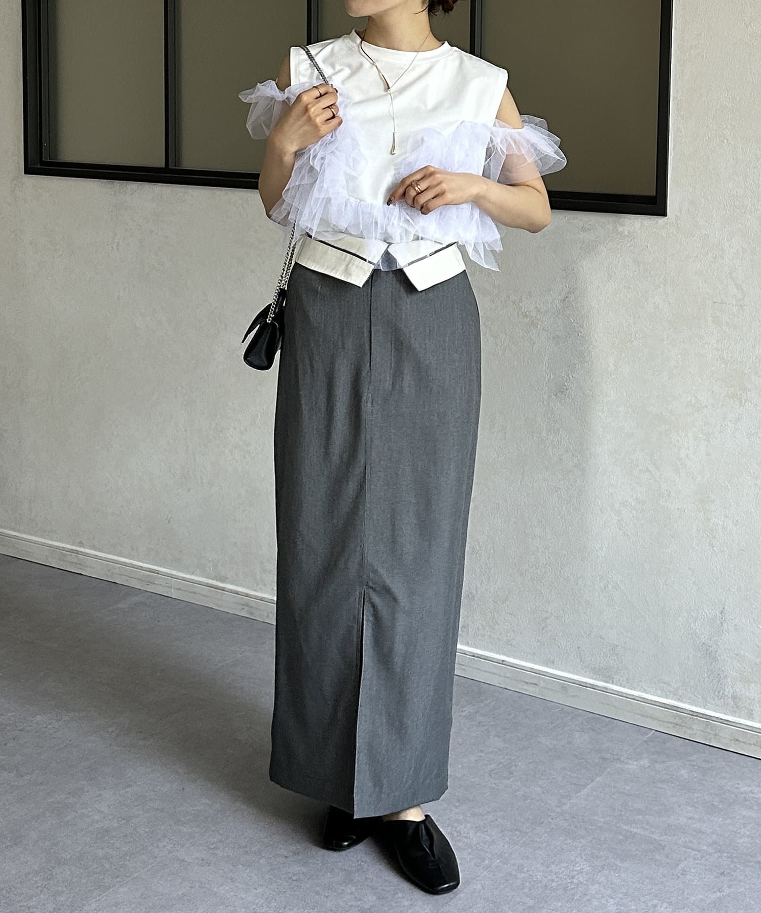 ・ウエストのデザインが特徴なので、折り返してインしやすいニットやブラウスと