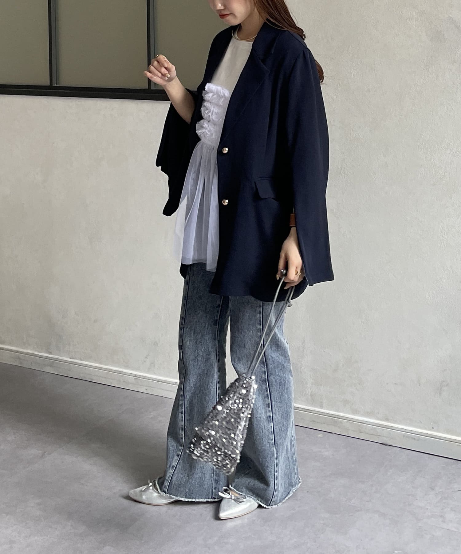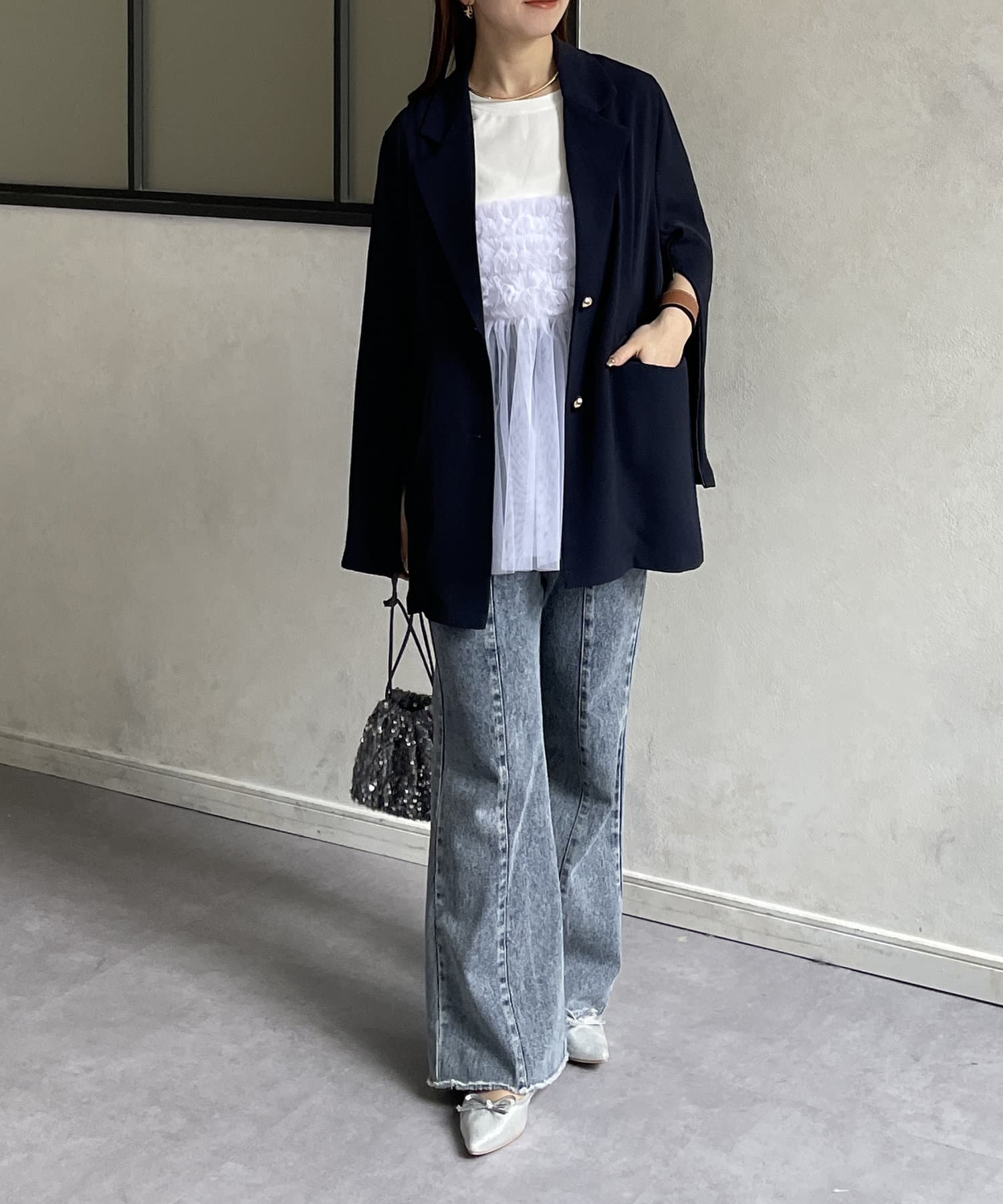 ・デニムで合わせるとカジュアルに、スラックスやテーパードパンツと