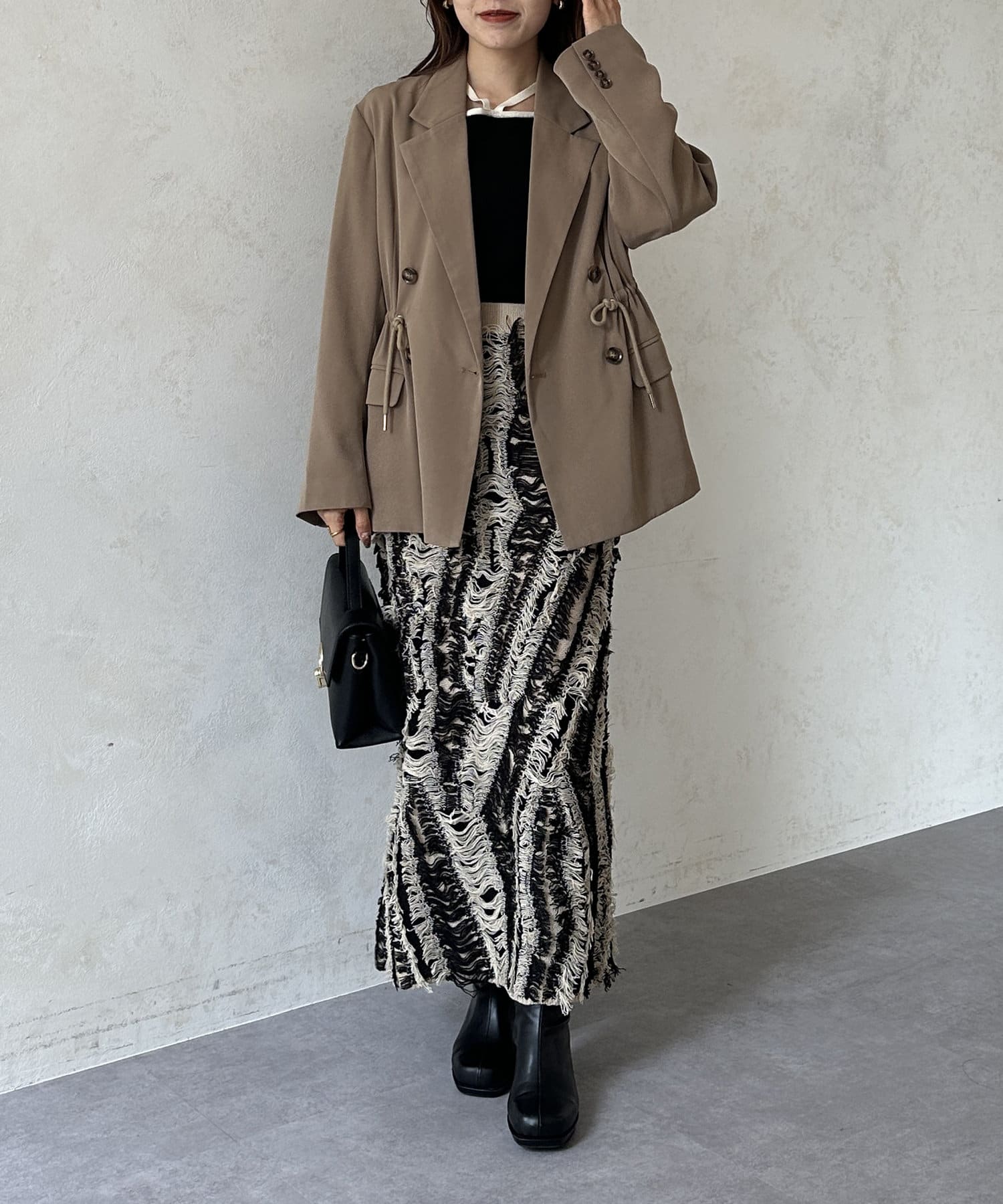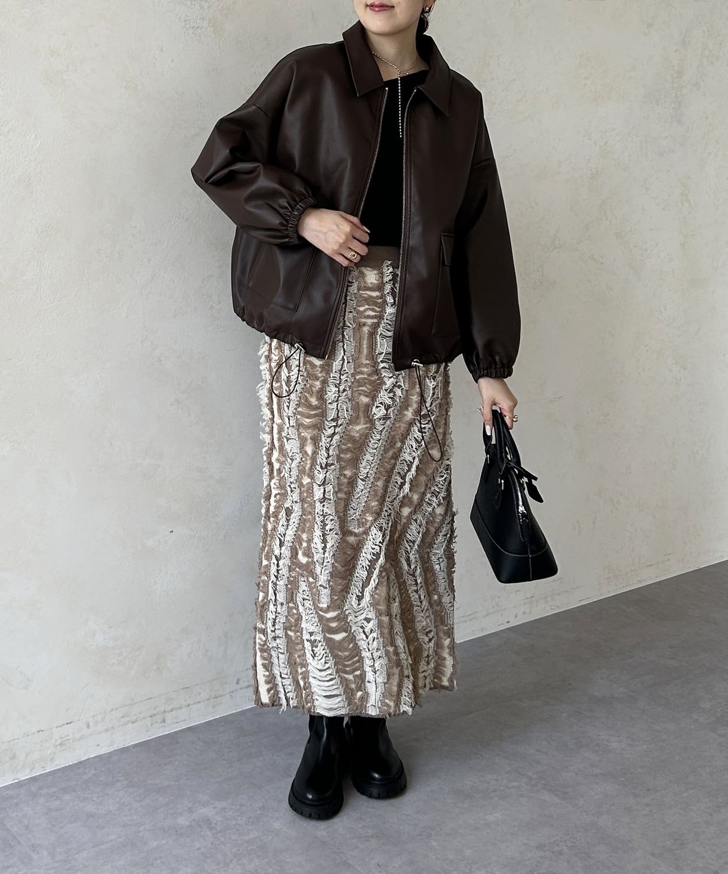 アウターを合わせると腰回りをカバーしてすっきりとした印象に。