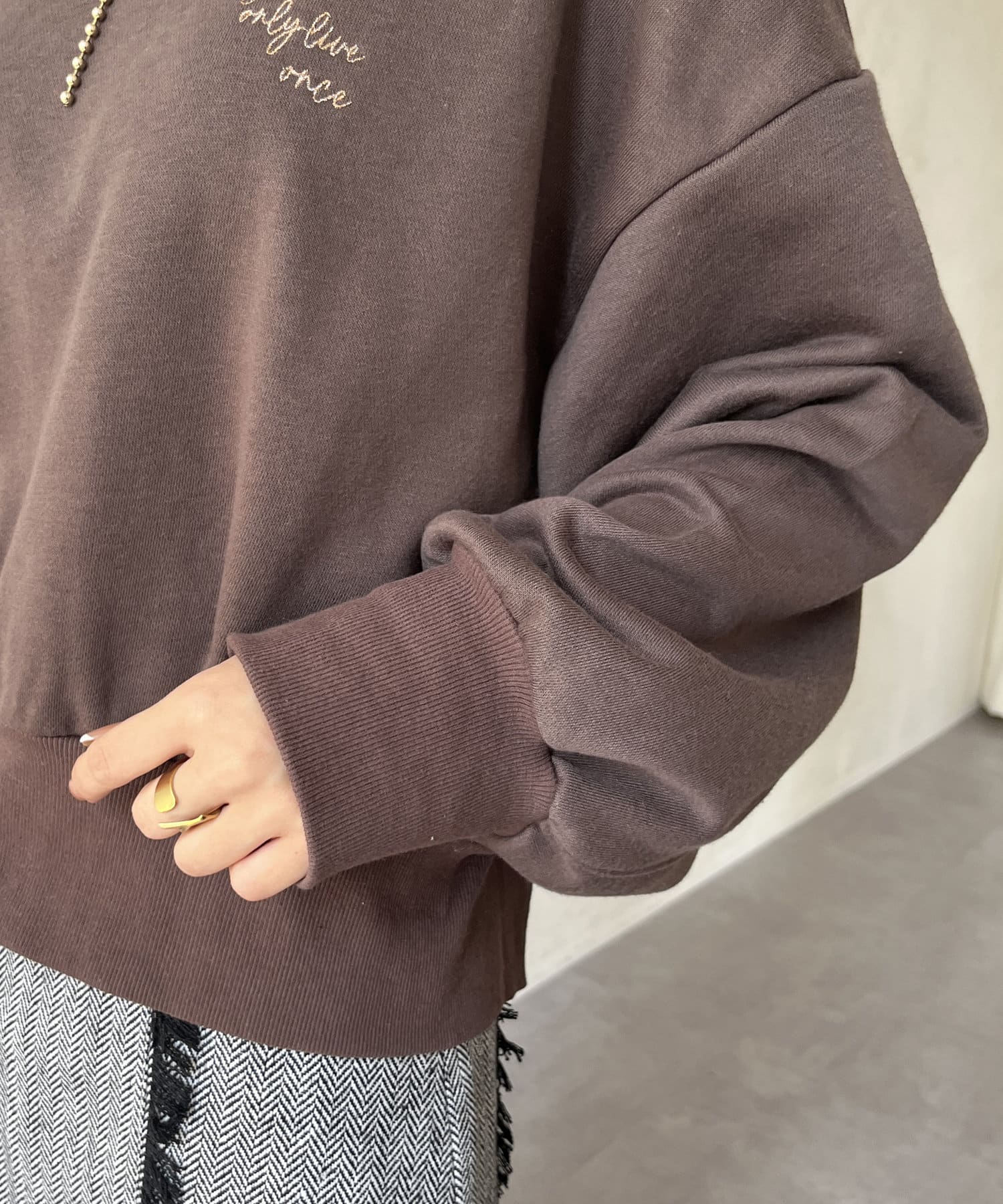 スゥェット素材ですが、ラメのロゴやZIPが付いていることでカジュアルすぎず着れます。