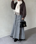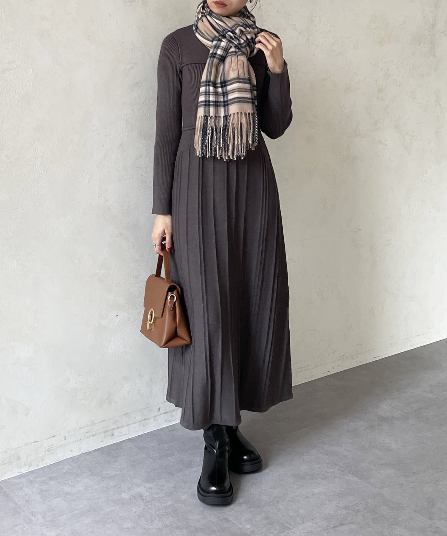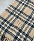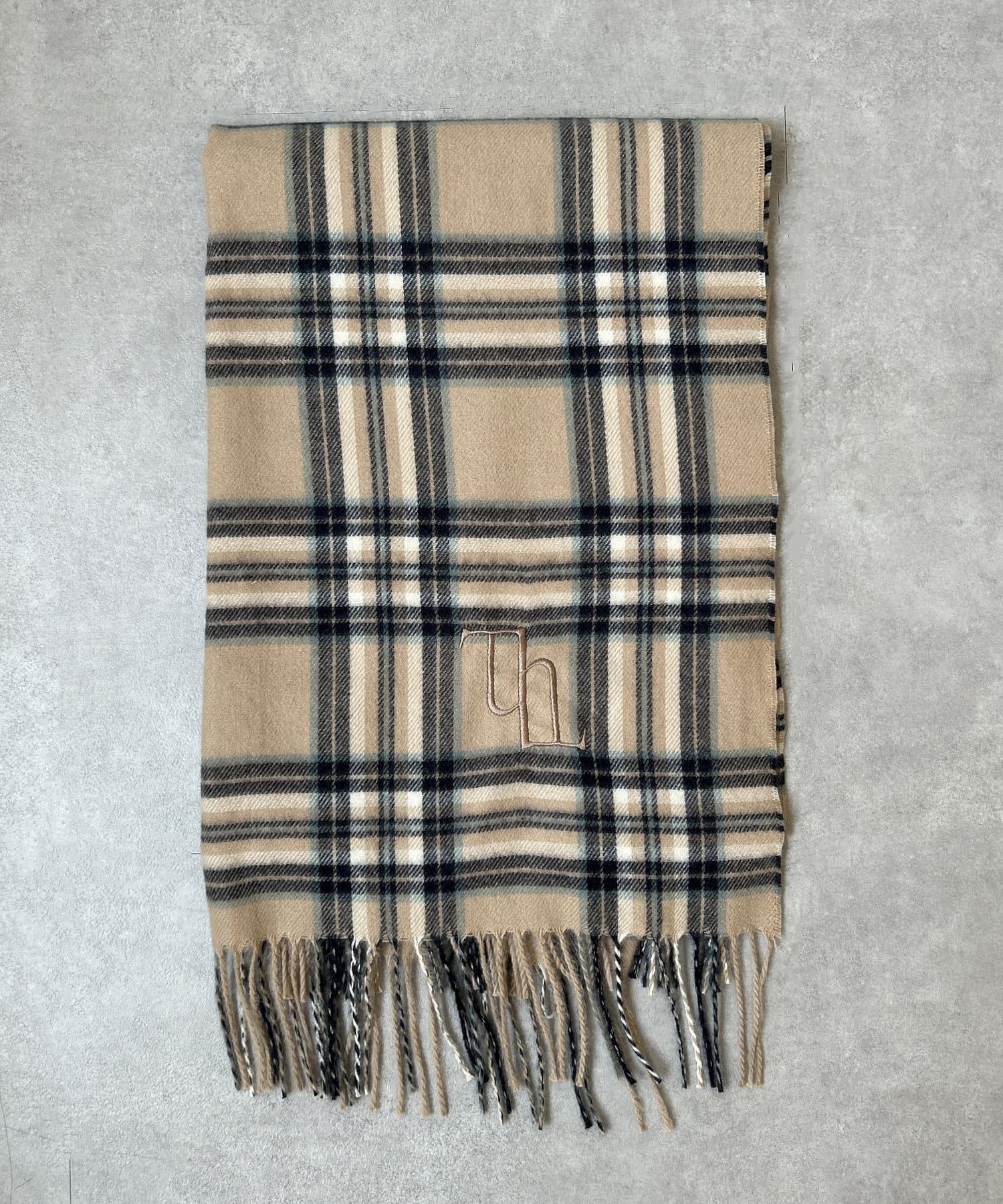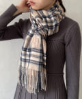 チェック柄など、コーデのワンポイントとしてカラーのストールを合わせるのも◎