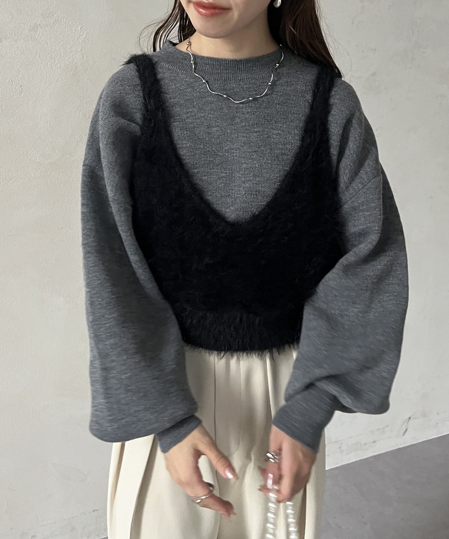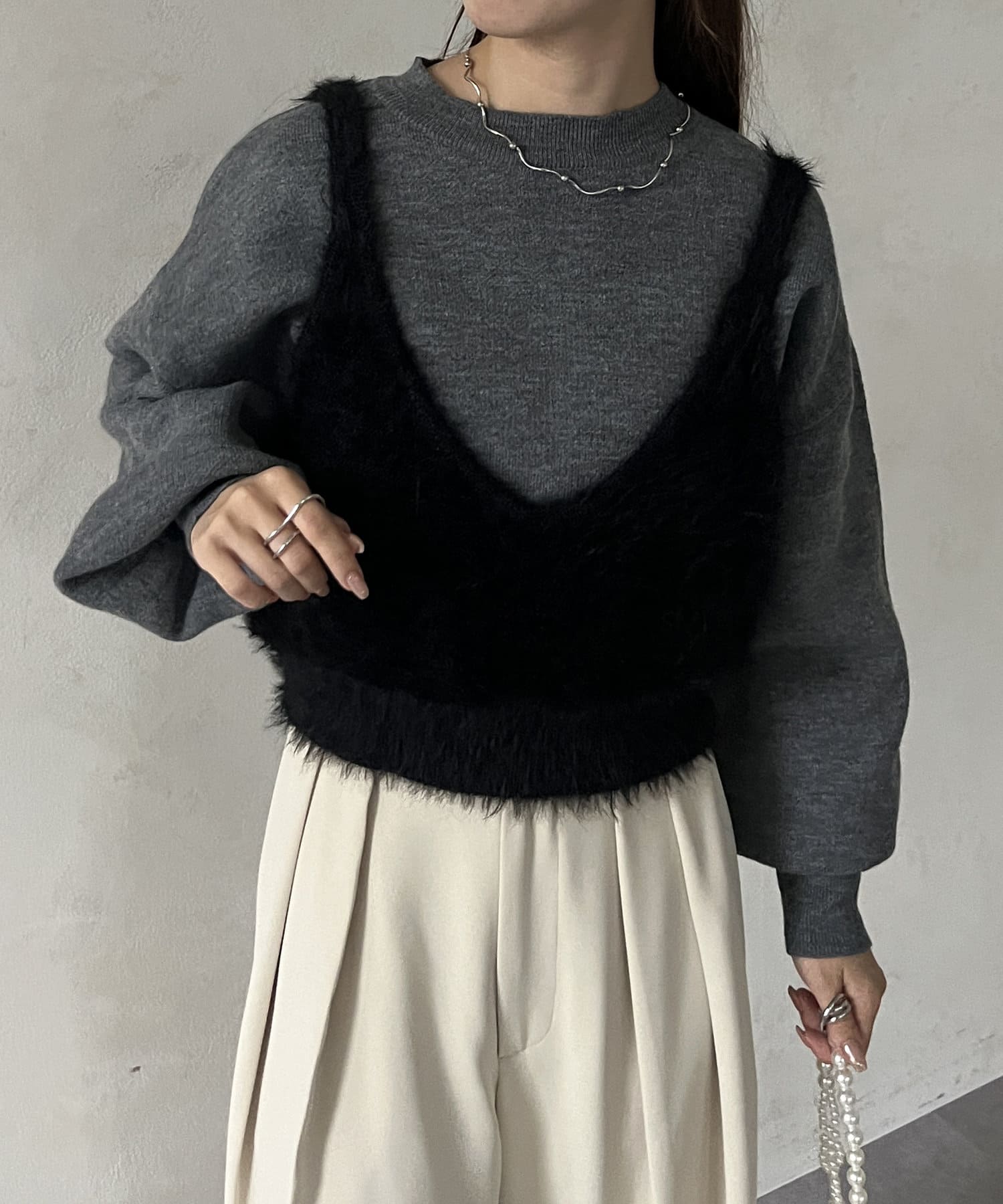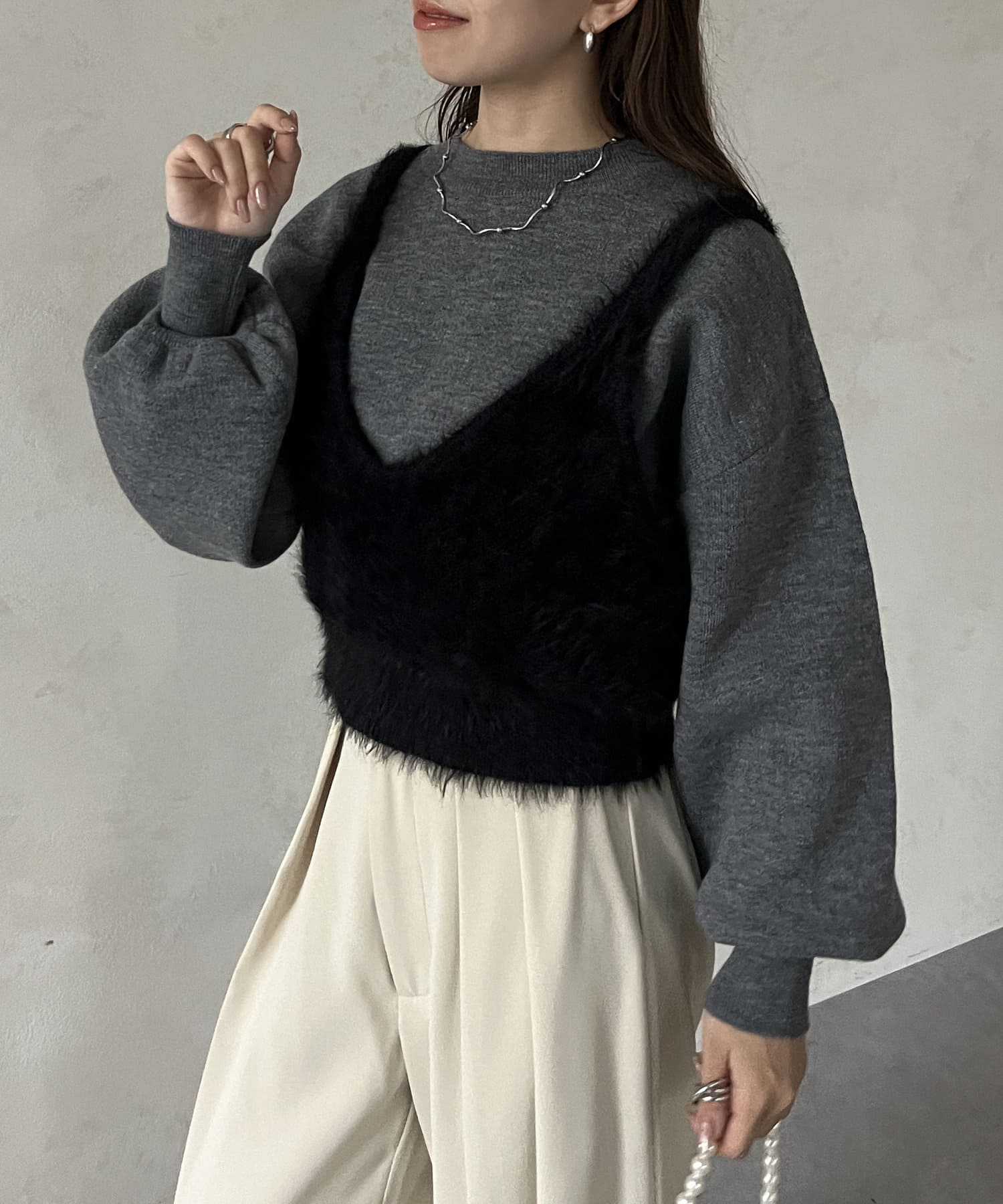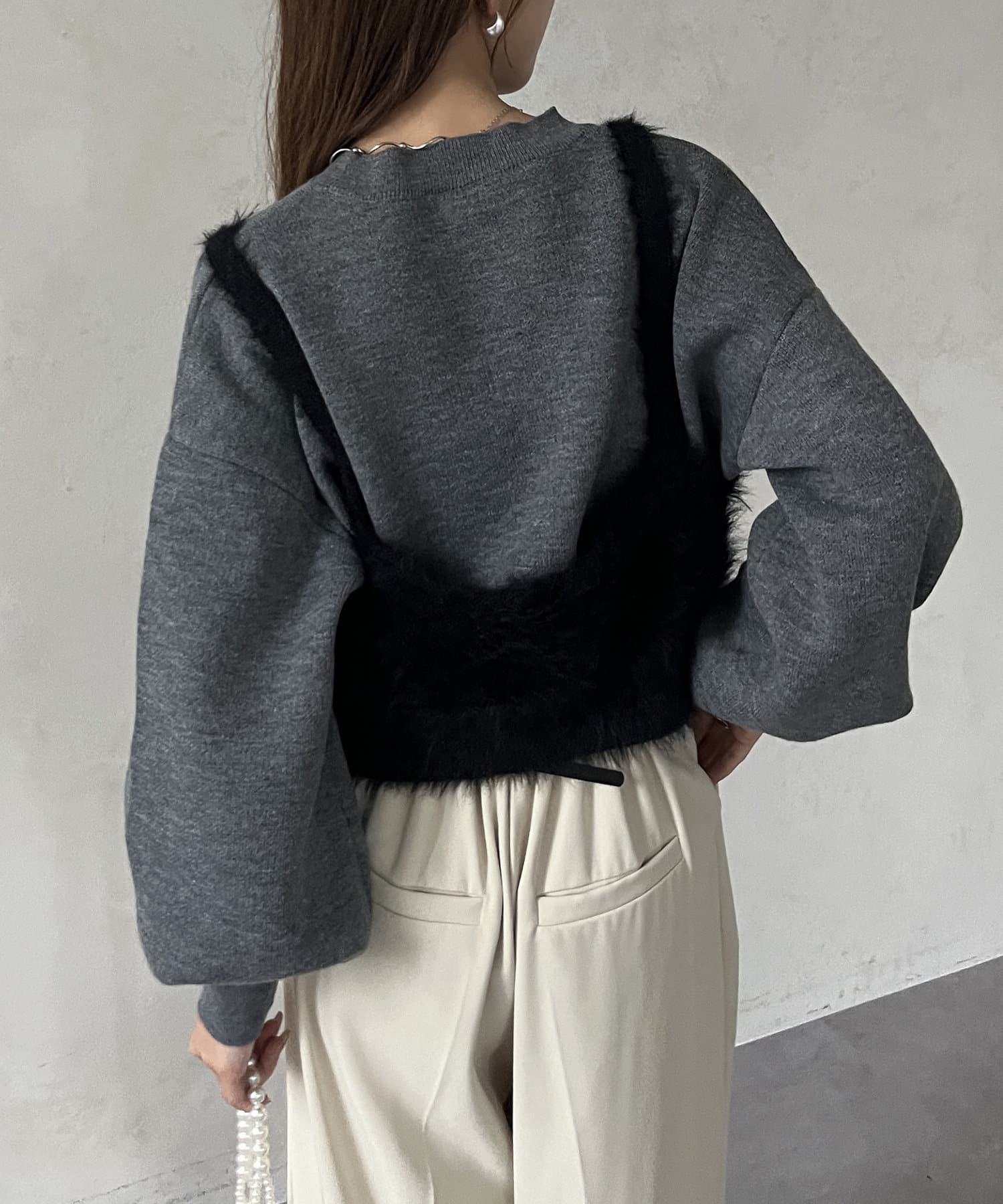 ・ビスチェはふわふわのシャギー素材を使用