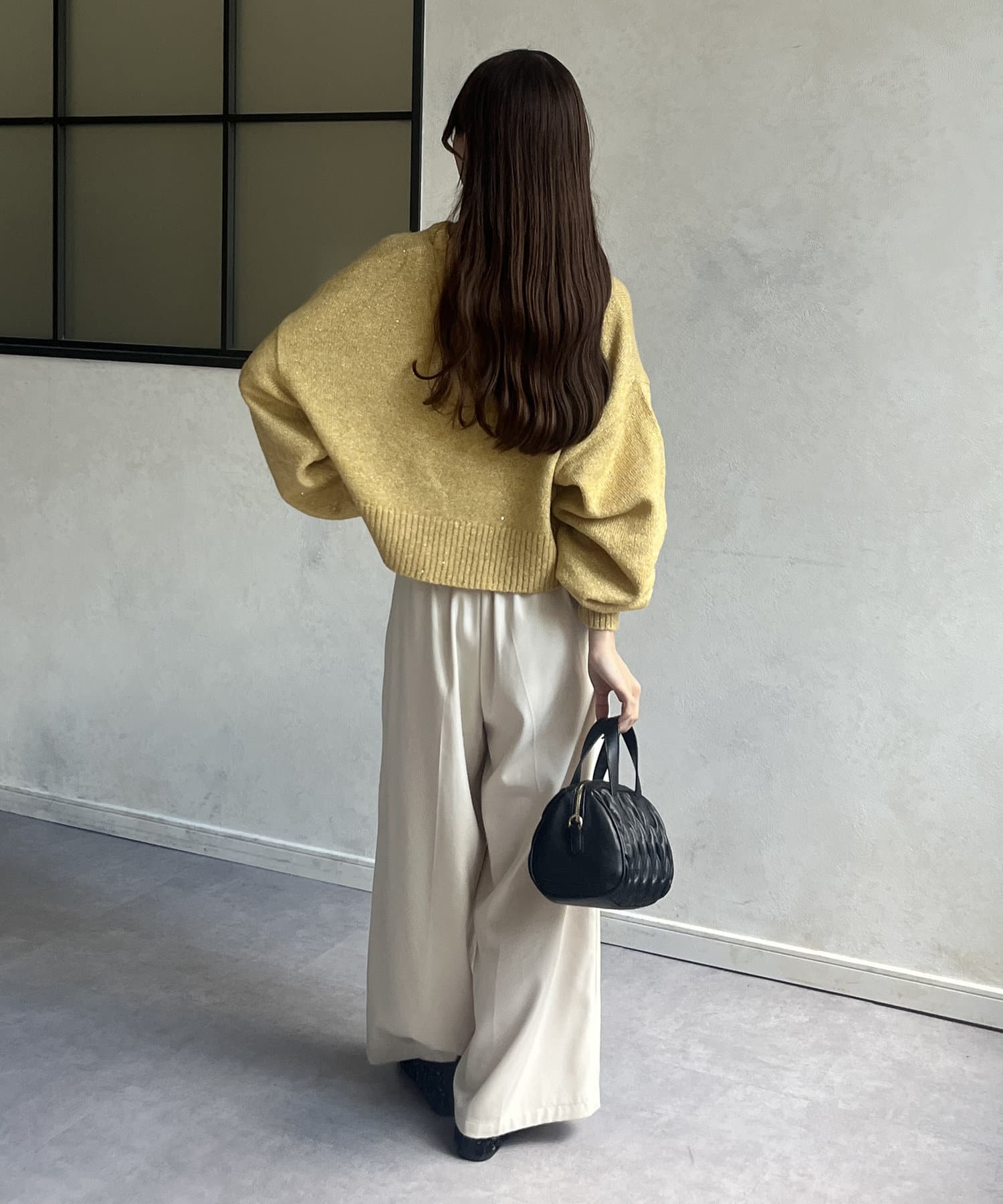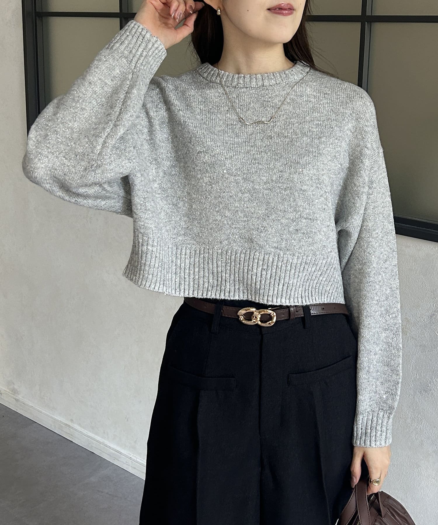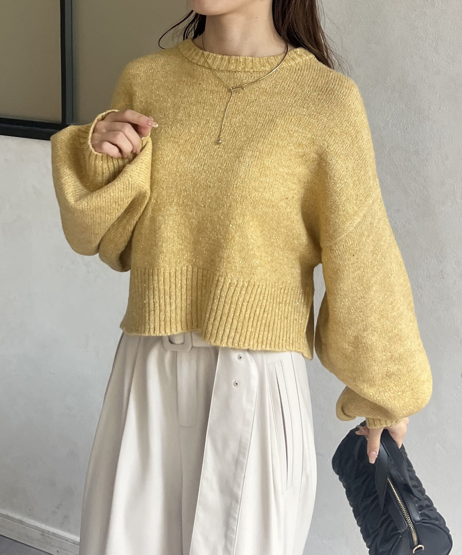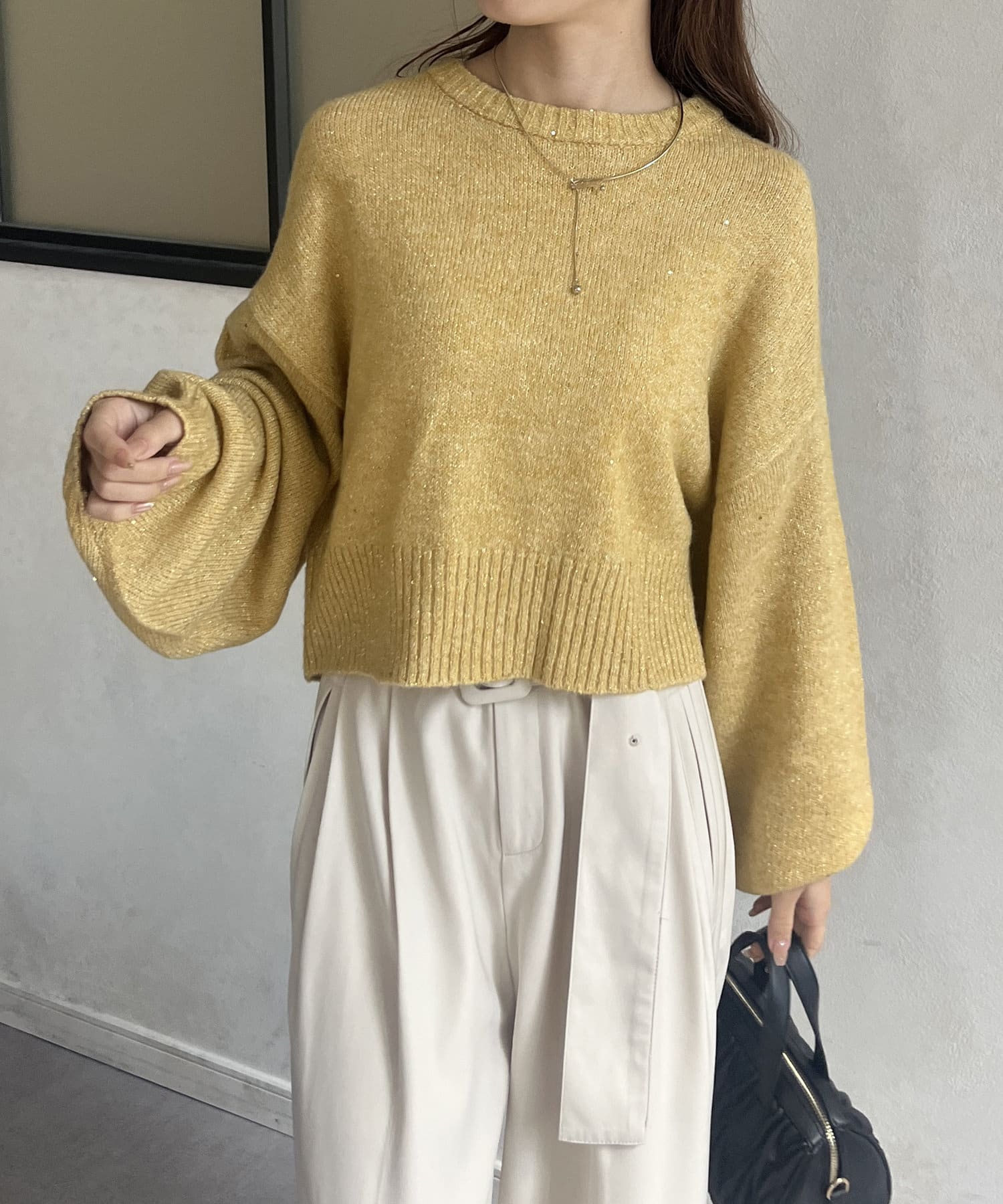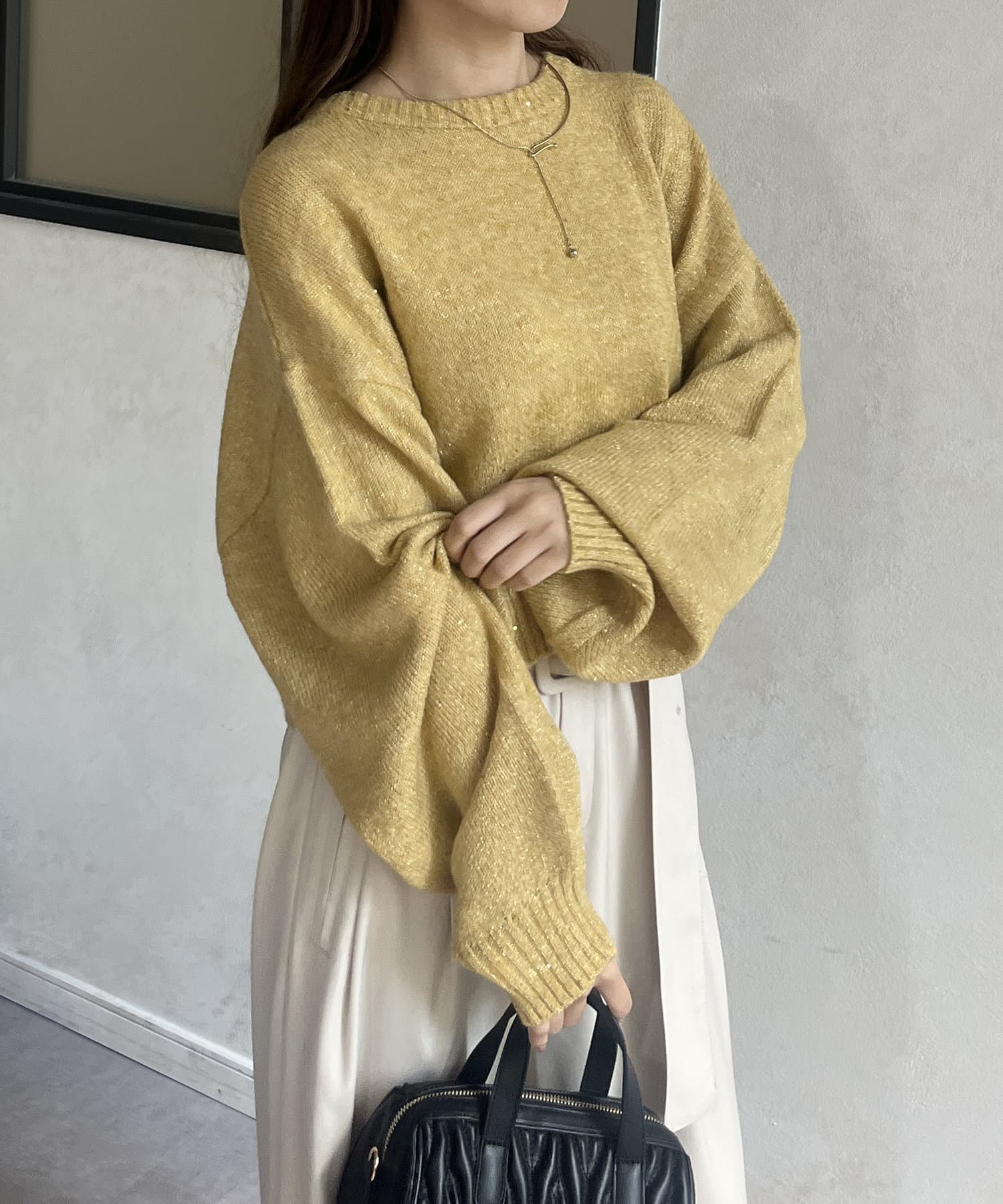 ・上品なラメ感のニットなので、スラックスやタイトスカートで