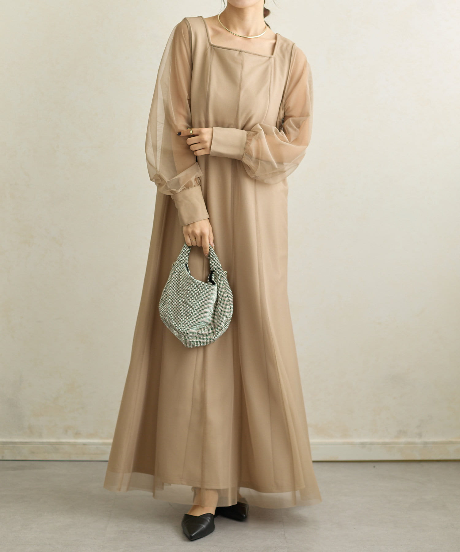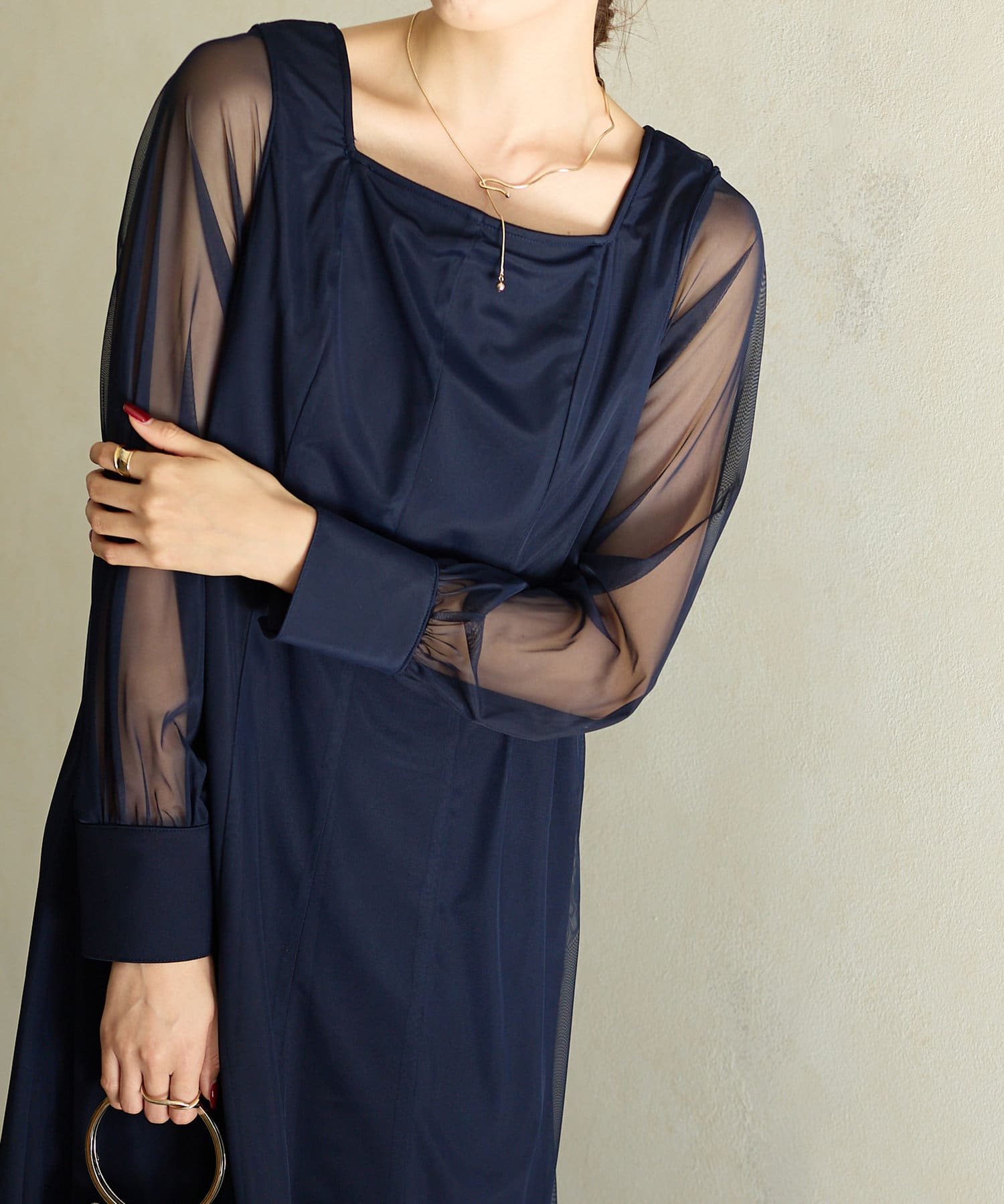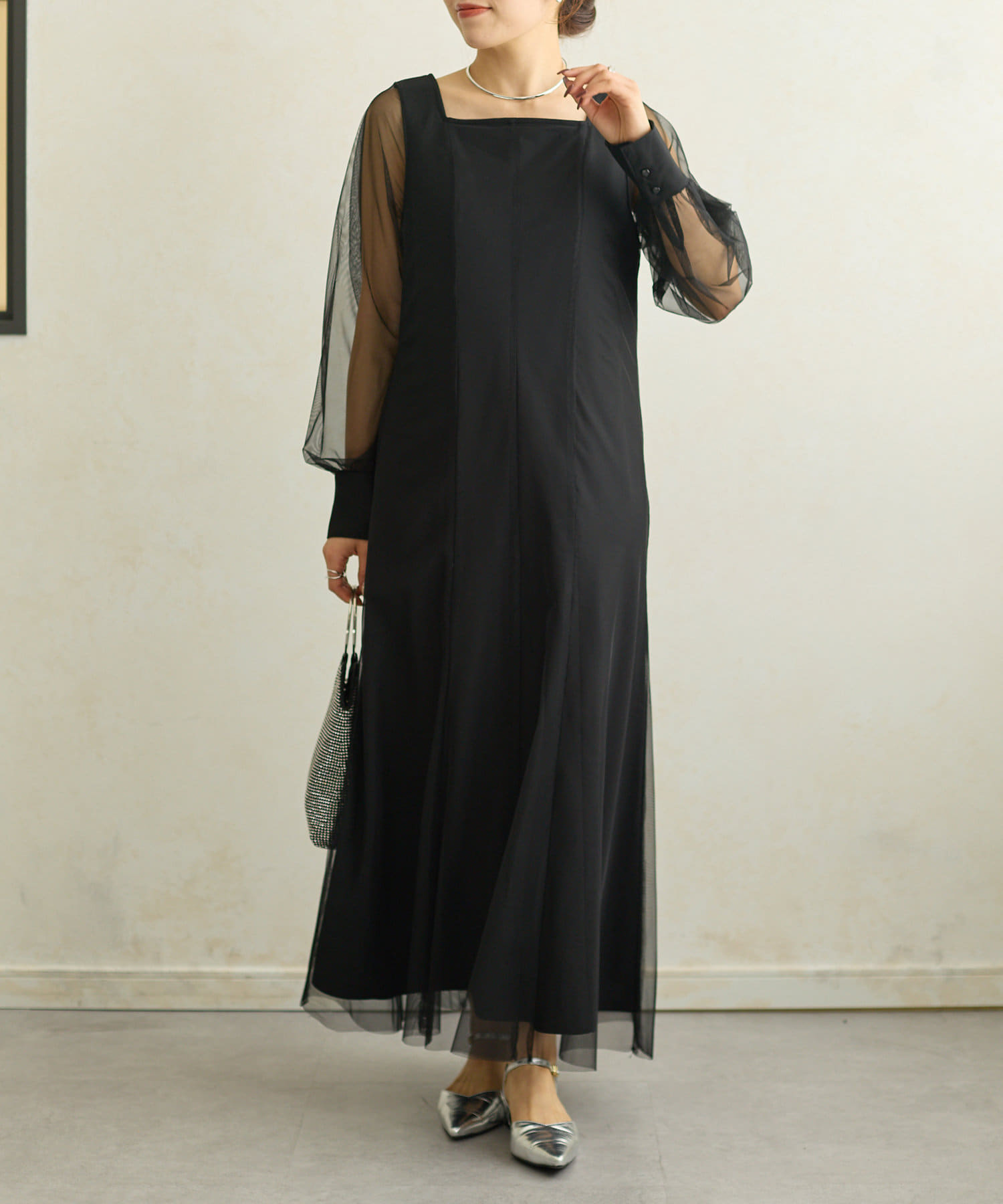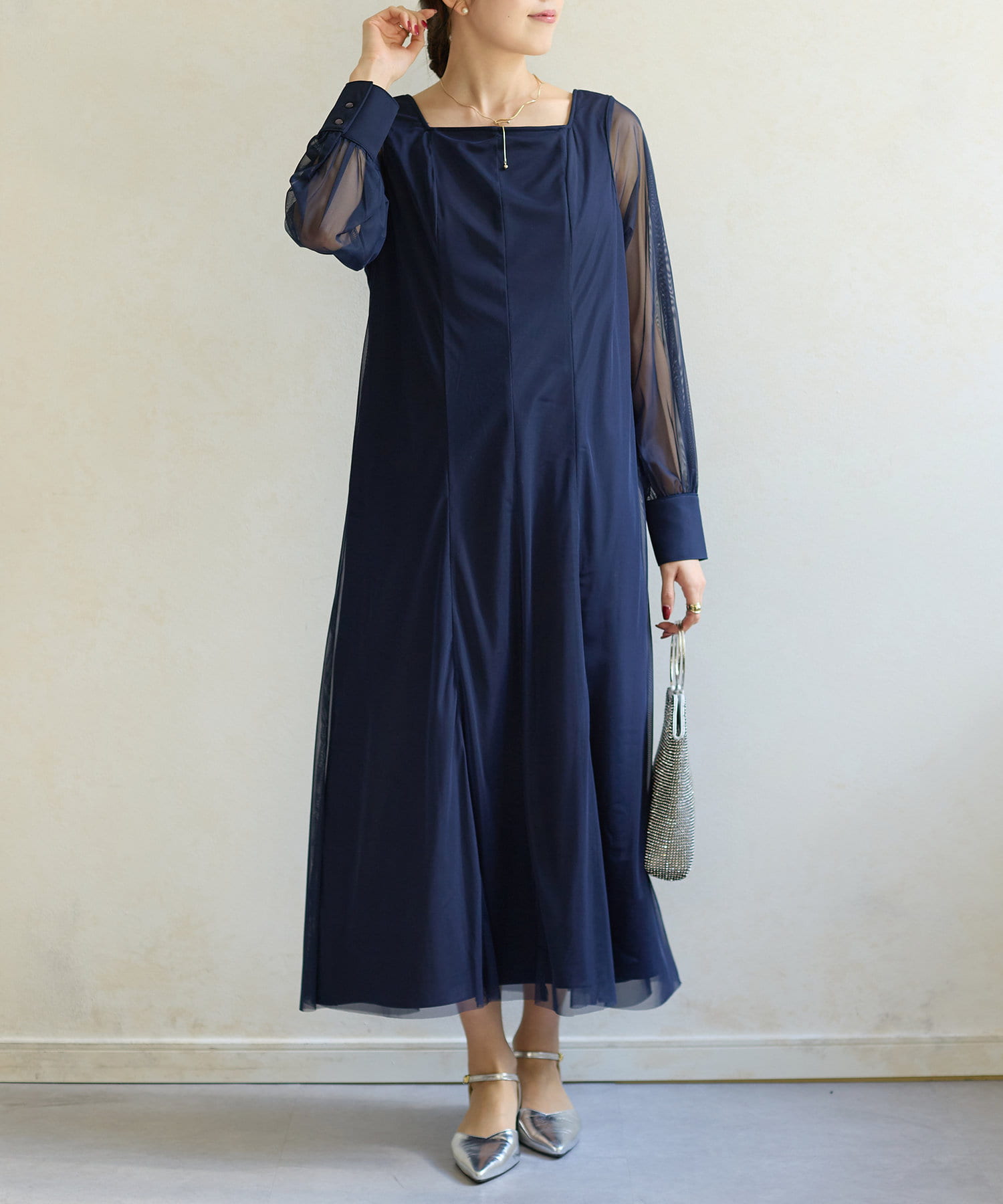 【オケージョン】スクエアネック袖チュールマーメイドワンピース