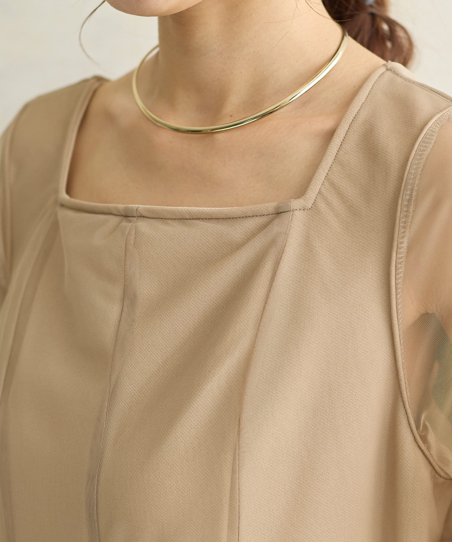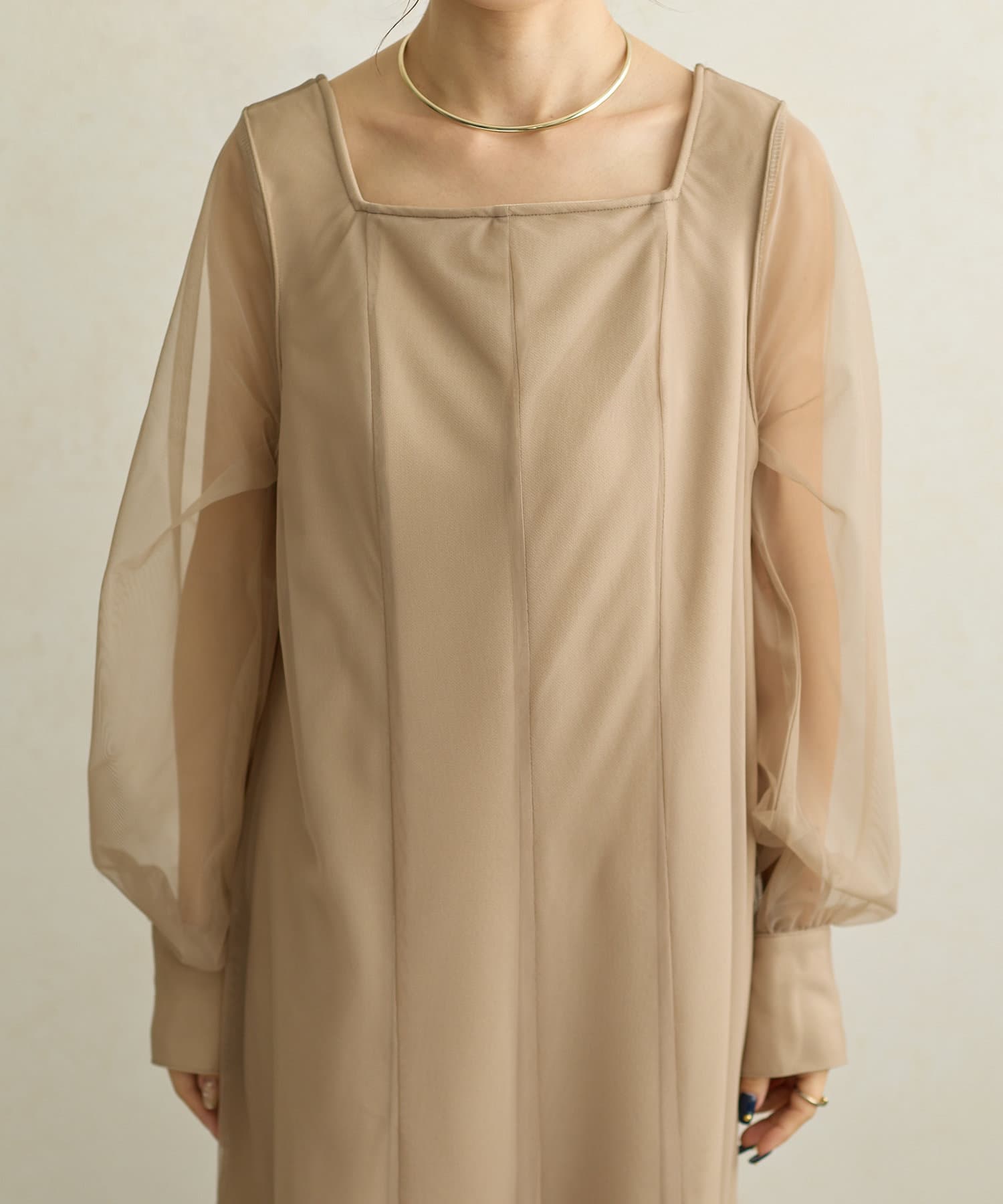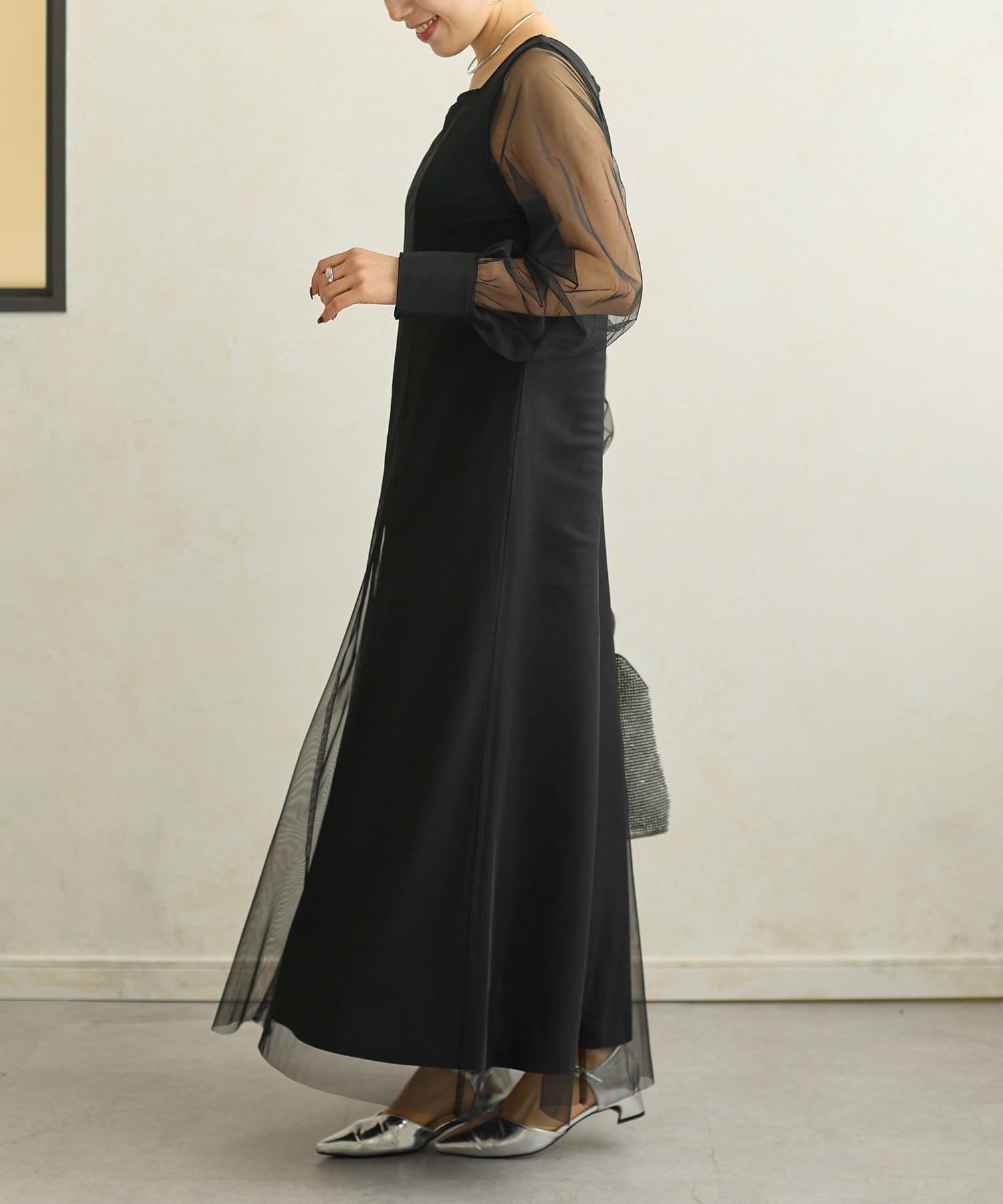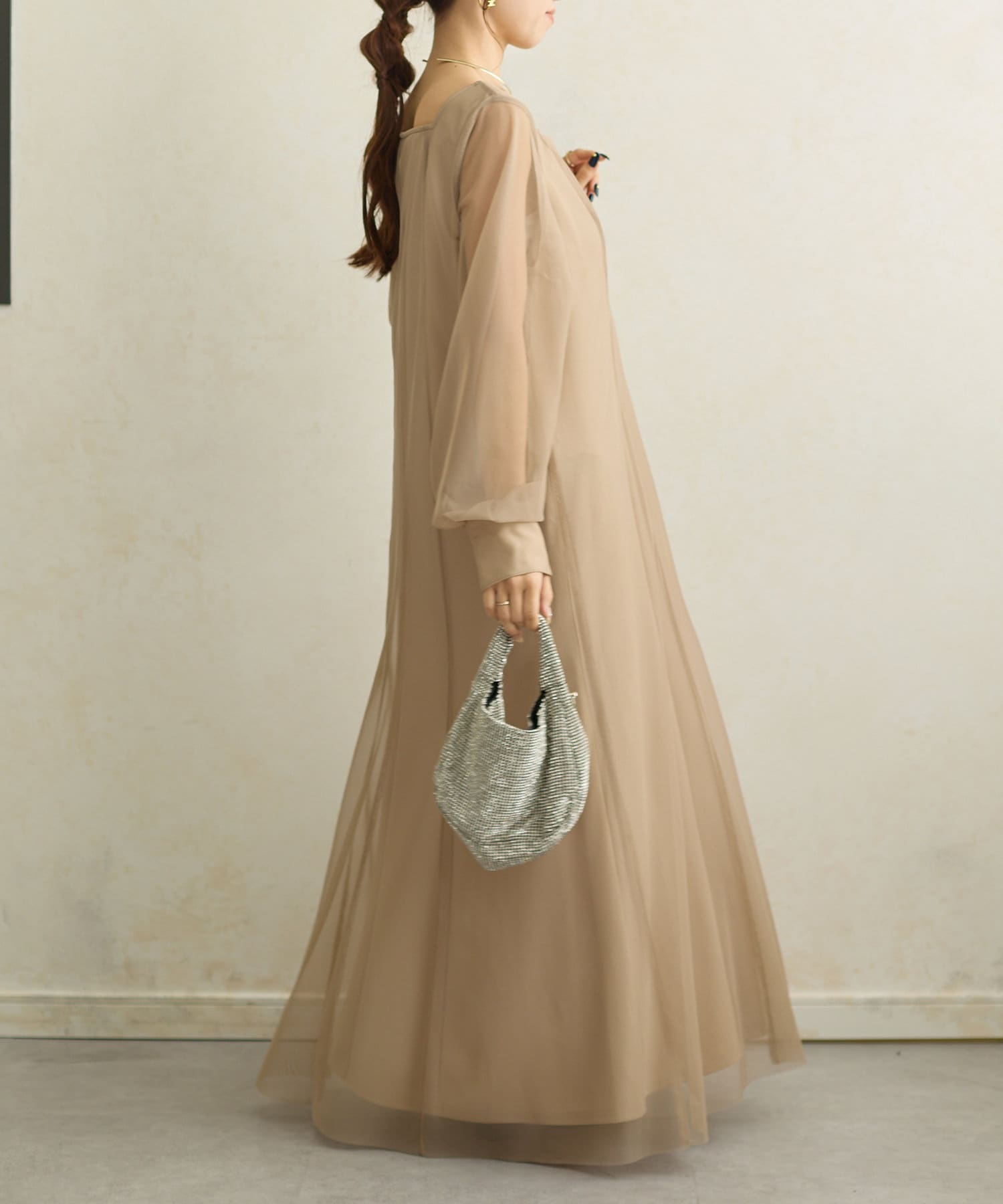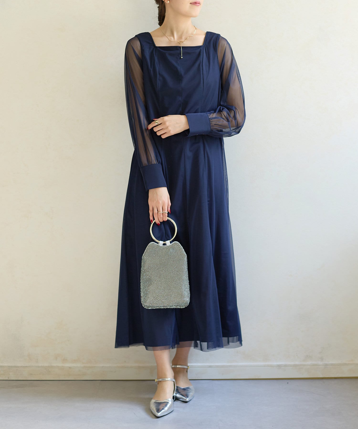 【オケージョン】スクエアネック袖チュールマーメイドワンピース
