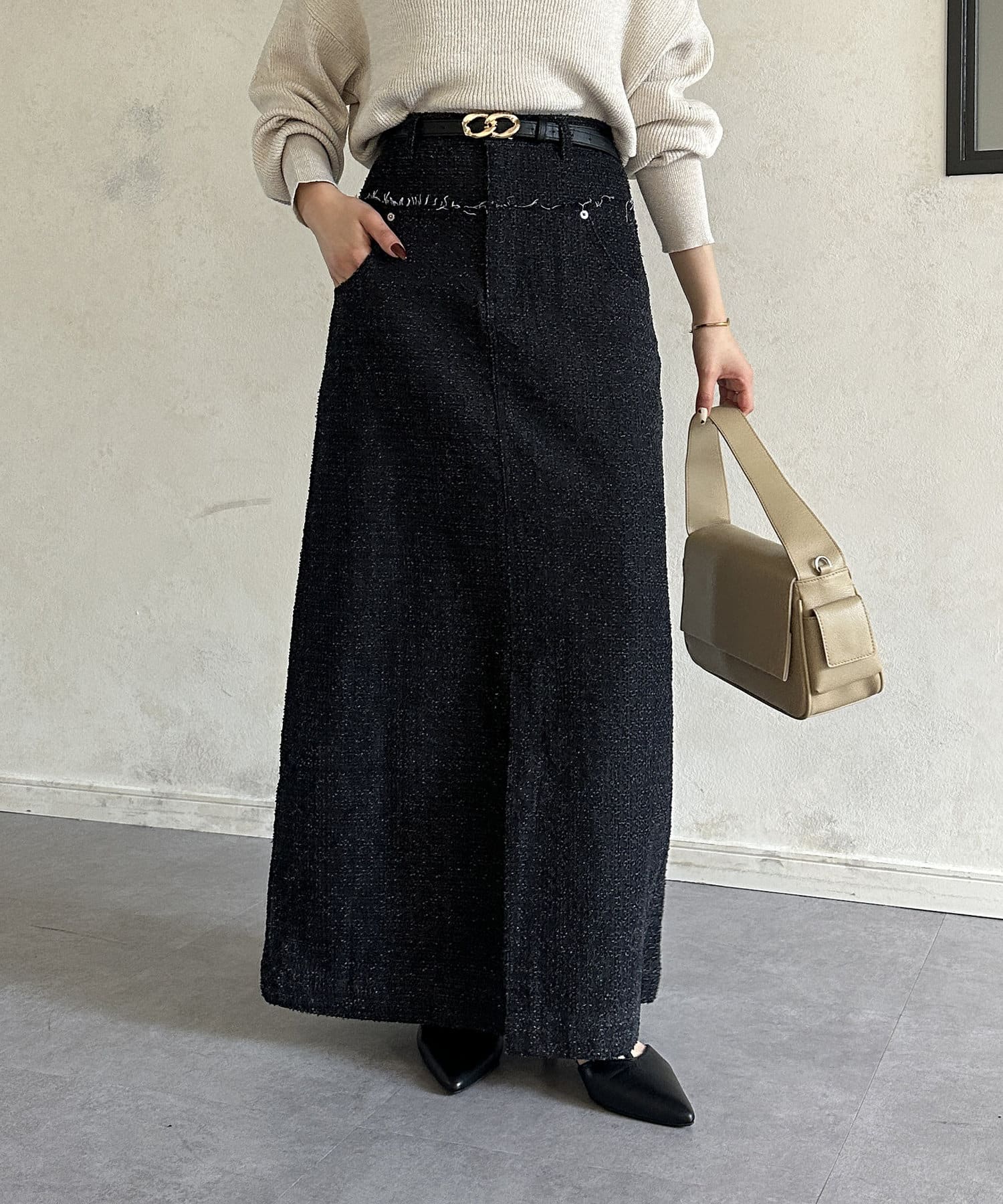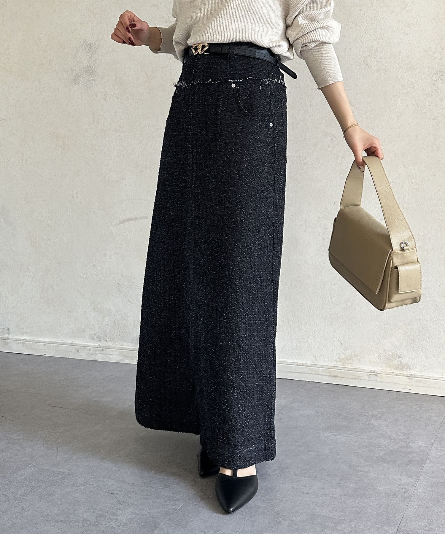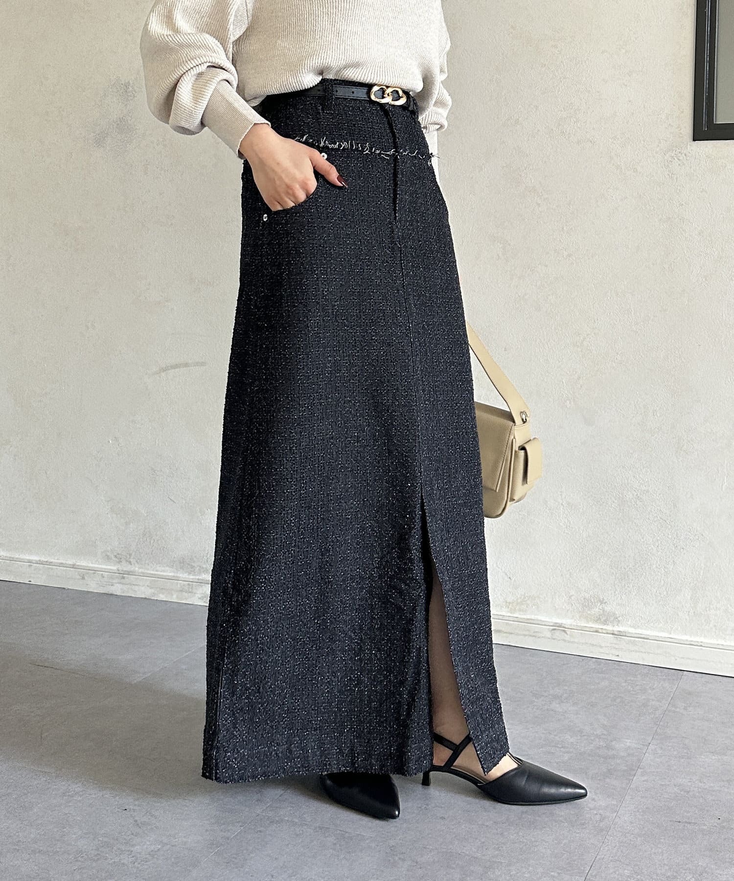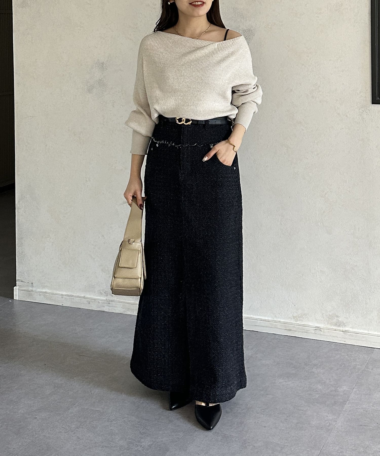 タイトなニット、カットソーをインして着るのがおすすめです◎