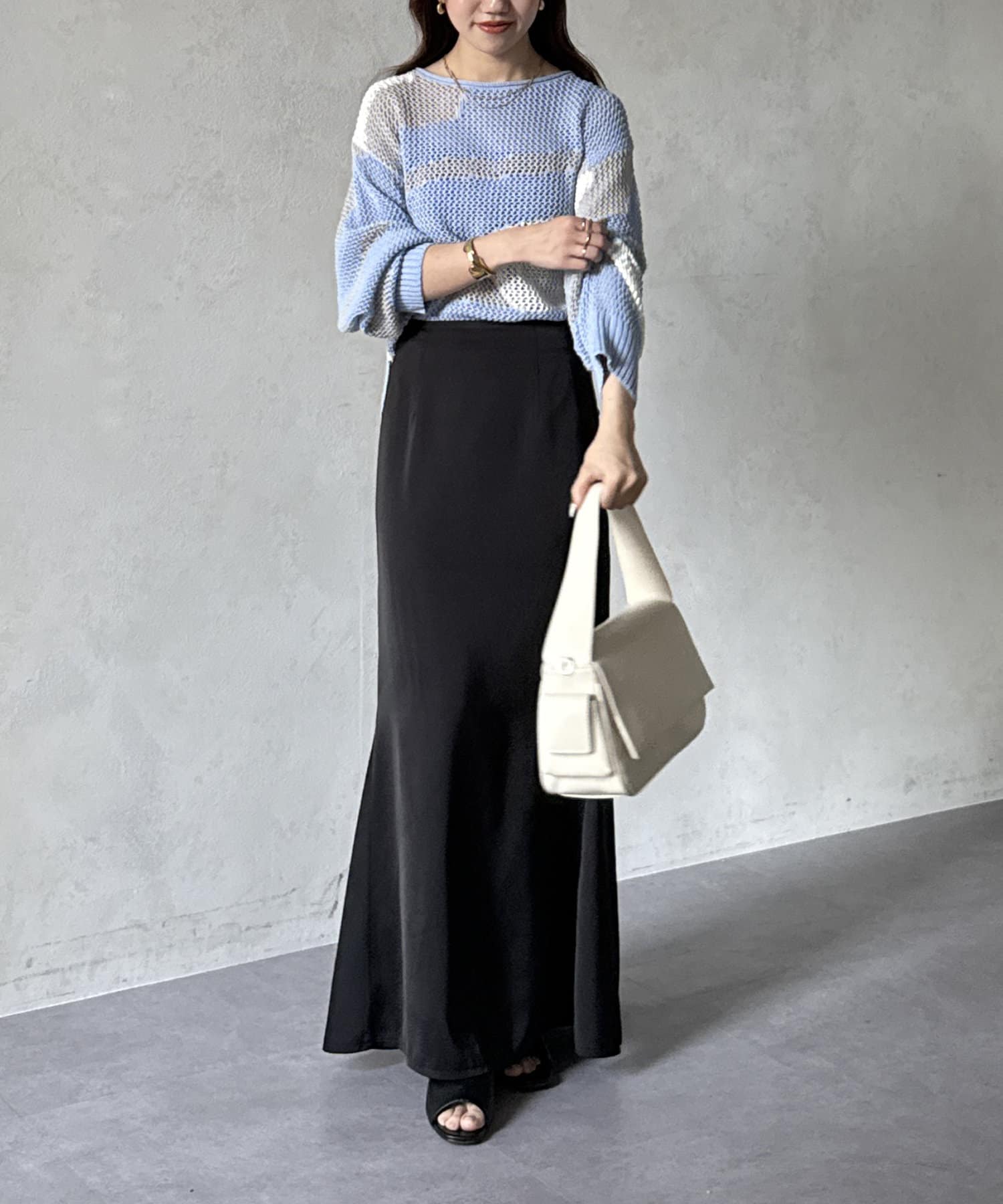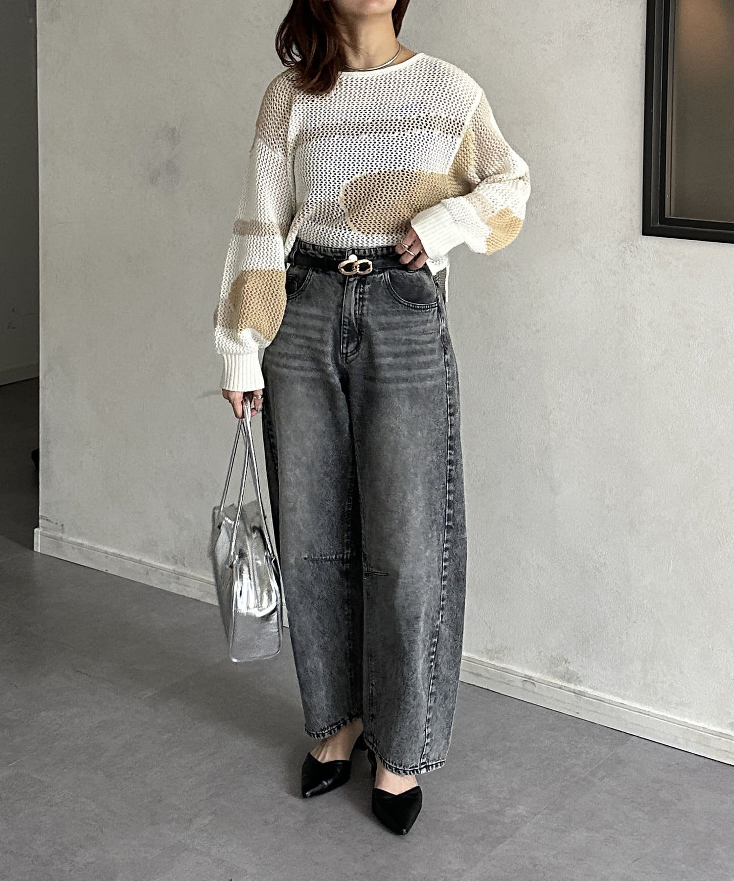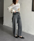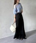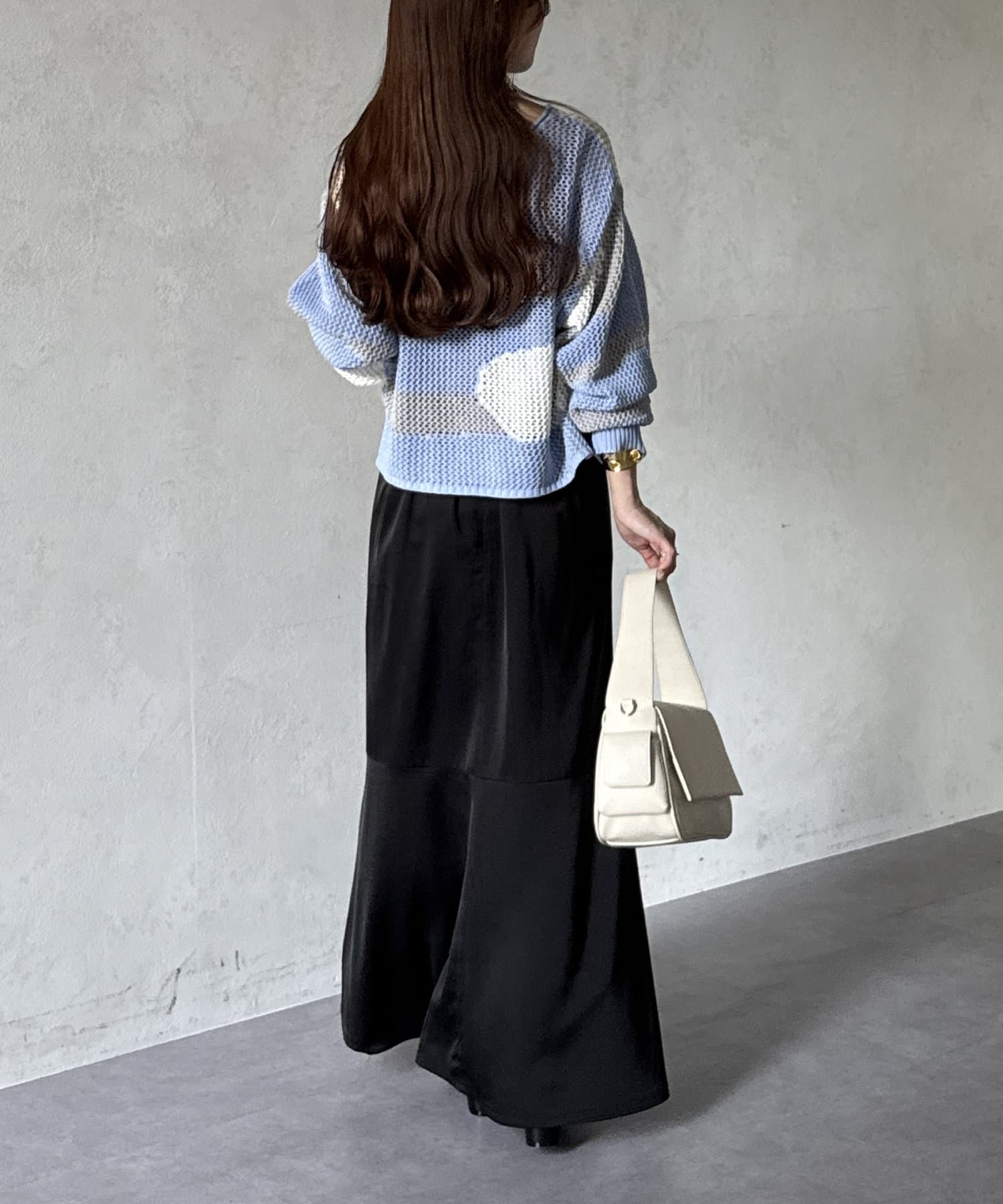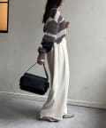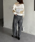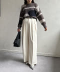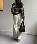 1枚で華やかなニットなので、ボトムスはシンプルなものを