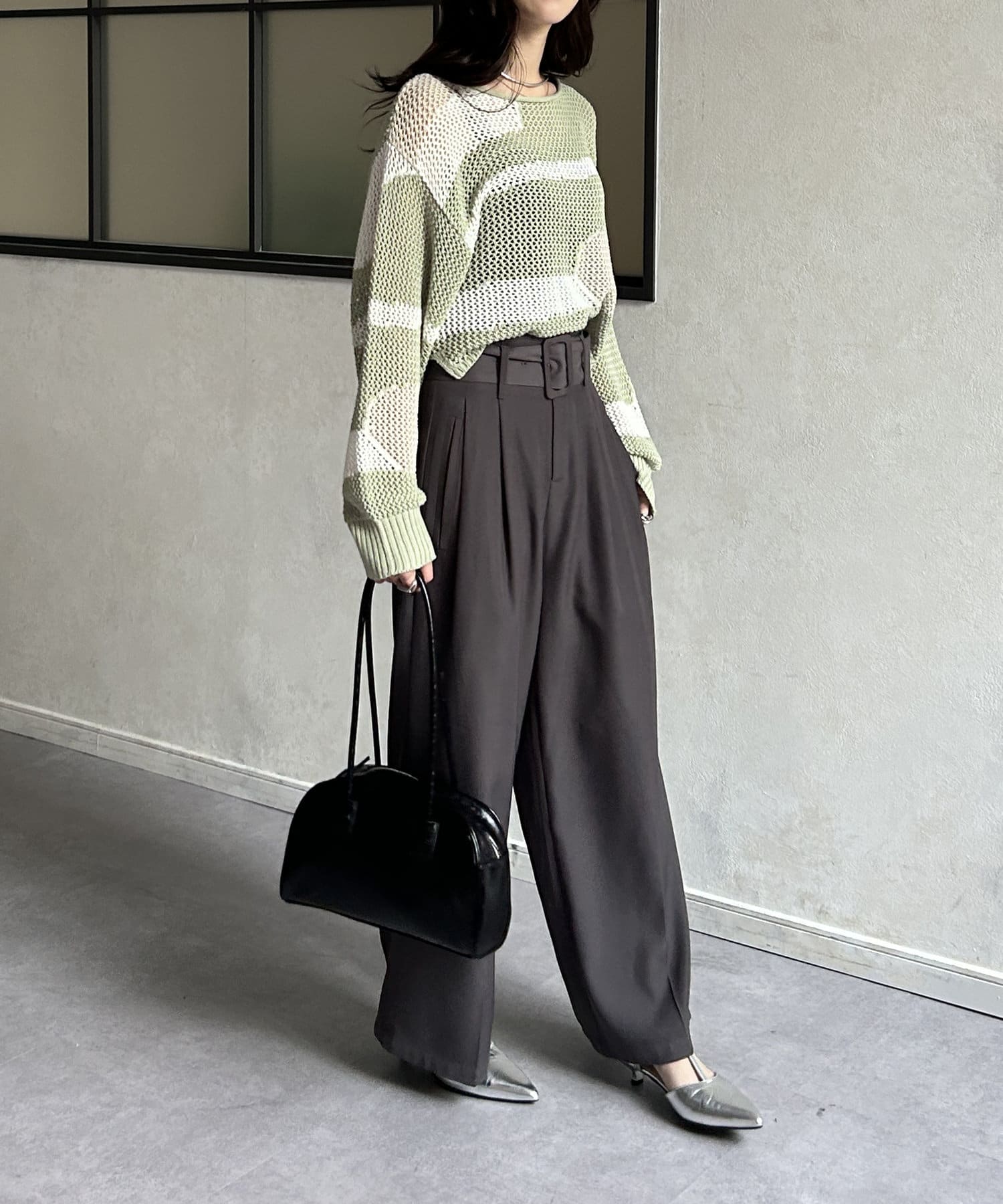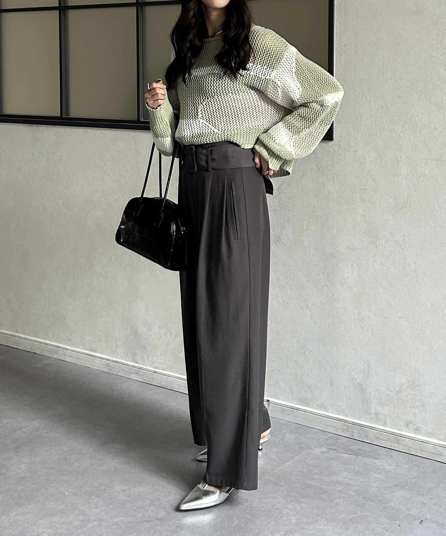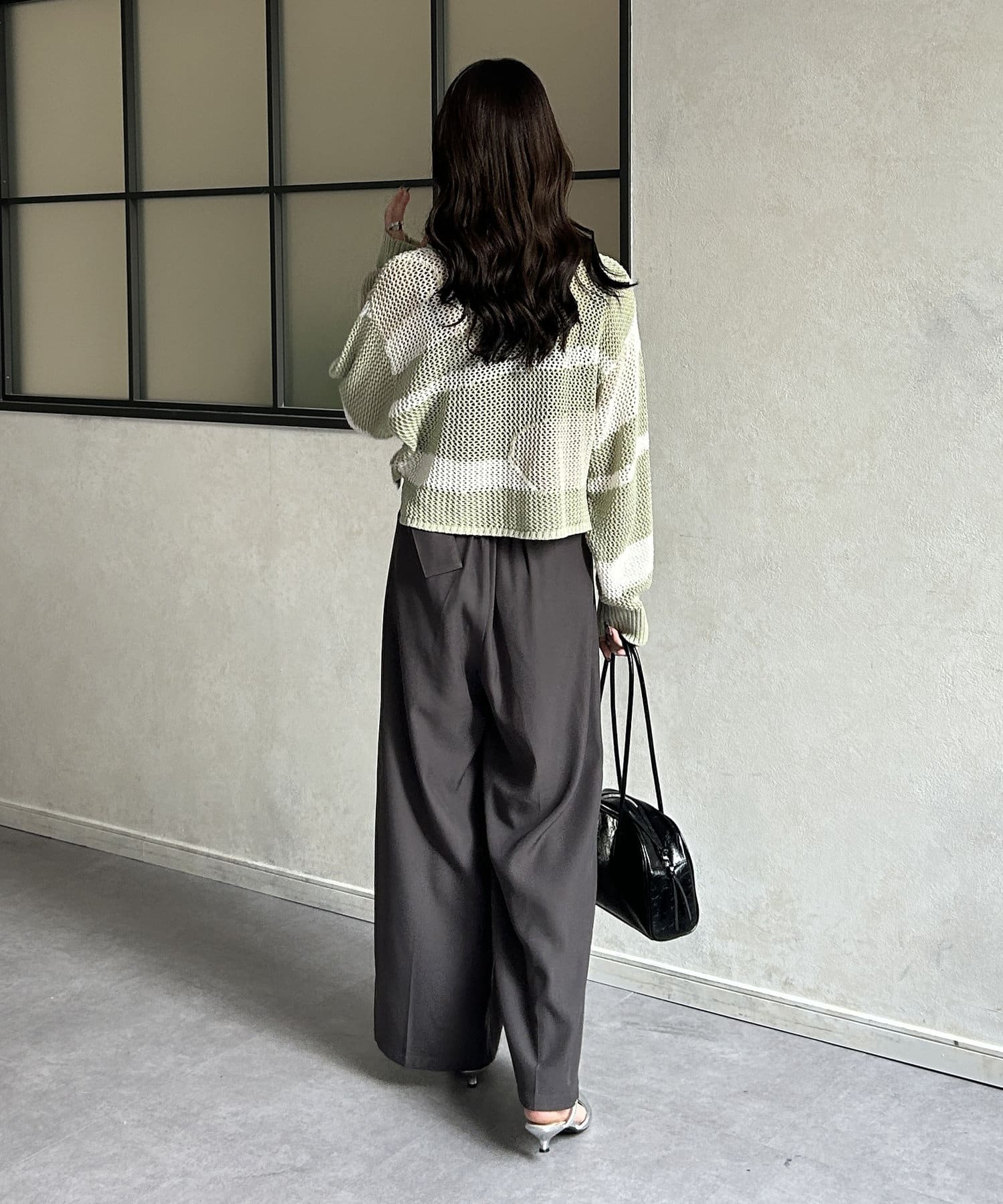 1枚で華やかなニットなので、ボトムスはシンプルなものを