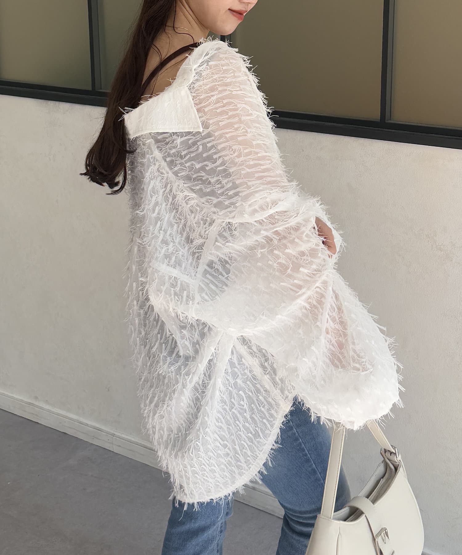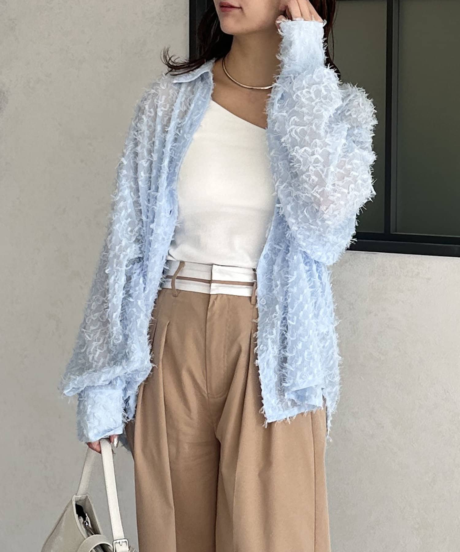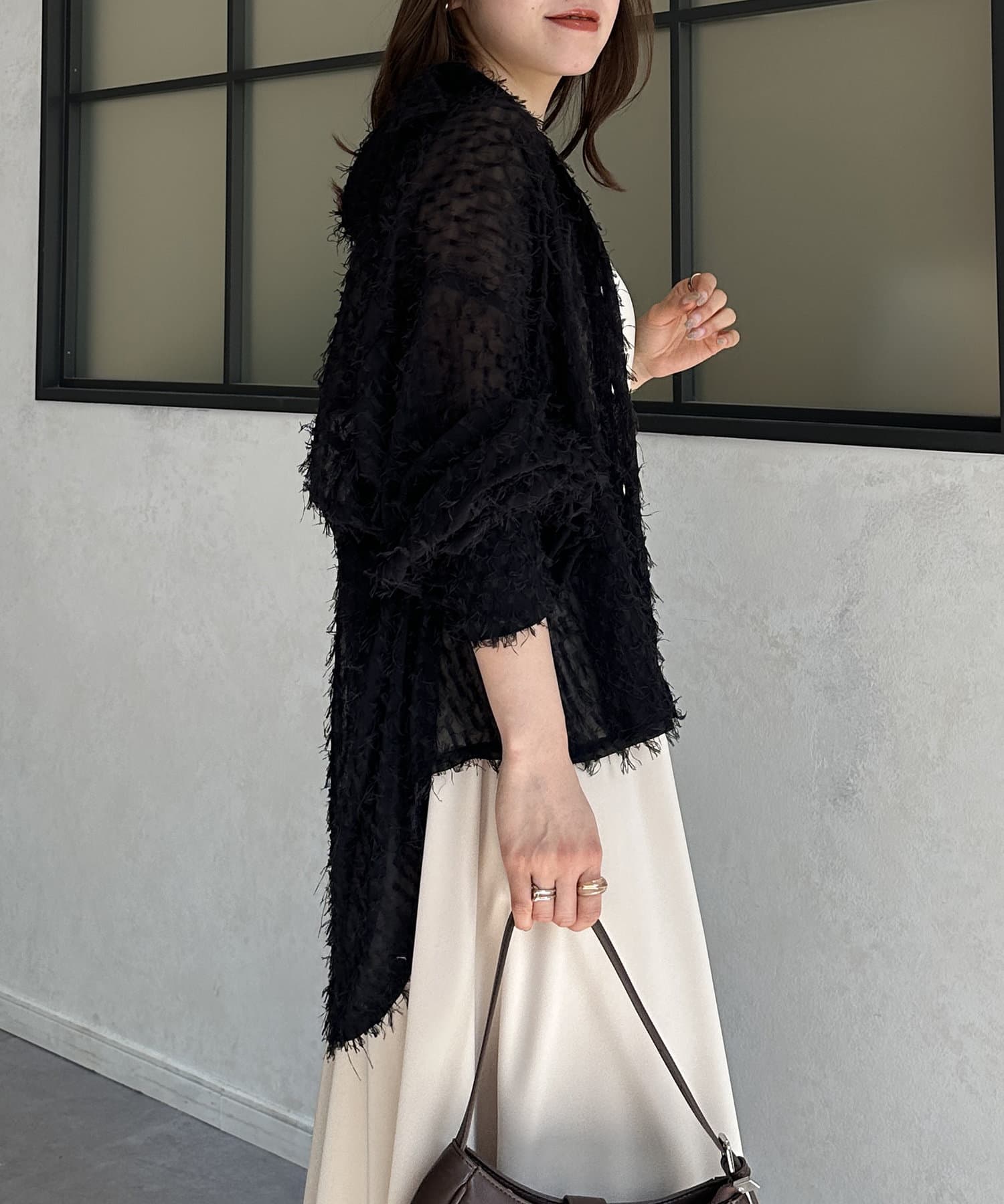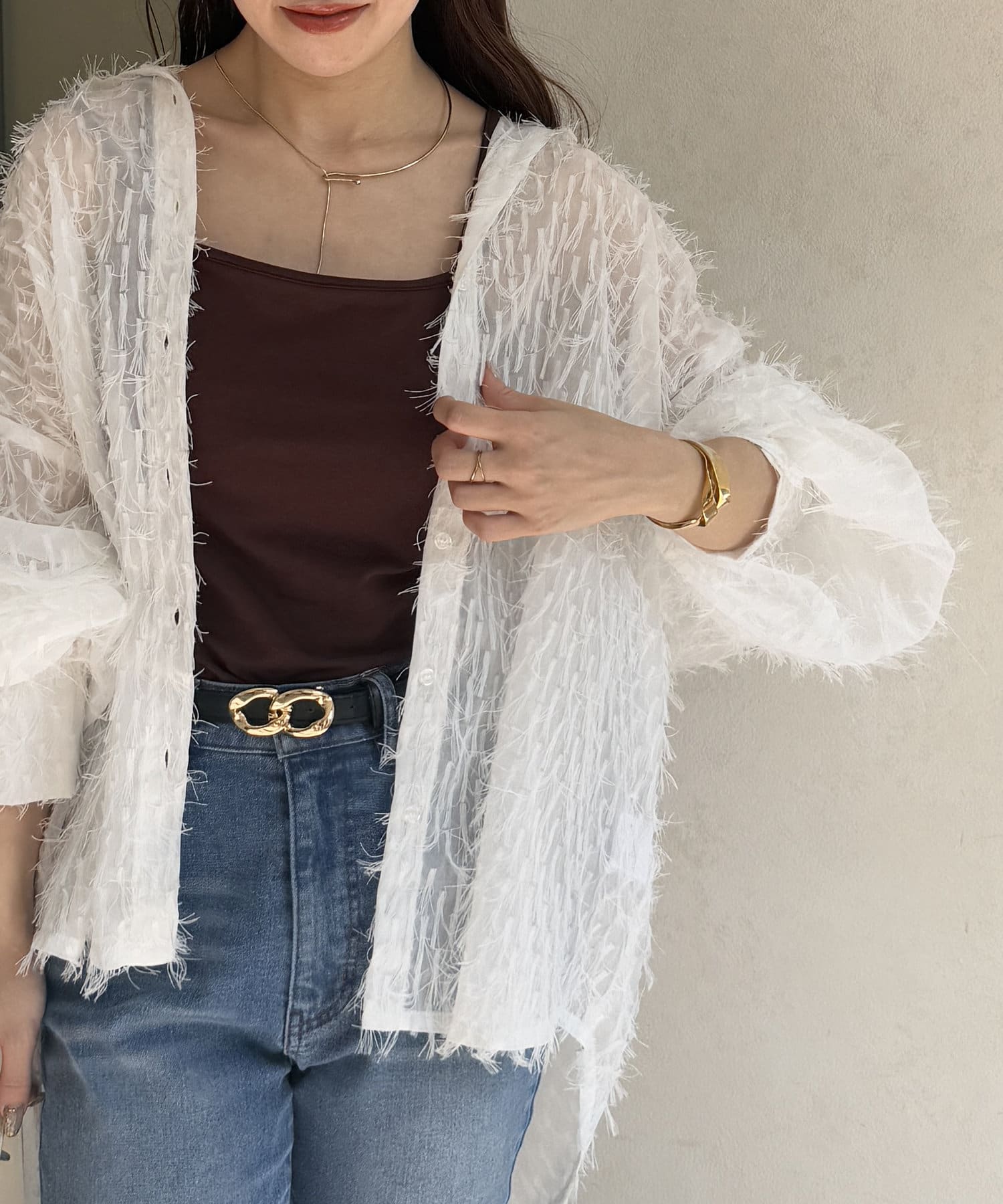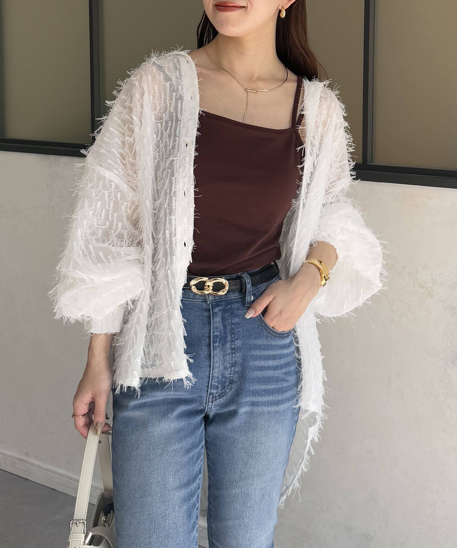 ・着映えするシアーフリンジ素材には、シンプルなスラックスやデニムとの合わせがおすすめです。