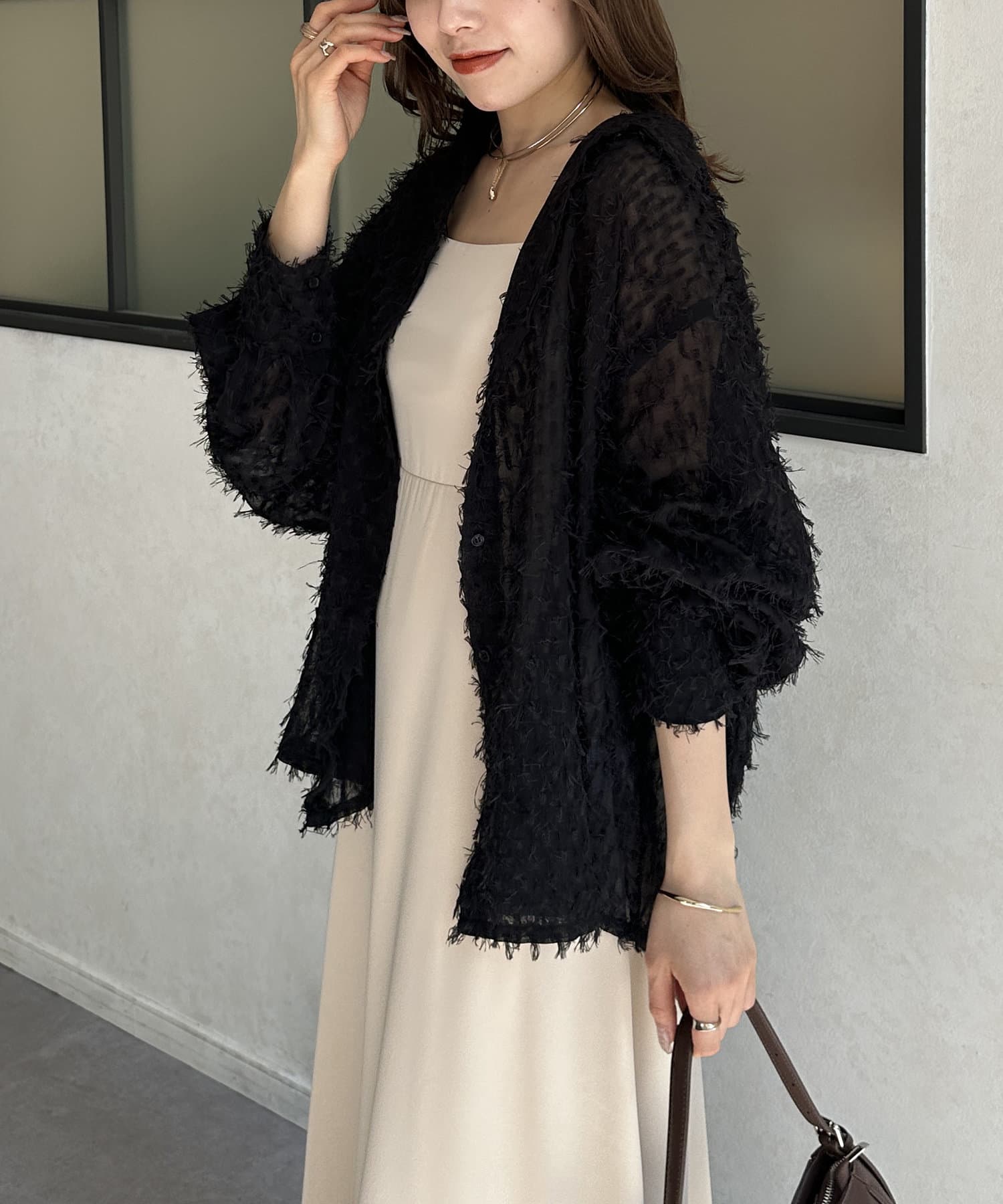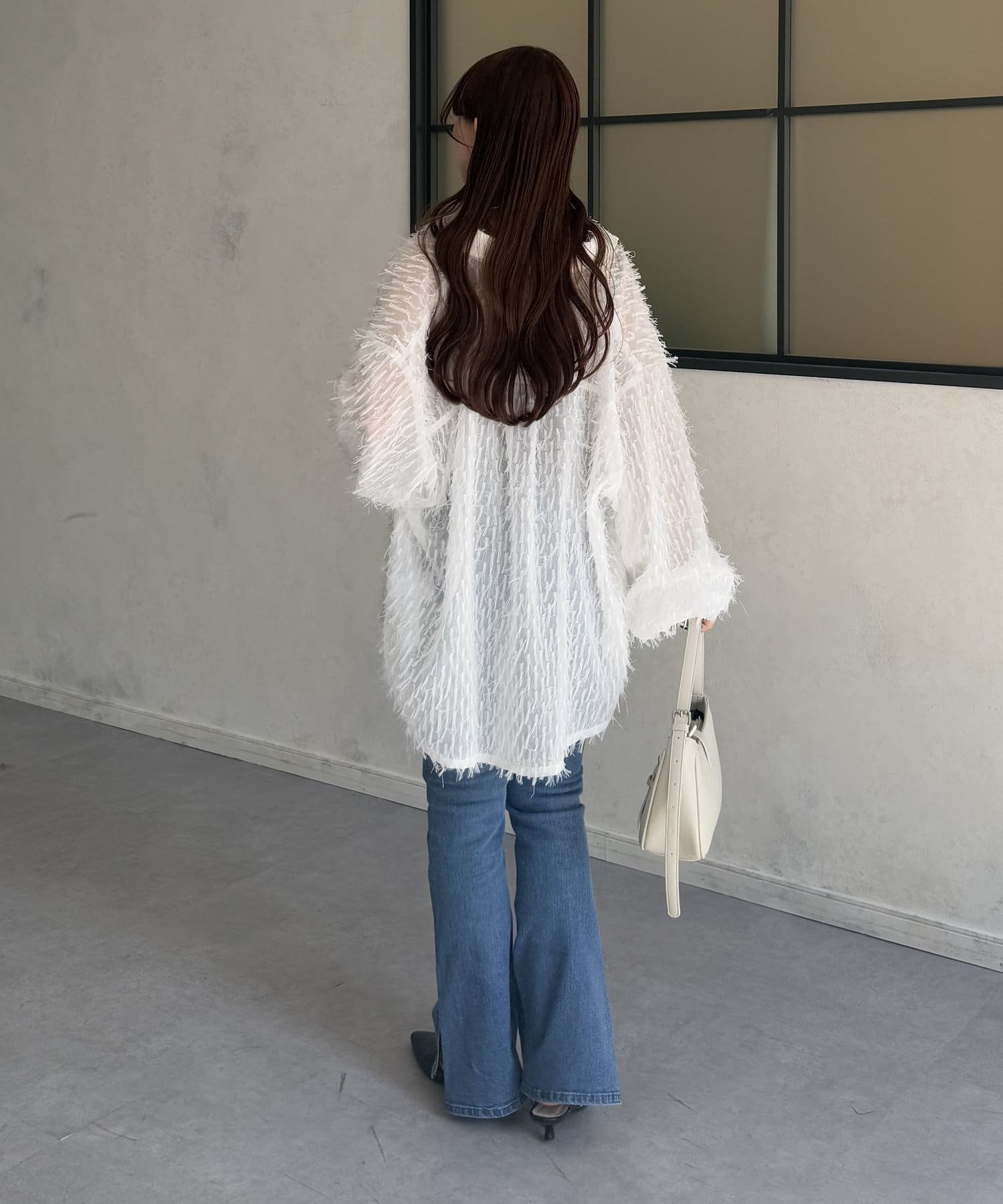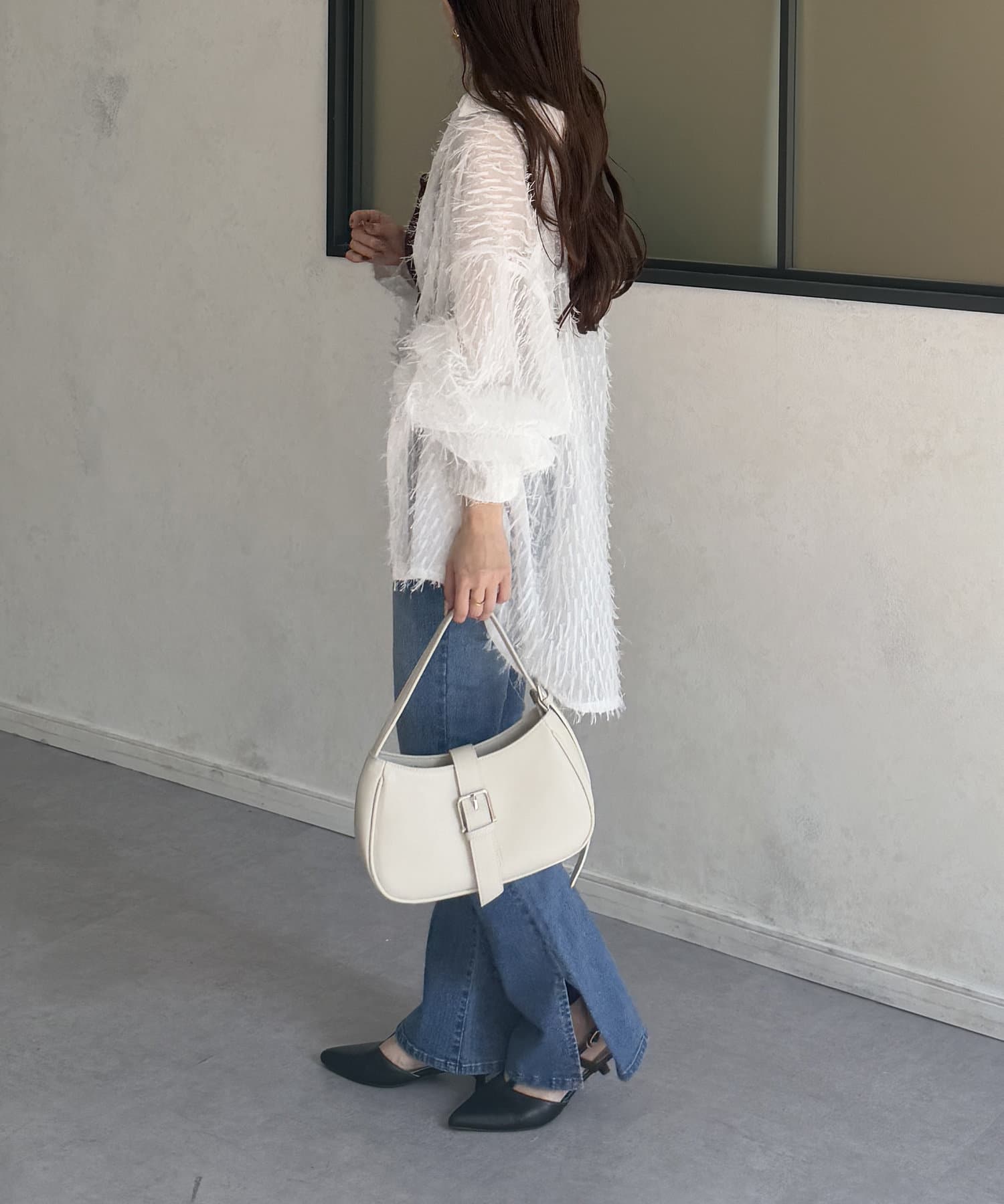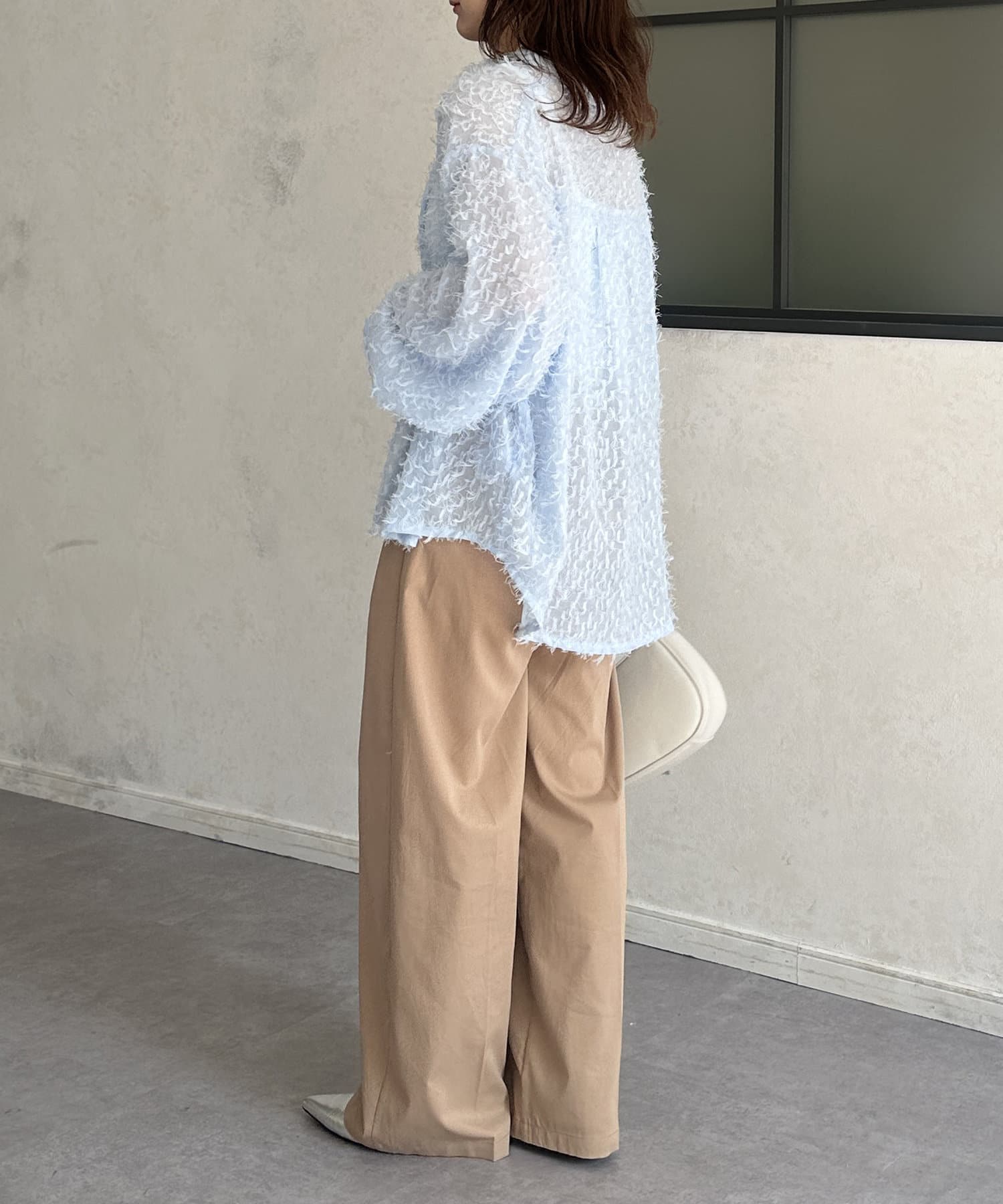 ・着映えするシアーフリンジ素材には、シンプルなスラックスやデニムとの合わせがおすすめです。