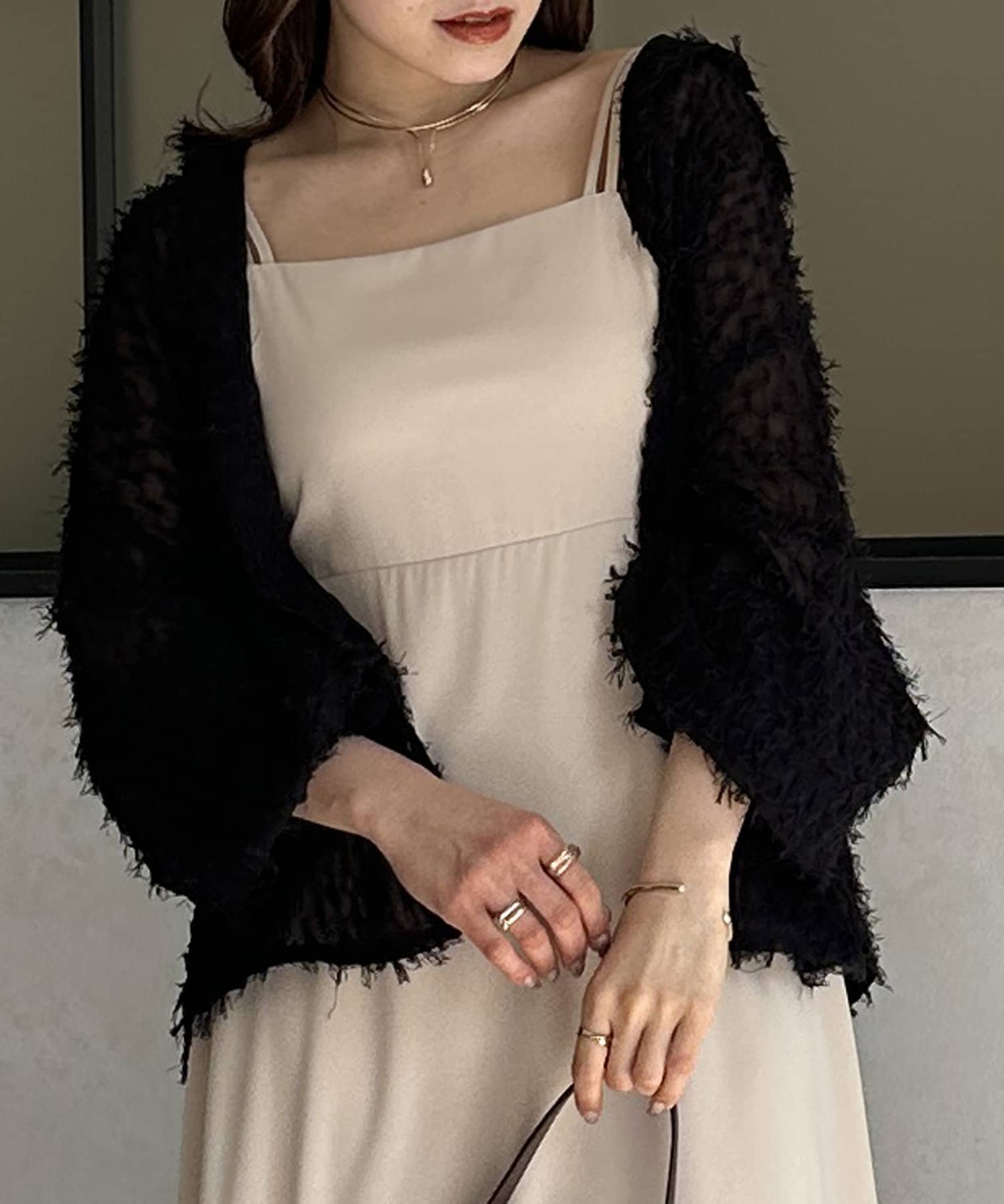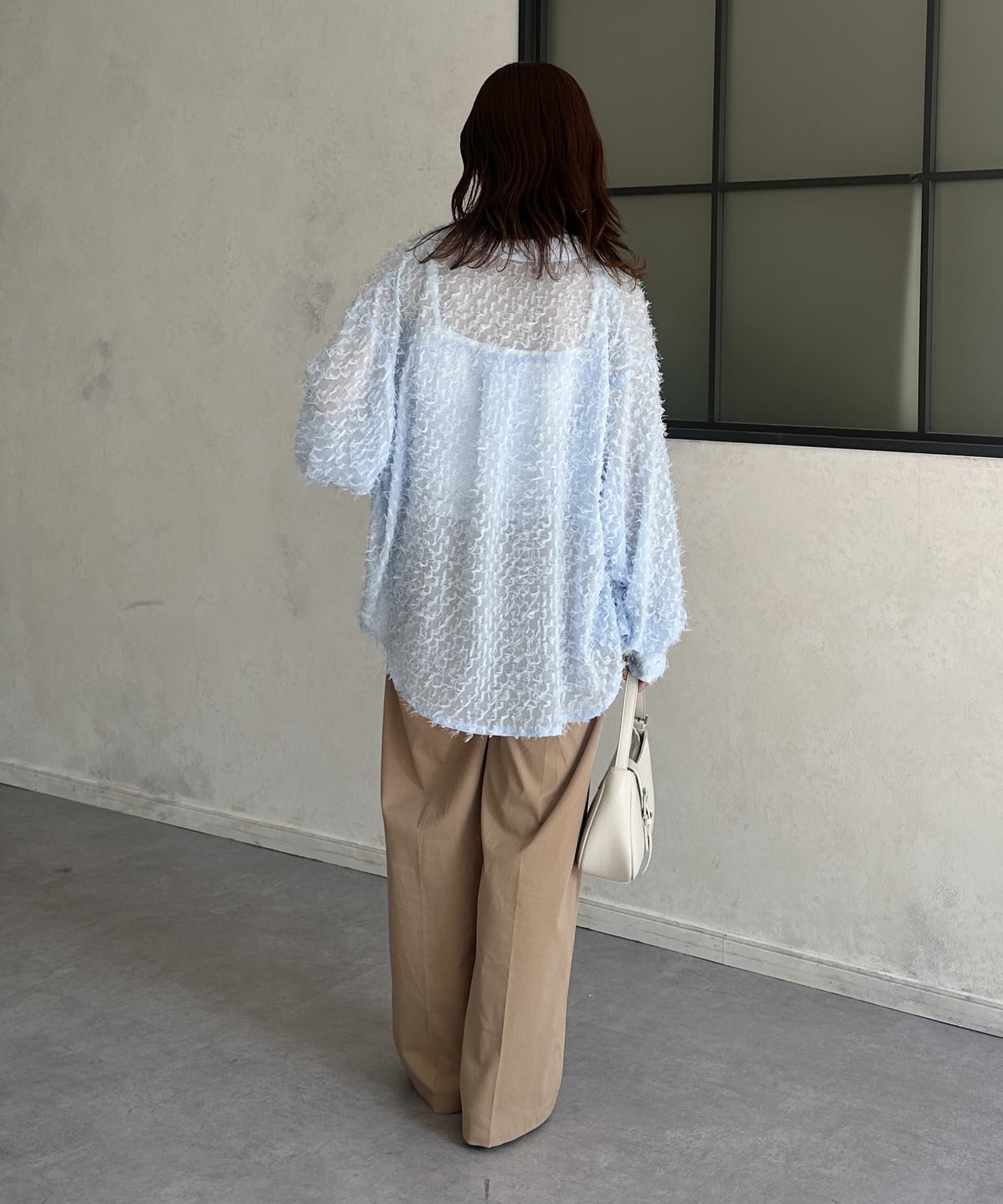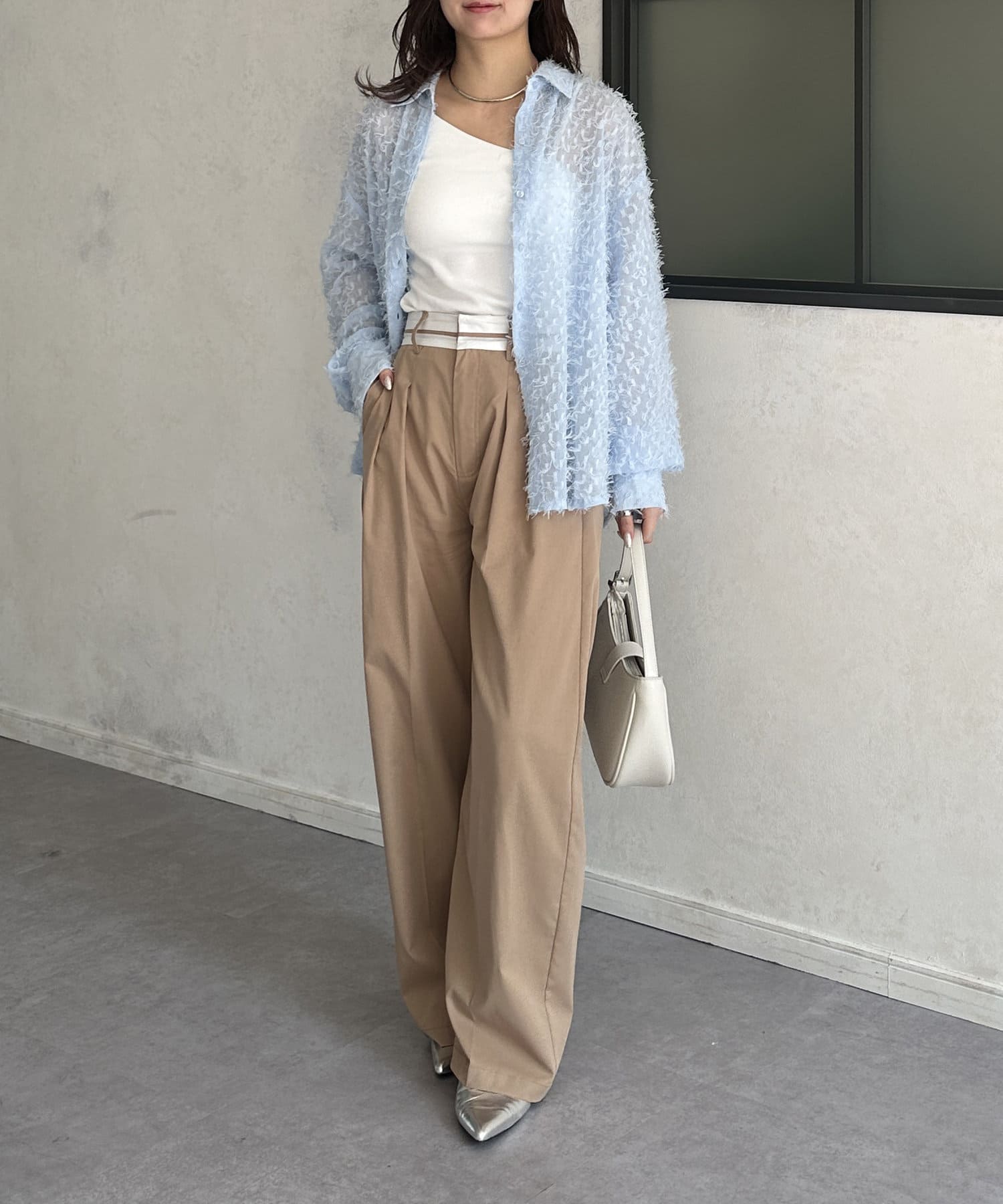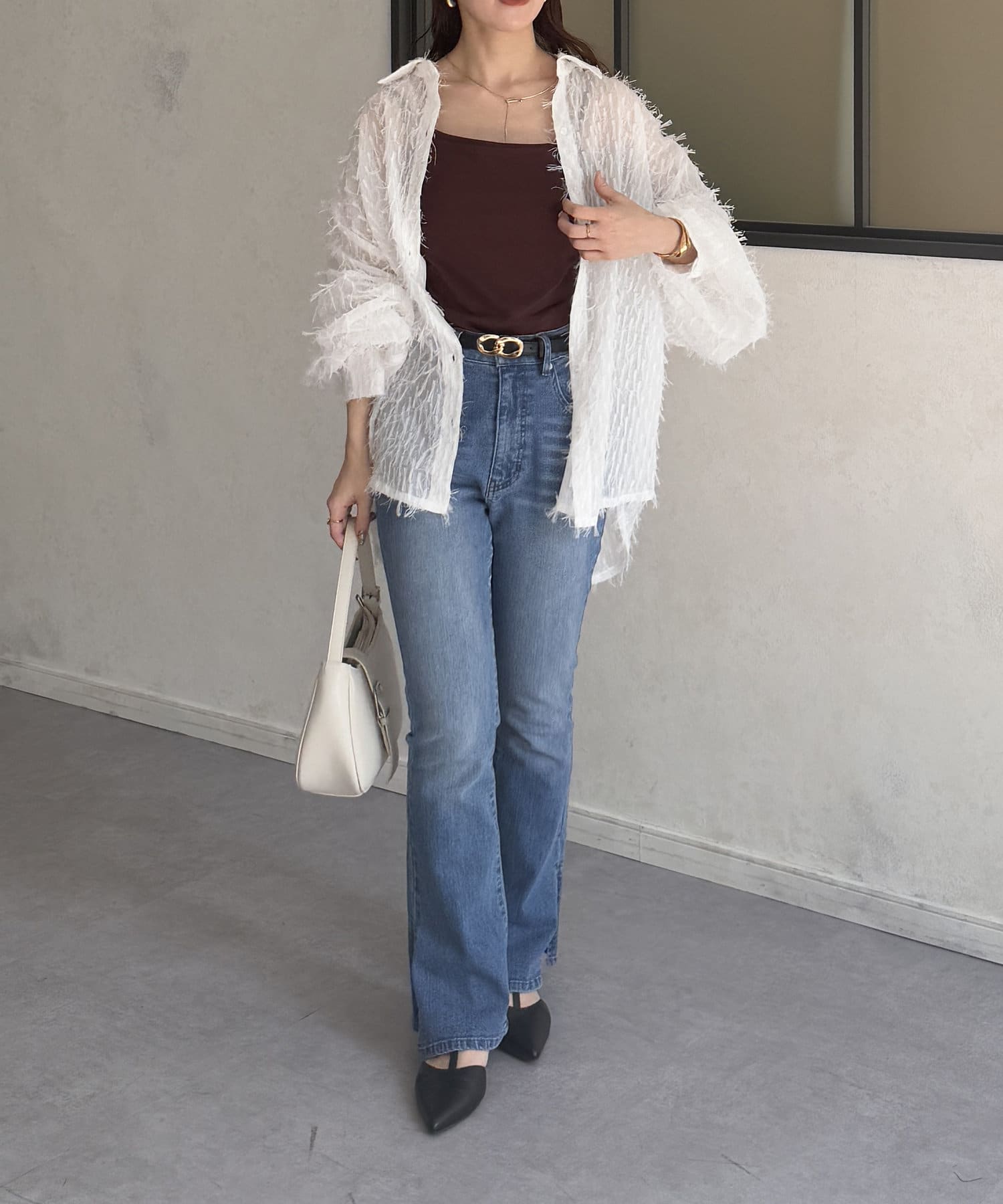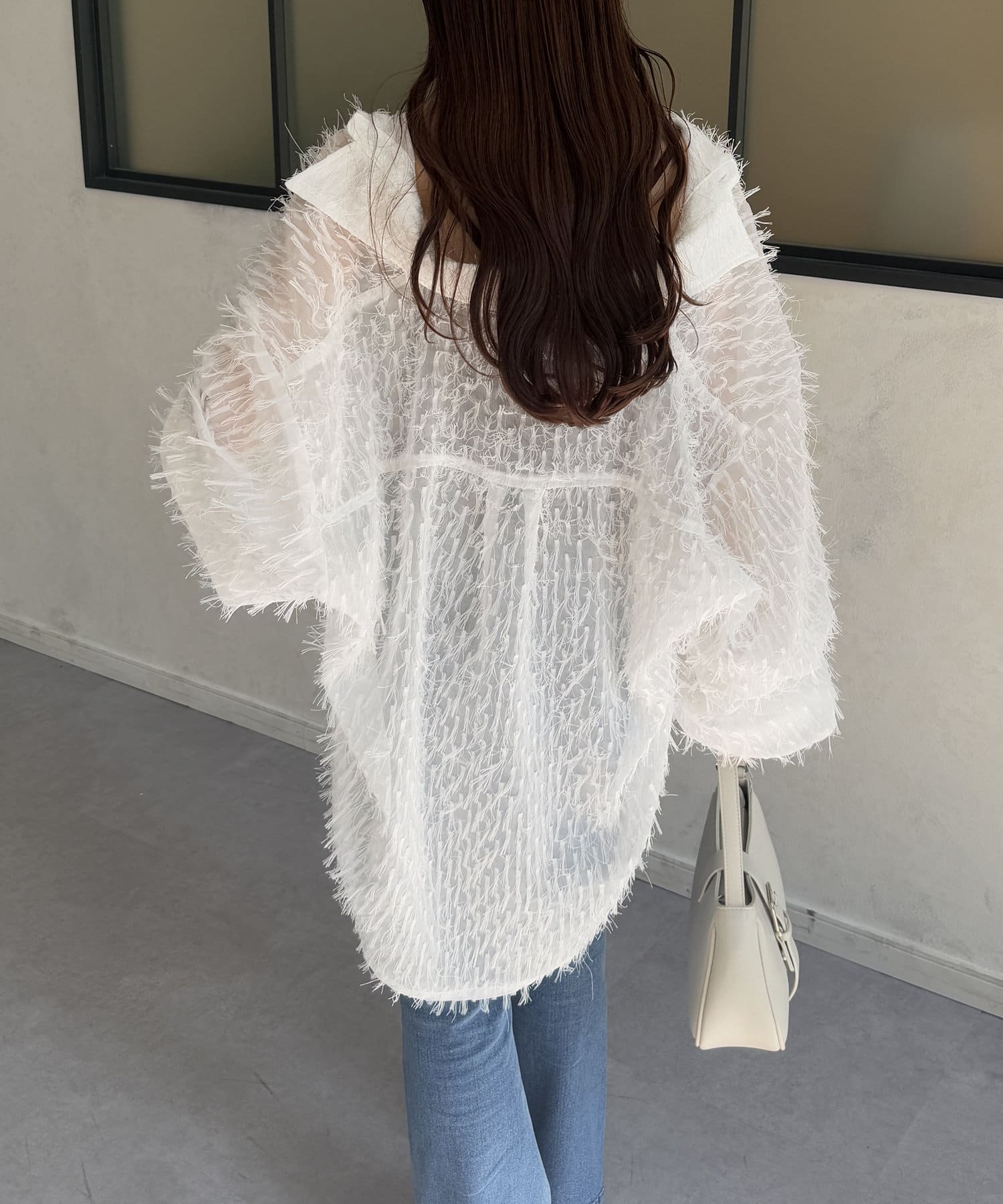 ・着映えするシアーフリンジ素材には、シンプルなスラックスやデニムとの合わせがおすすめです。