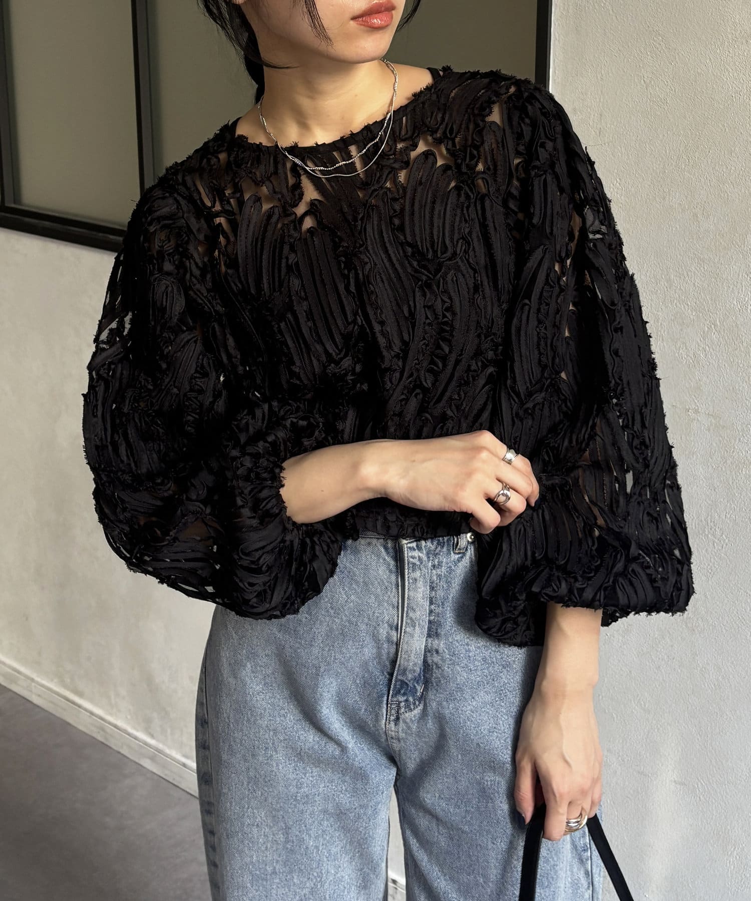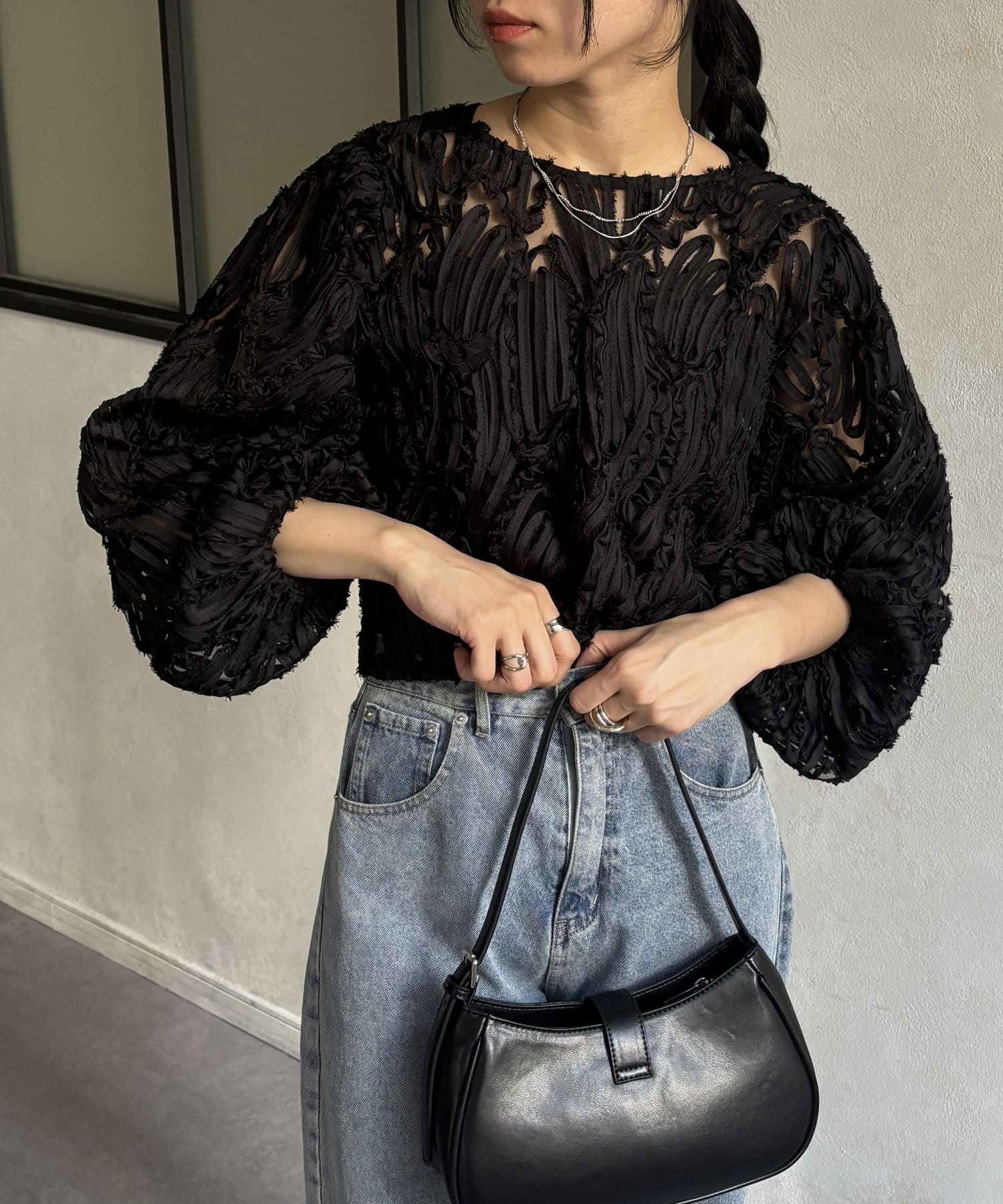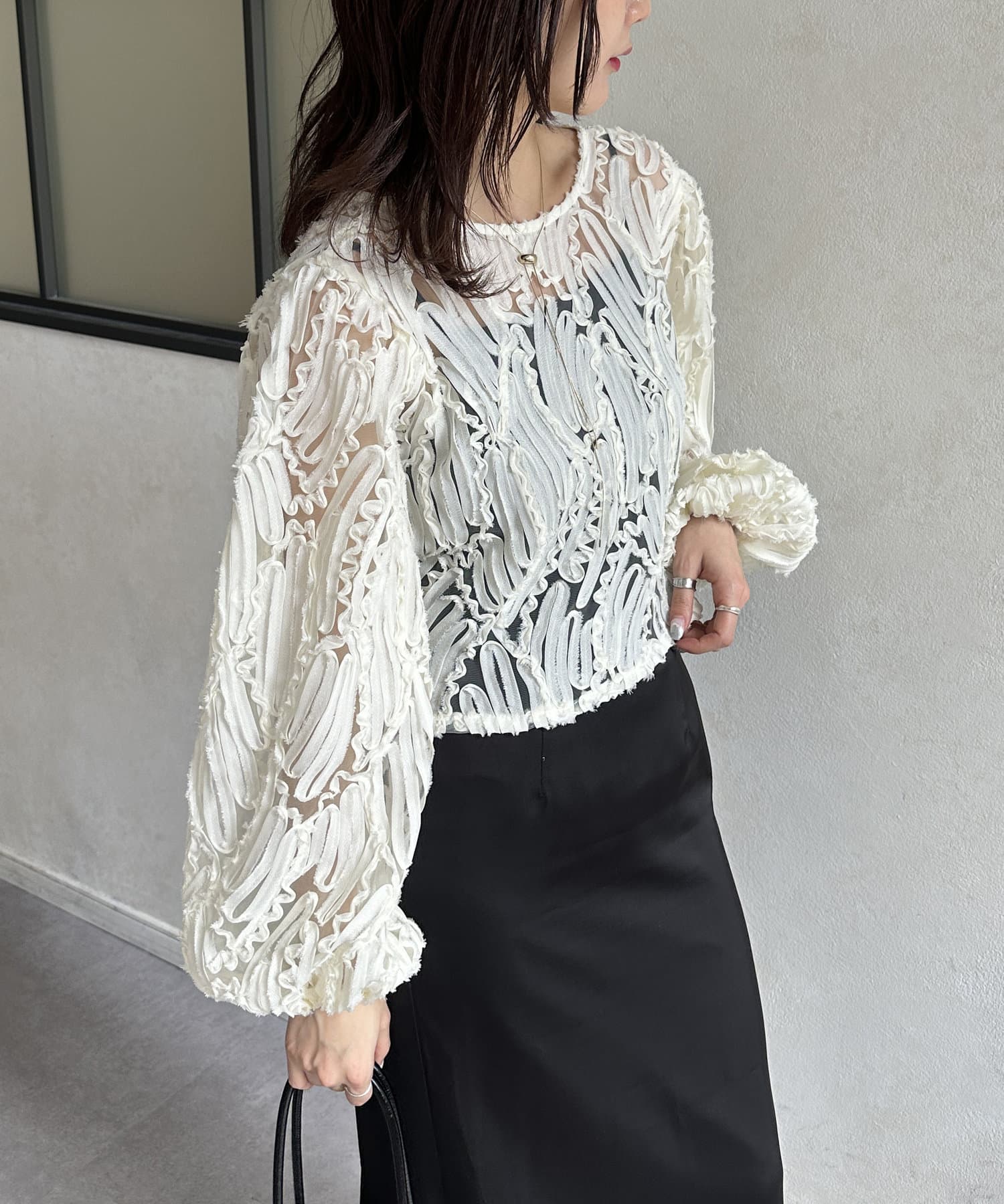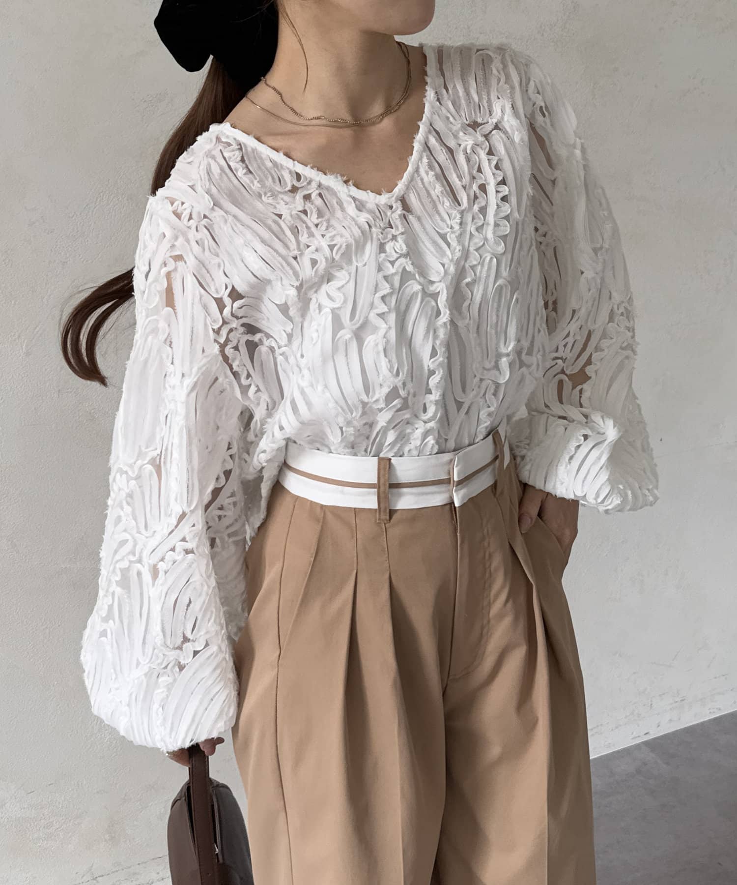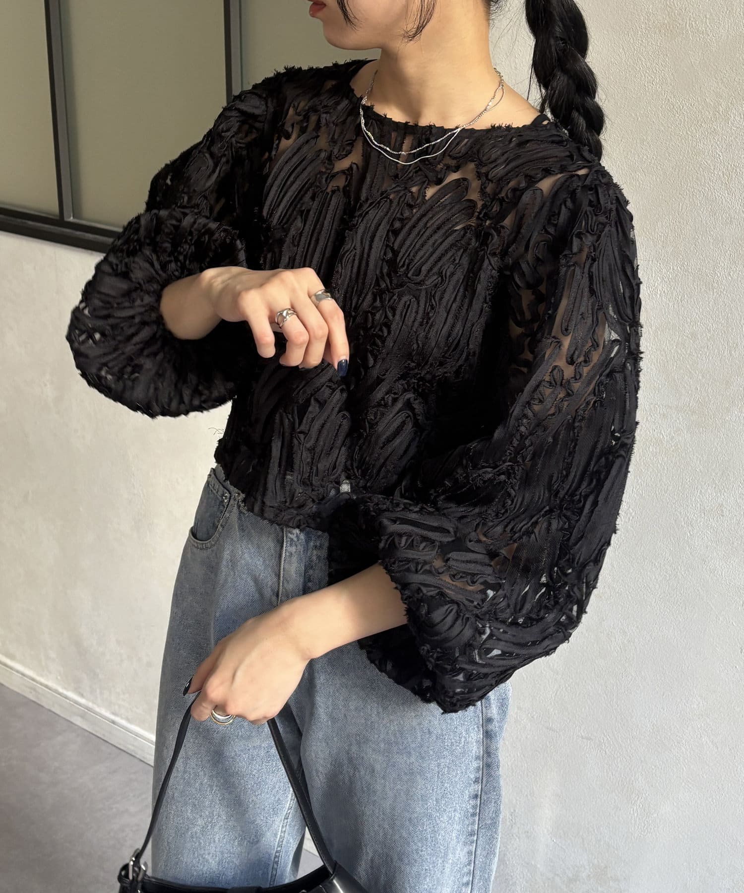 ・キャミソールやタンクトップをインナーに合わせて、透け感を楽しめるアイテムです。