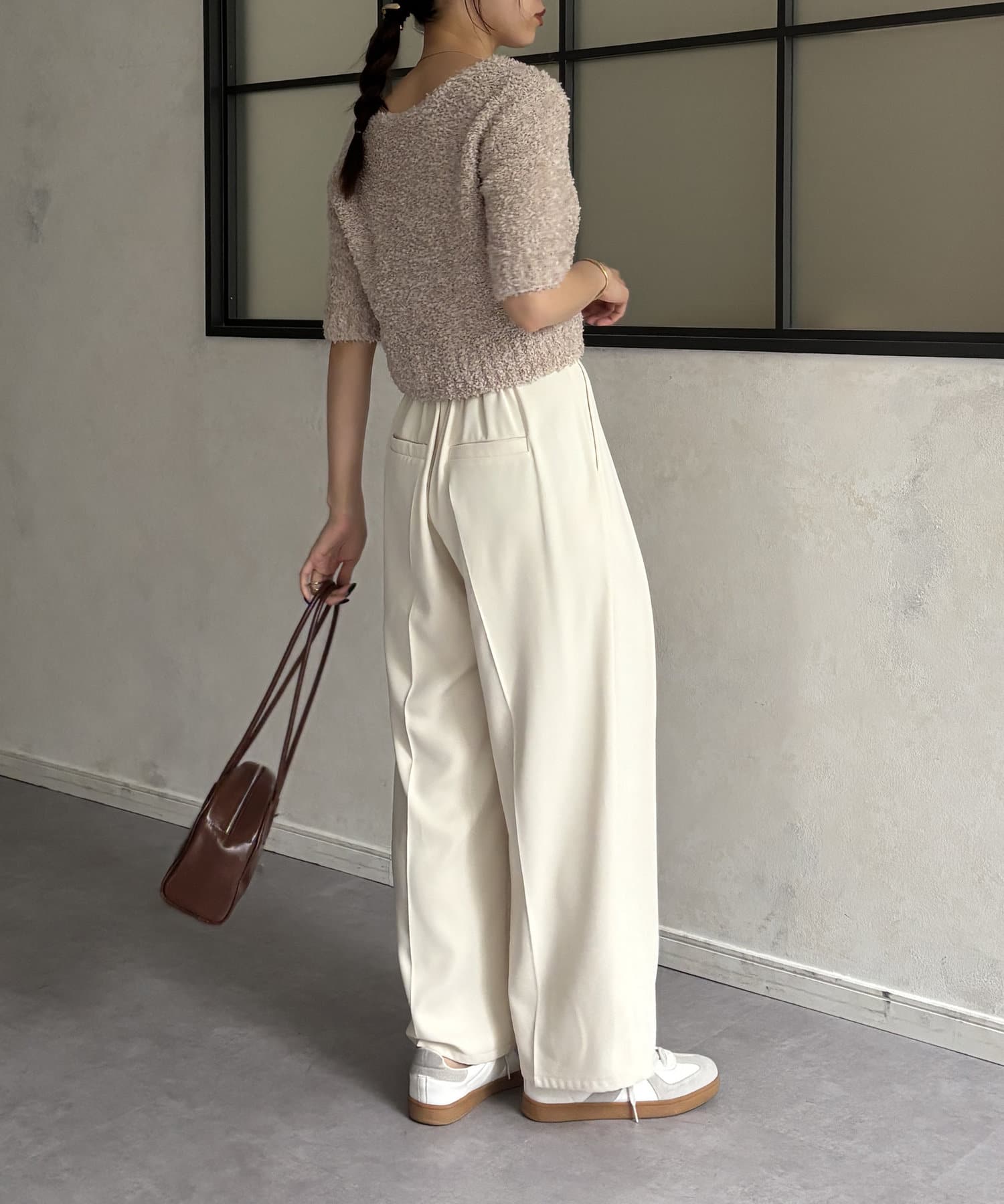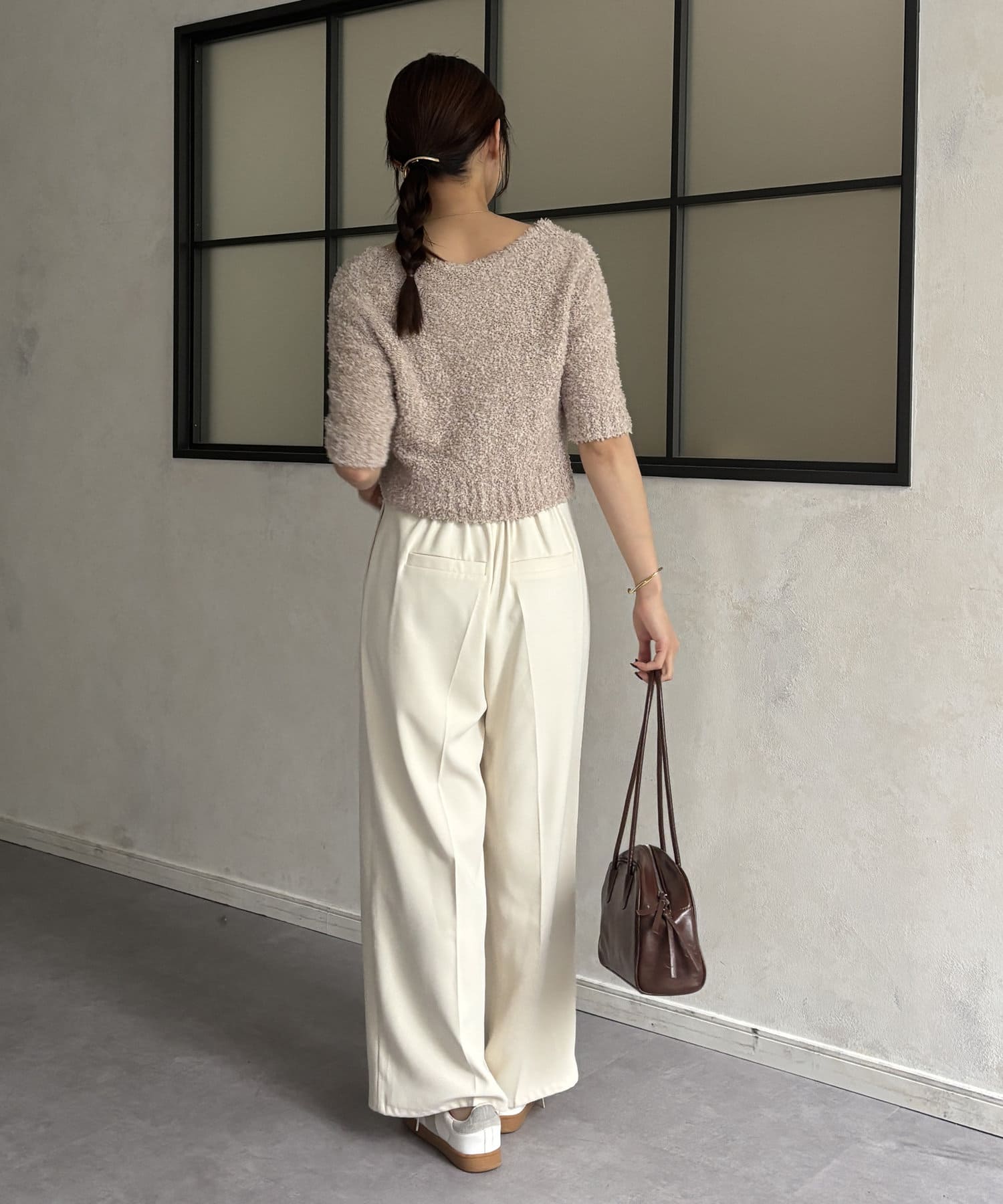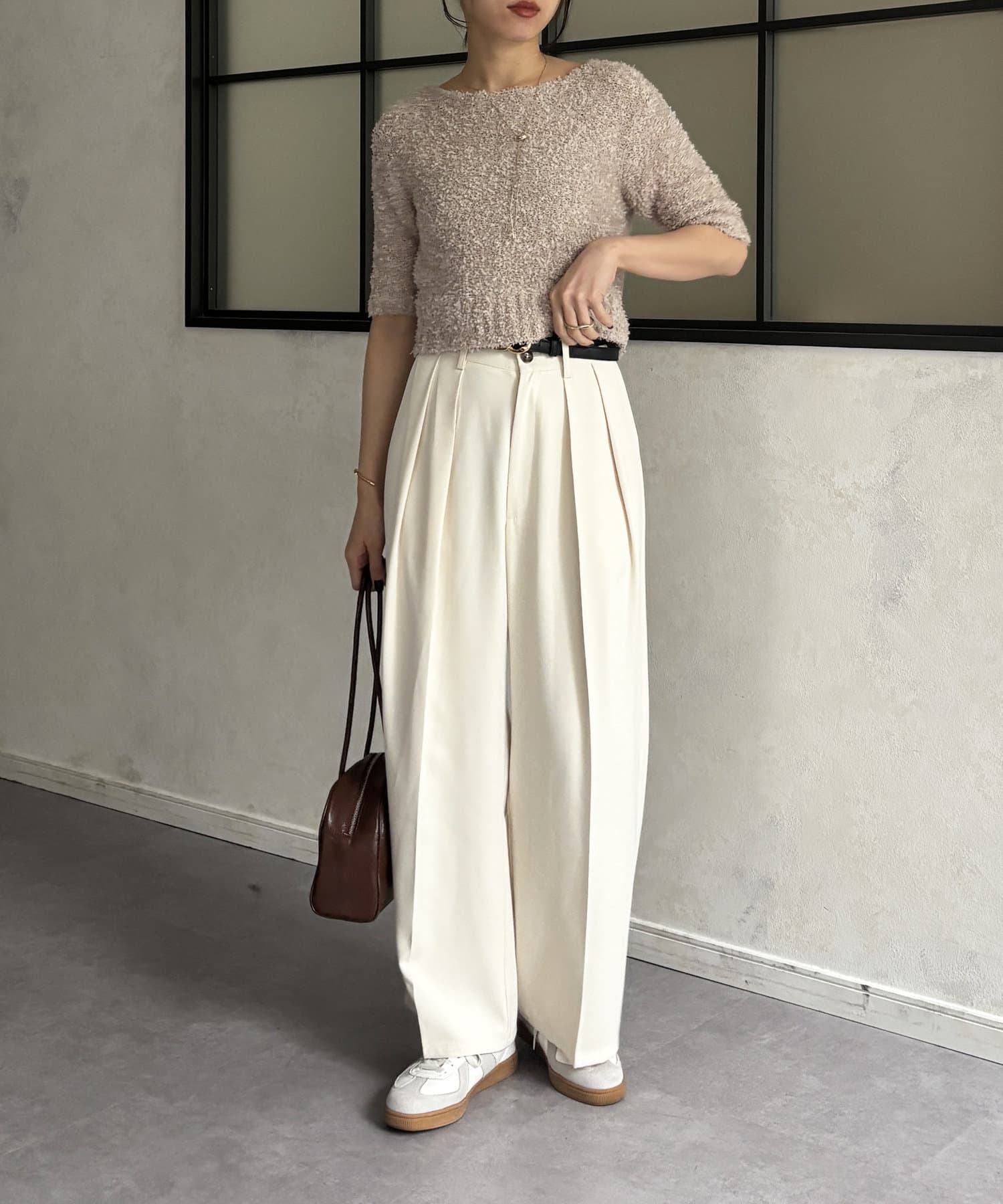 ・短めの丈なので、ハイウエストのパンツやスカート、ワイドパンツとの合わせがおすすめです。