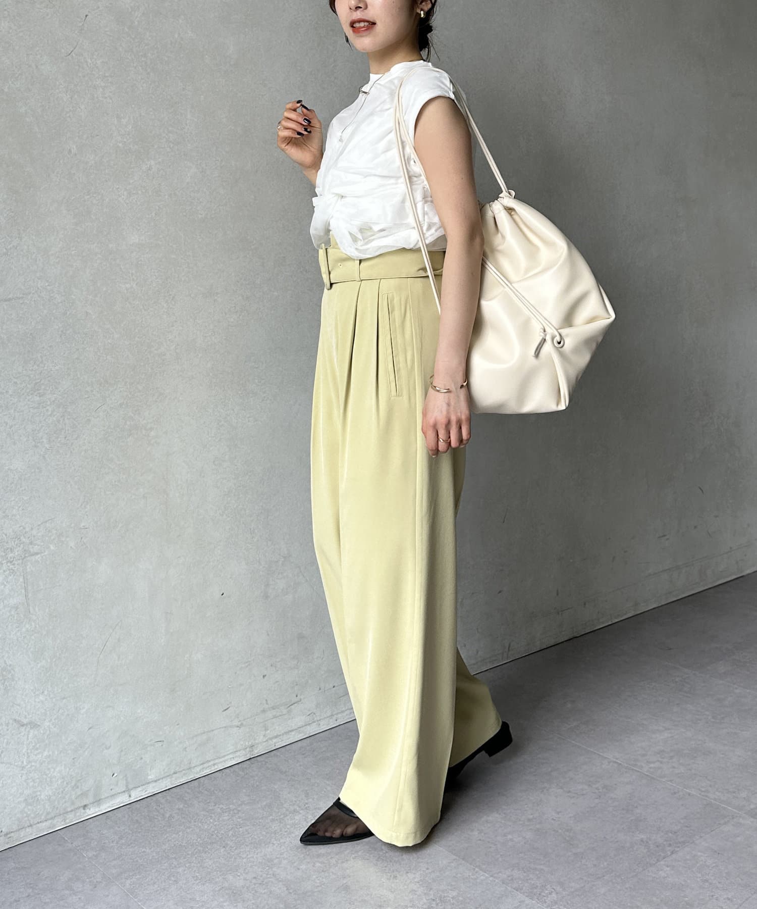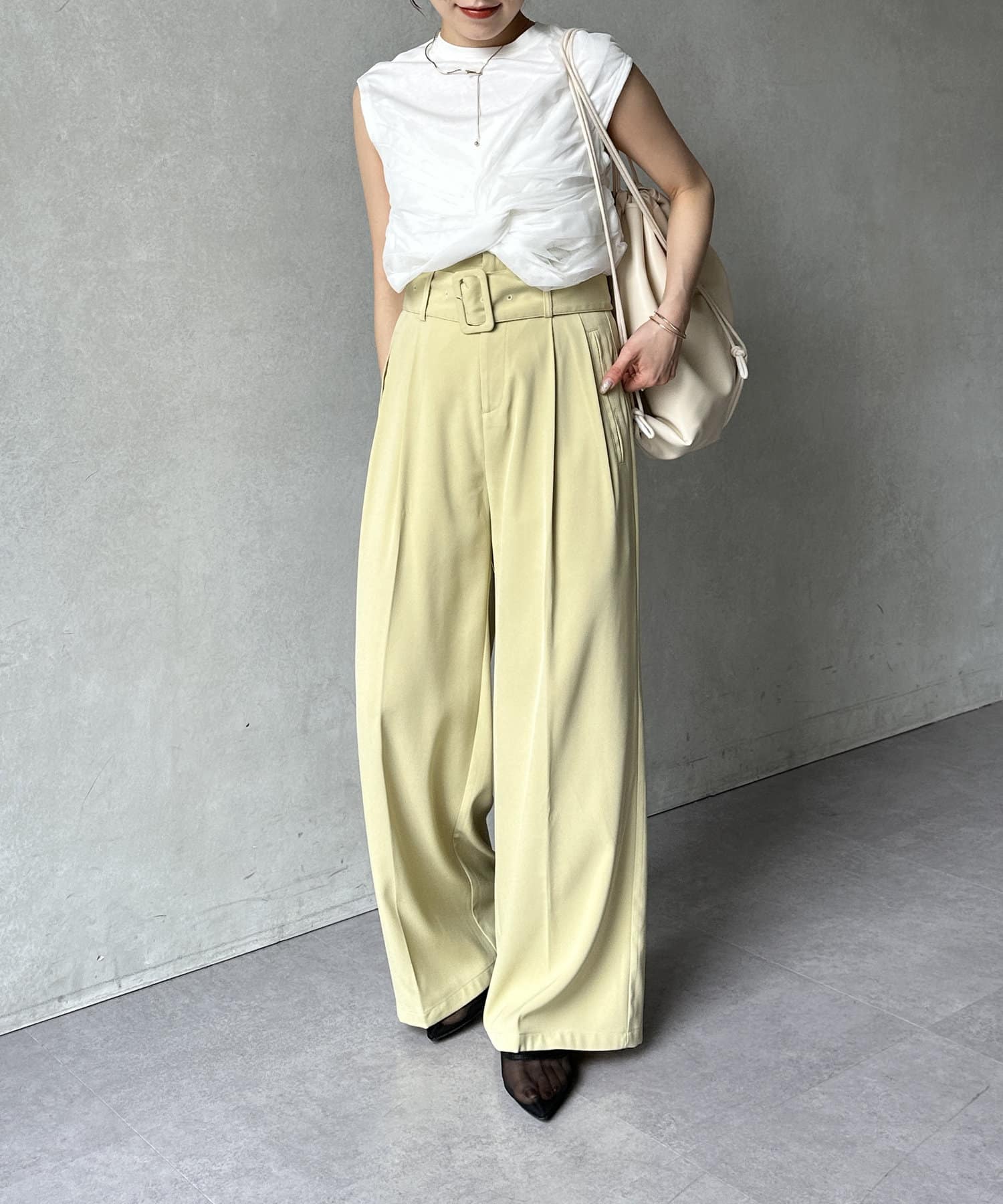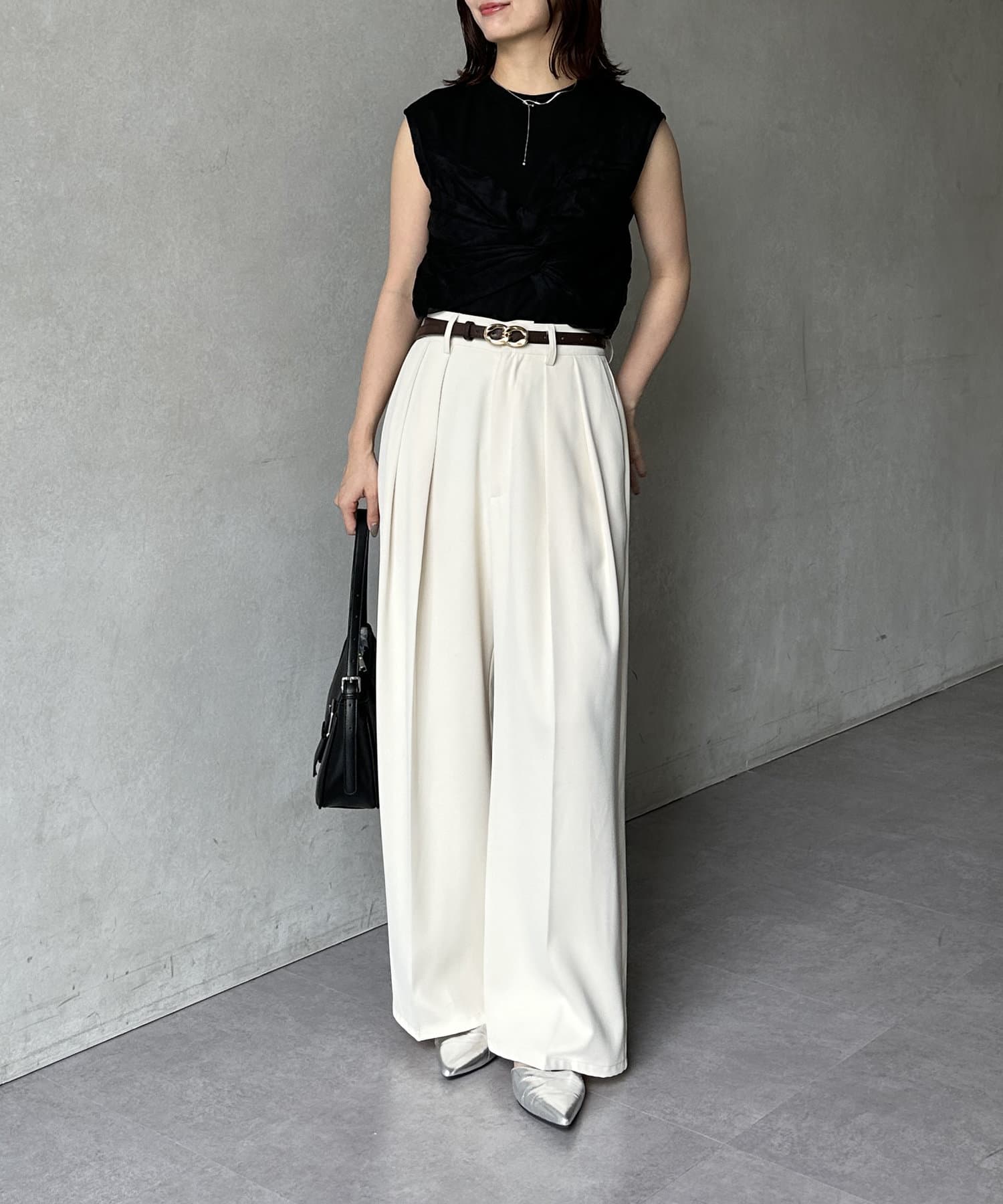 パンツにアクセントをプラスしたスタイリングも楽しめます。